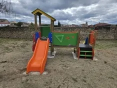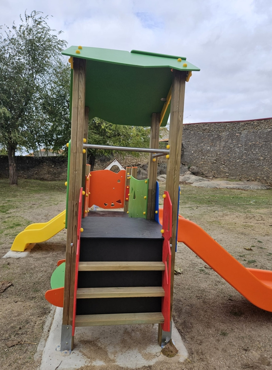 La nueva dotación instalada por el Ayuntamiento de Lumbrales consiste en una estructura compacta y multifuncional. El parque incluye una pequeña caseta dotada de tejado, que se conecta a través de un puente con una plataforma desde la que descienden dos pequeños toboganes, uno por cada lado del parque.