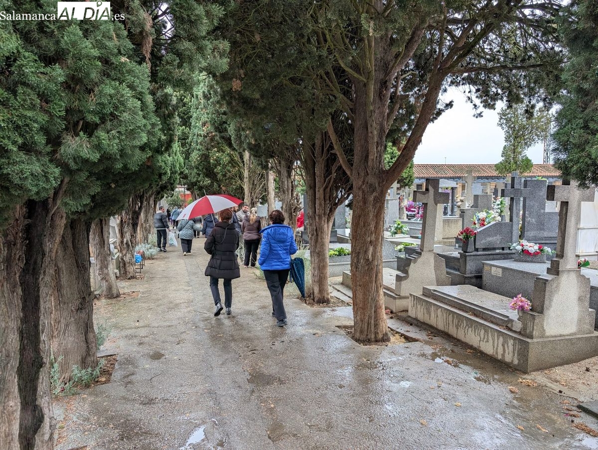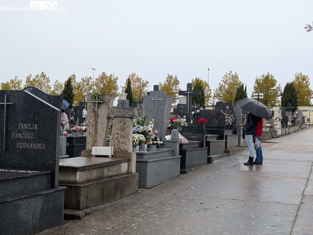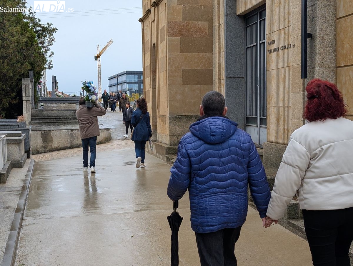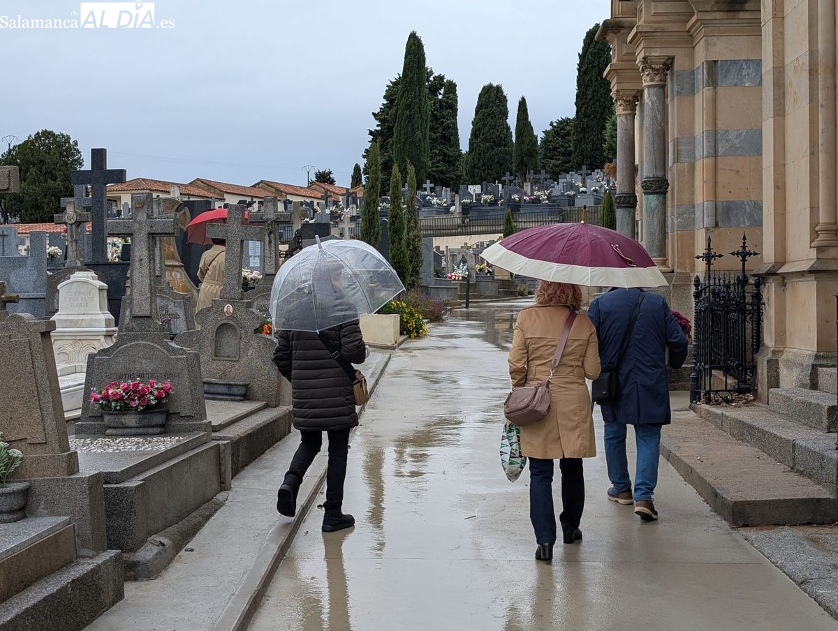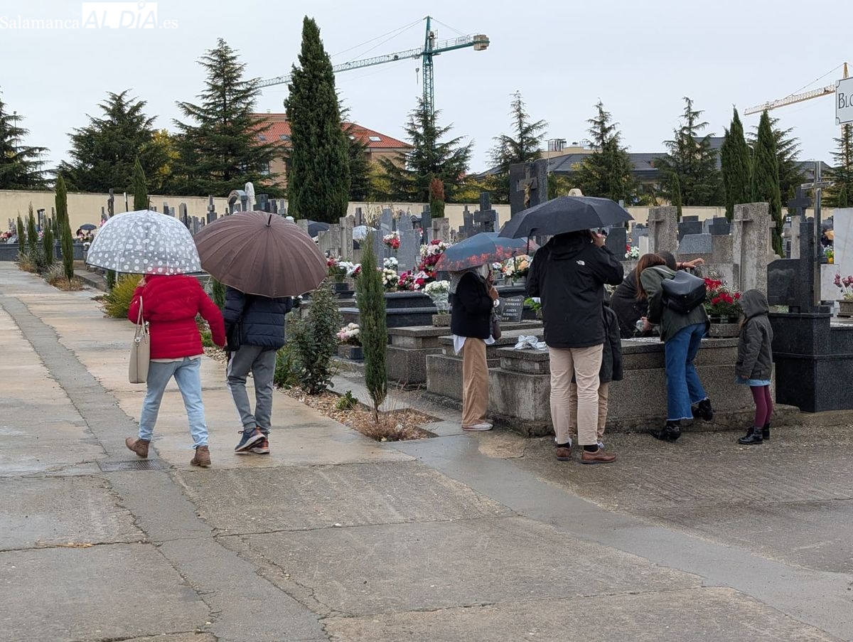 El cementerio de San Carlos Borromeo presenta este sábado una estampa más tranquila de lo habitual en la festividad de Todos los Santos. A pesar de la persistente lluvia que cae sobre Salamanca desde primera hora, la tradición de honrar a los difuntos se ha impuesto y han sido numerosos los salmantinos que se han acercado para depositar flores en las tumbas y panteones de sus seres queridos.