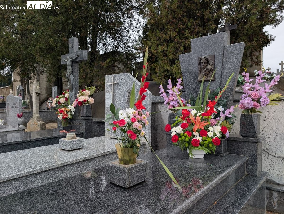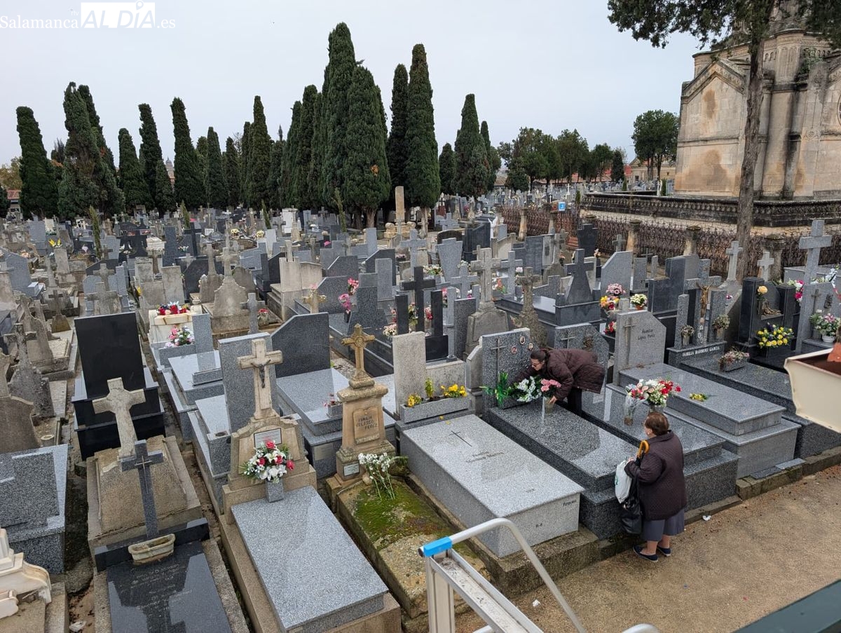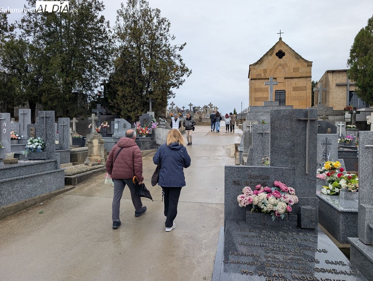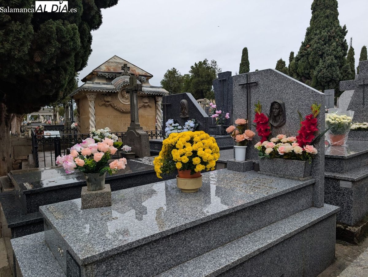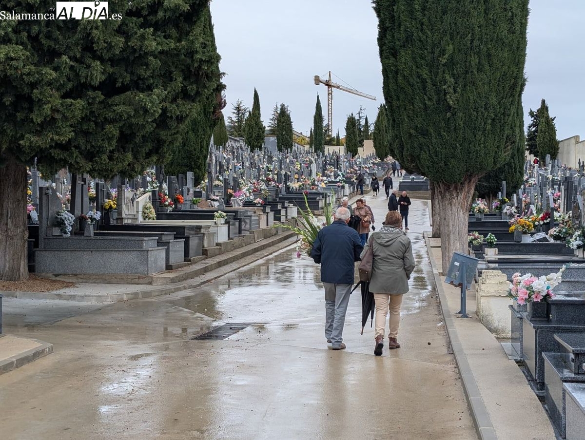 El cementerio de San Carlos Borromeo presenta este sábado una estampa más tranquila de lo habitual en la festividad de Todos los Santos. A pesar de la persistente lluvia que cae sobre Salamanca desde primera hora, la tradición de honrar a los difuntos se ha impuesto y han sido numerosos los salmantinos que se han acercado para depositar flores en las tumbas y panteones de sus seres queridos.