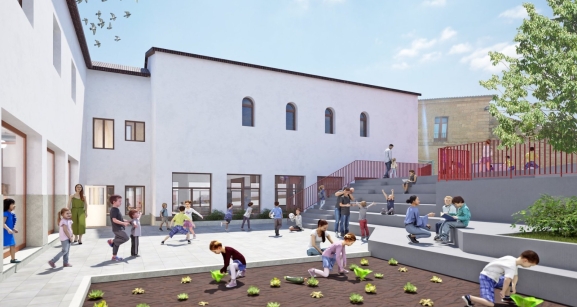 Oiga Estudio ha dado a conocer que ya ha entregado el proyecto básico de rehabilitación a la Junta, desvelando una primera imagen de su diseño, que incluye la conversión del patio del edificio en un aula exterior con huerto (tal y como se planteaba en los pliegos). Asimismo, en ese patio se habilitará un graderío, que salvará la diferencia de nivel existente entre la pista deportiva y el acceso. Estas partes estarán en la zona del CRIE que será compartido con la Escuela-Hogar que seguirá funcionando en el inmueble.