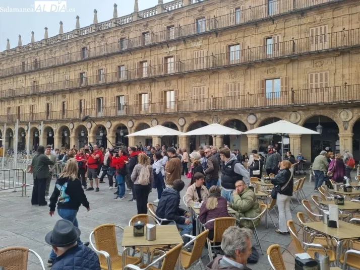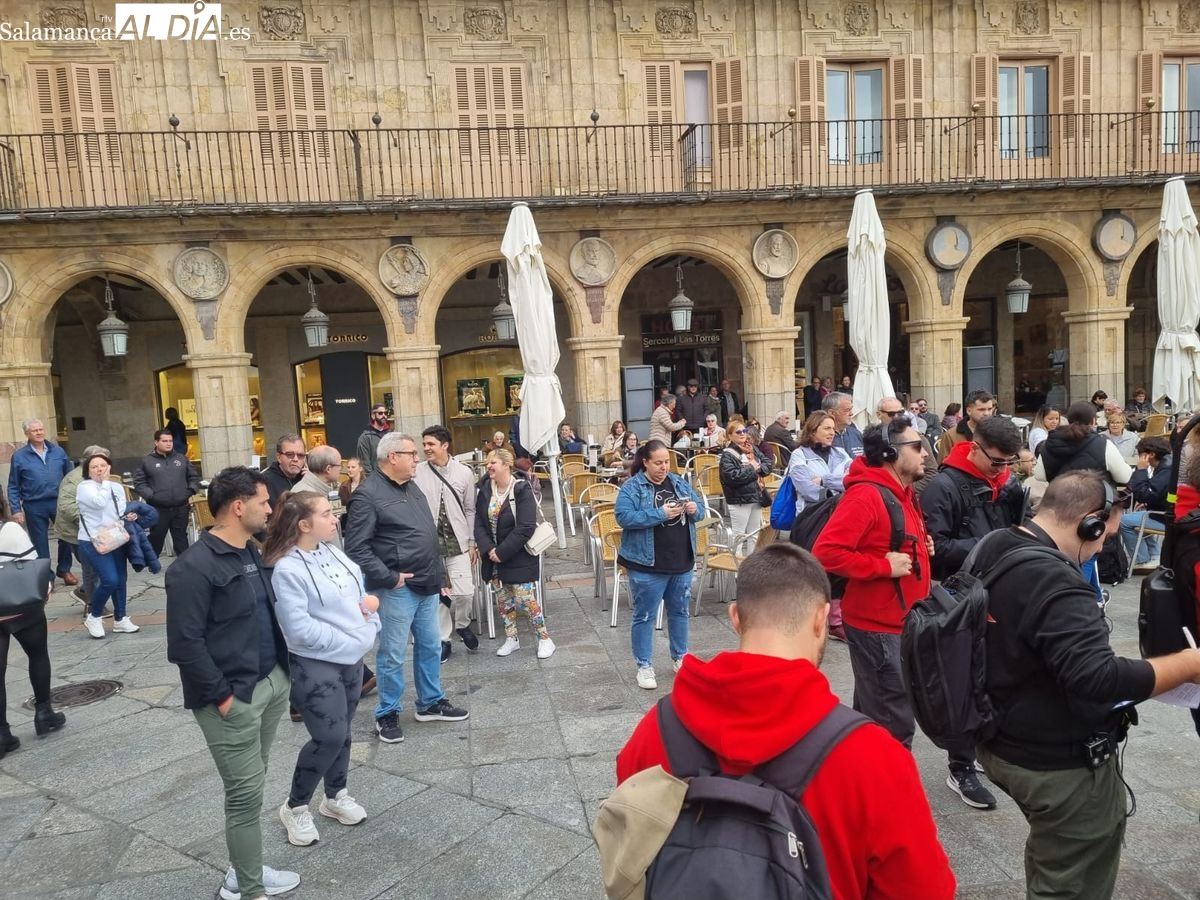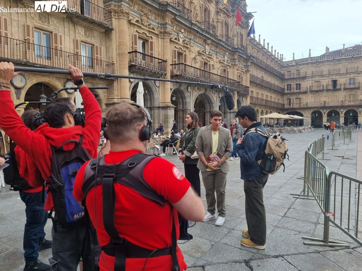 La presencia de las cámaras y el equipo de producción ha congregado a decenas de curiosos en la Plaza Mayor. La grabación de este martes corresponde a la segunda de las tres jornadas que el programa tiene previsto realizar en Salamanca, tal como se anunció este lunes.