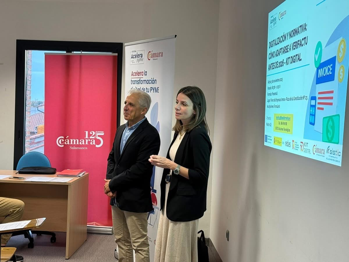 La Cámara de Comercio, a través de la Oficina Acelera Pyme, organizó la jornada formativa “Digitalización y normativa: cómo adaptarse a VeriFactu antes de 2026”, un encuentro en el que empresas y profesionales se reunieron en el Vivero de Empresas Innova de Peñaranda para conocer los detalles del nuevo sistema de emisión y comunicación de facturas con la Agencia Tributaria.