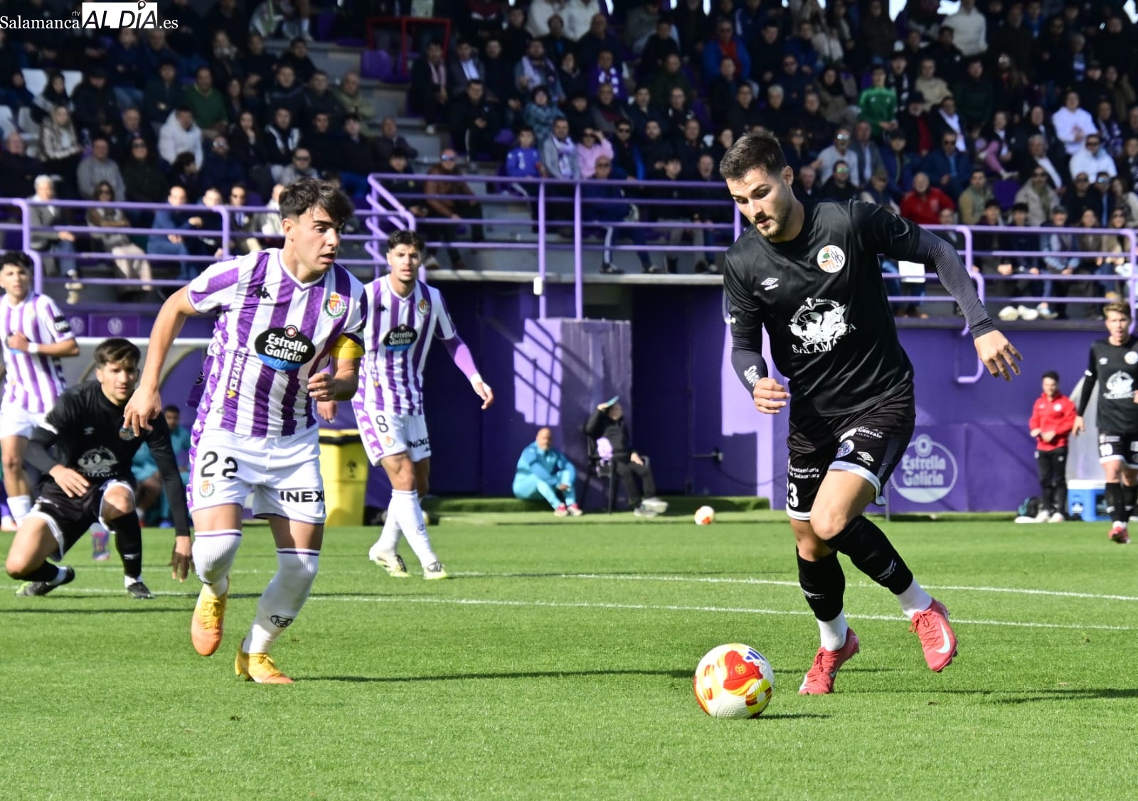 En una jugada bien trenzada por parte del Valladolid Promesas, Porras se ha plantado solo ante Leo Mendes, que se ha lanzado como un felino a por el balón y ha podido cometer un penalti que el árbitro ha decidido no señalar. Se ha salvado el Salamanca UDS, que en la acción posterior ha tratato de adelantarse por medio de Javi Delgado, que se ha topado de bruces con una parada de Álvaro.