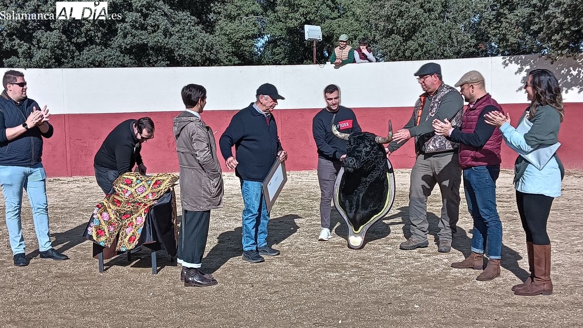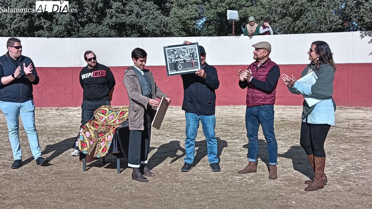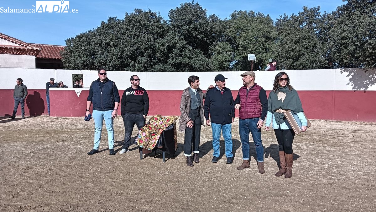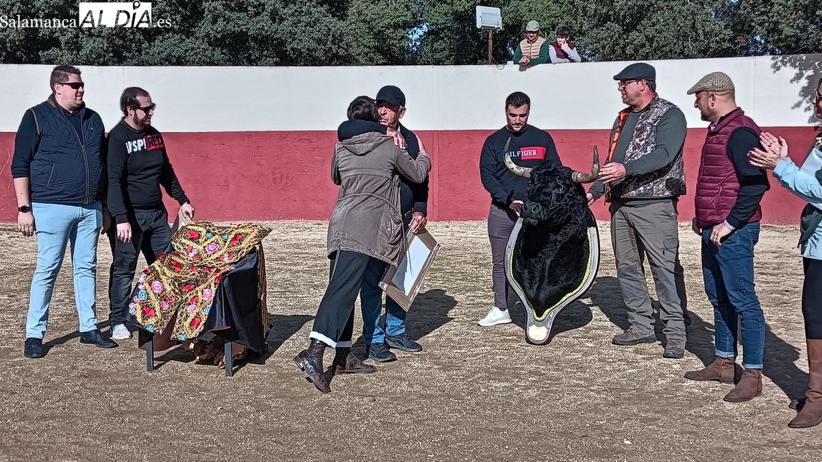 La jornada dio comienzo con un intercambio de obsequios entre la peña, el torero y el ganadero. La peña taurina hizo entrega al torero de un precioso capote de paseo, mientras que el propio torero tuvo un detalle precioso con un emocionado Pepe Valrubio. Ismael Martín le regaló la cabeza del toro 'Gincanillo', de la ganadería de Vellosino, que le brindó en La Glorieta el pasado 13 de septiembre y al que le cortó las dos orejas tras una gran faena. Además, el 'pack' se completó con dos fotografías del momento del brindis. Por su parte, Ismael Martín fue obsequiado por parte de la ganadería con un botijo ilustrado con varias pinturas basadas en sus faenas en la pasada Feria de Salamanca.