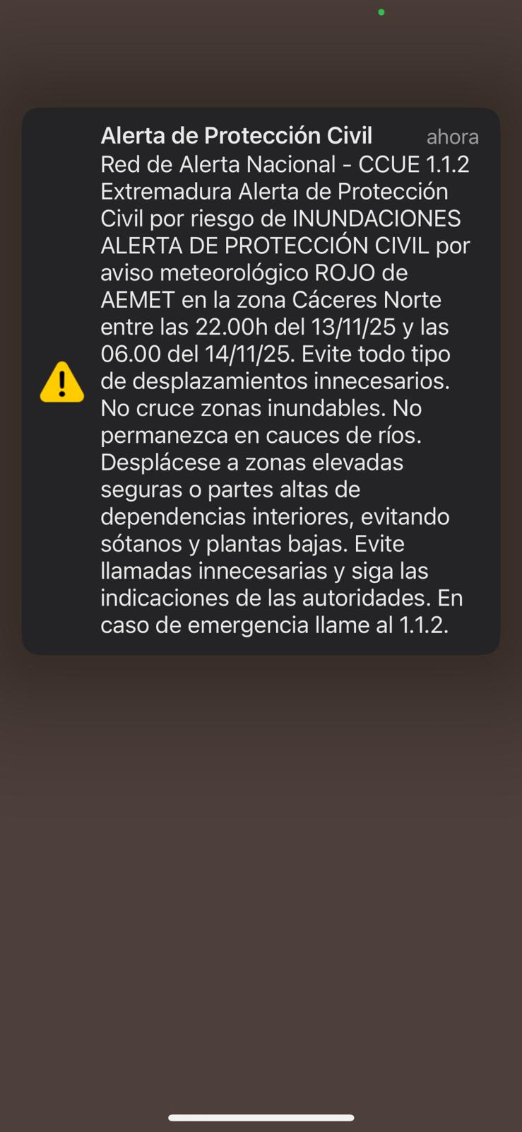 La zona norte de Extremadura está en alerta roja, por la cual, sus habitantes han recibido en sus dispositivos móviles una alarma de emergencia.