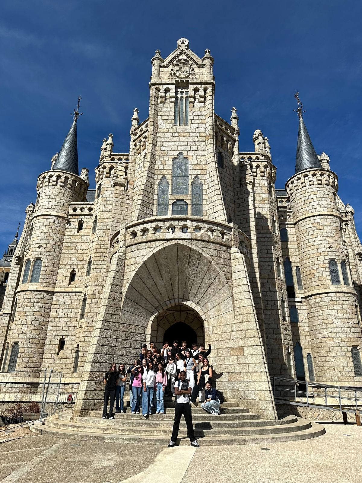 A continuación, el grupo se dirigió al Palacio Episcopal de Gaudí, una de las obras más singulares del arquitecto catalán. Los estudiantes se mostraron impresionados por la fusión de funcionalidad y fantasía modernista del edificio, con su fachada de piedra gris y sus coloridas vidrieras. Algunos de ellos comentaban que la construcción parecía “un castillo de cuento”.