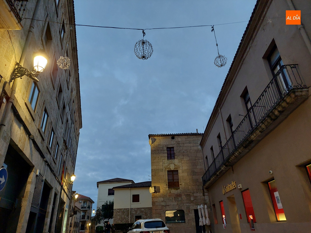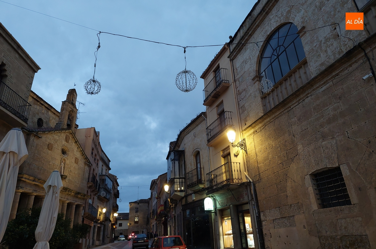 Como es habitual, el punto de partida del montaje de la iluminación fue en pleno corazón de Ciudad Rodrigo, con el despliegue de las habituales cortinas de luces leds por la fachada de la Casa Consistorial, además de colocarse varias esferas lumínicas por la Rúa del Sol (en el tramo entre la Plaza Mayor y la confluencia con la calle Gigantes).