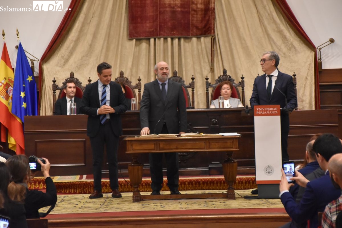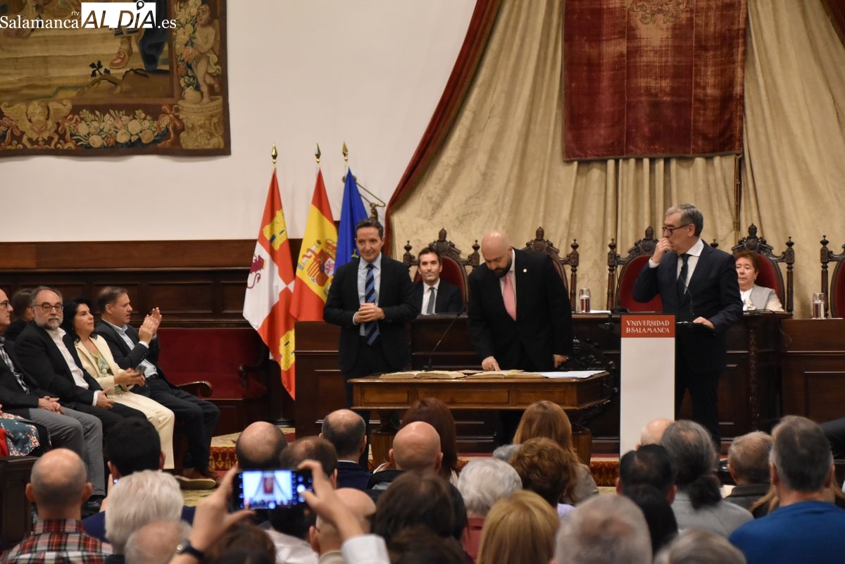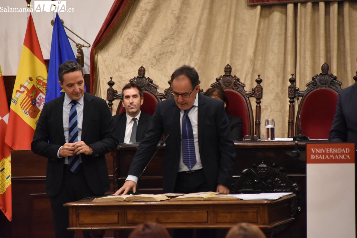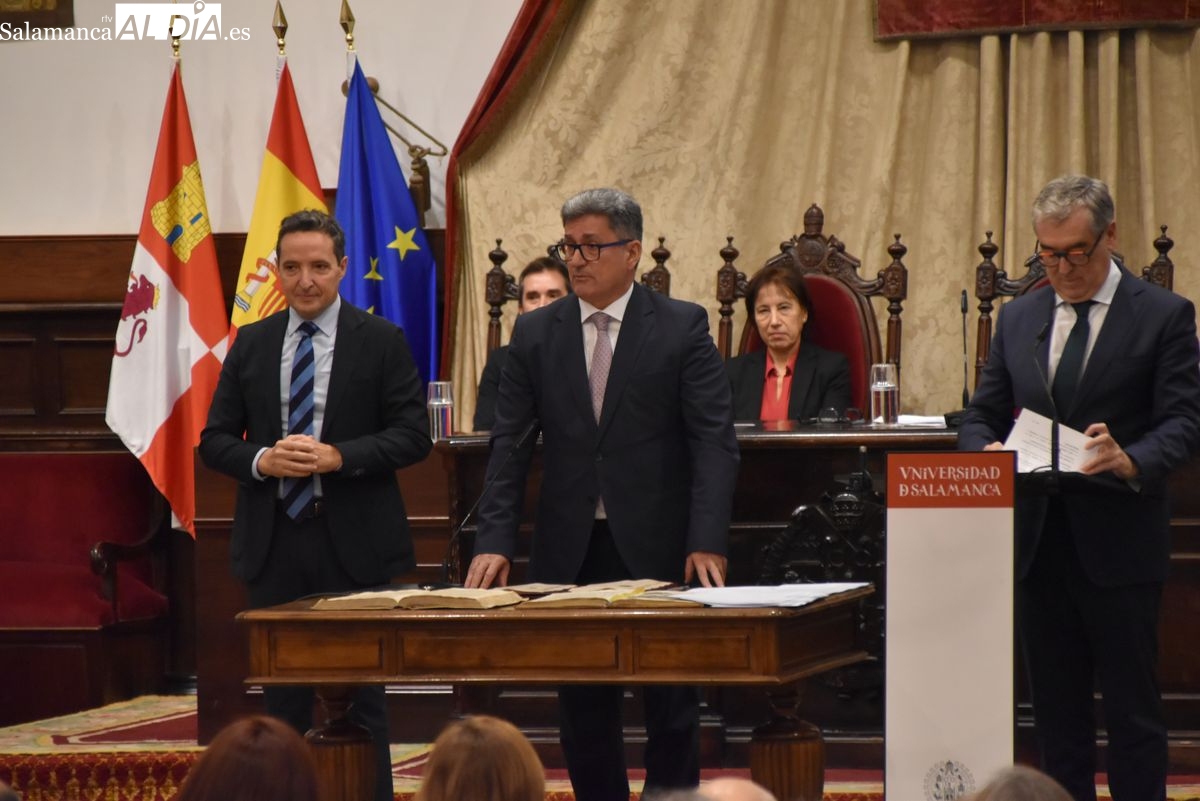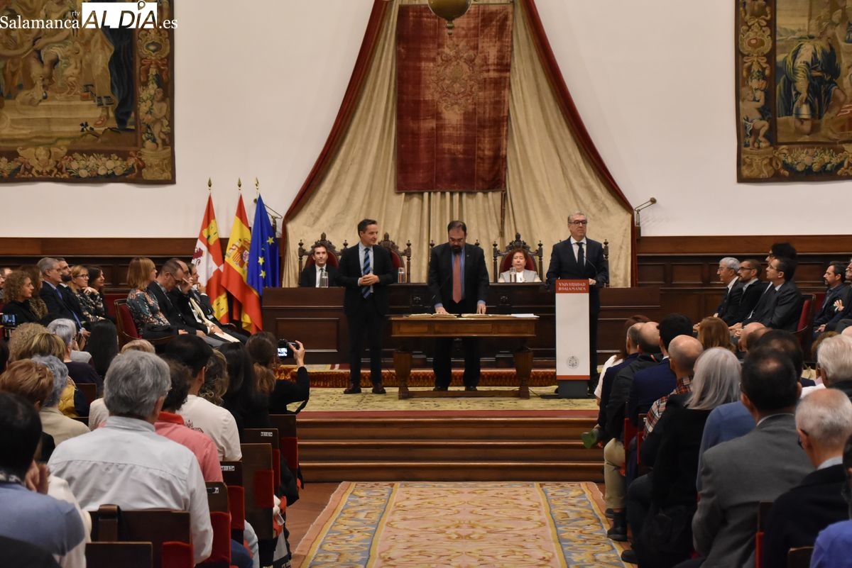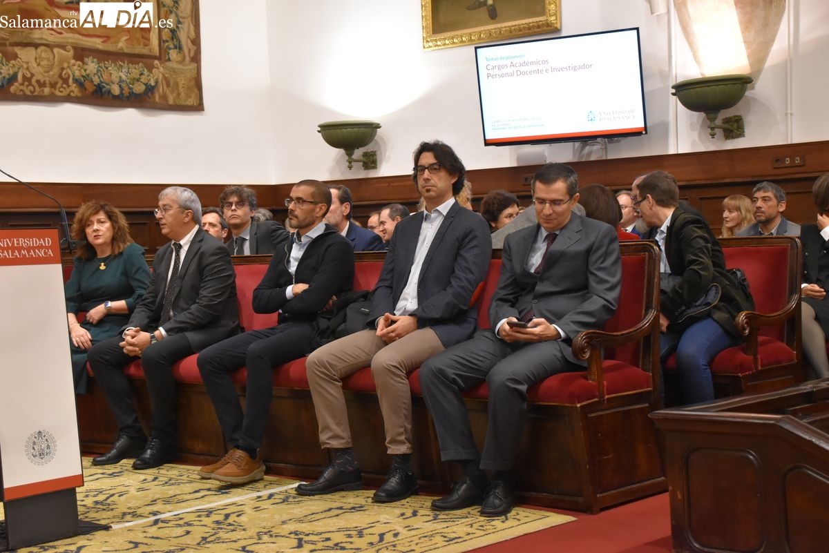 El Paraninfo del edificio de las Escuelas Mayores ha acogido en la mañana de este lunes la renovación de una parte significativa de la estructura académica de la Universidad de Salamanca. El rector, Juan Manuel Corchado, ha presidido el acto en el que asumen sus funciones nuevos decanos, directores de departamento e instituto, y un amplio grupo de catedráticos.