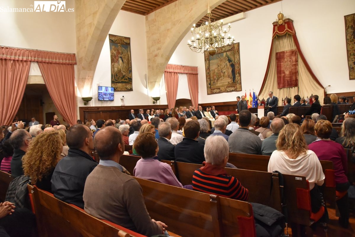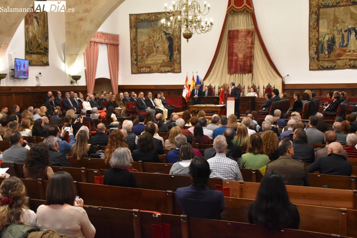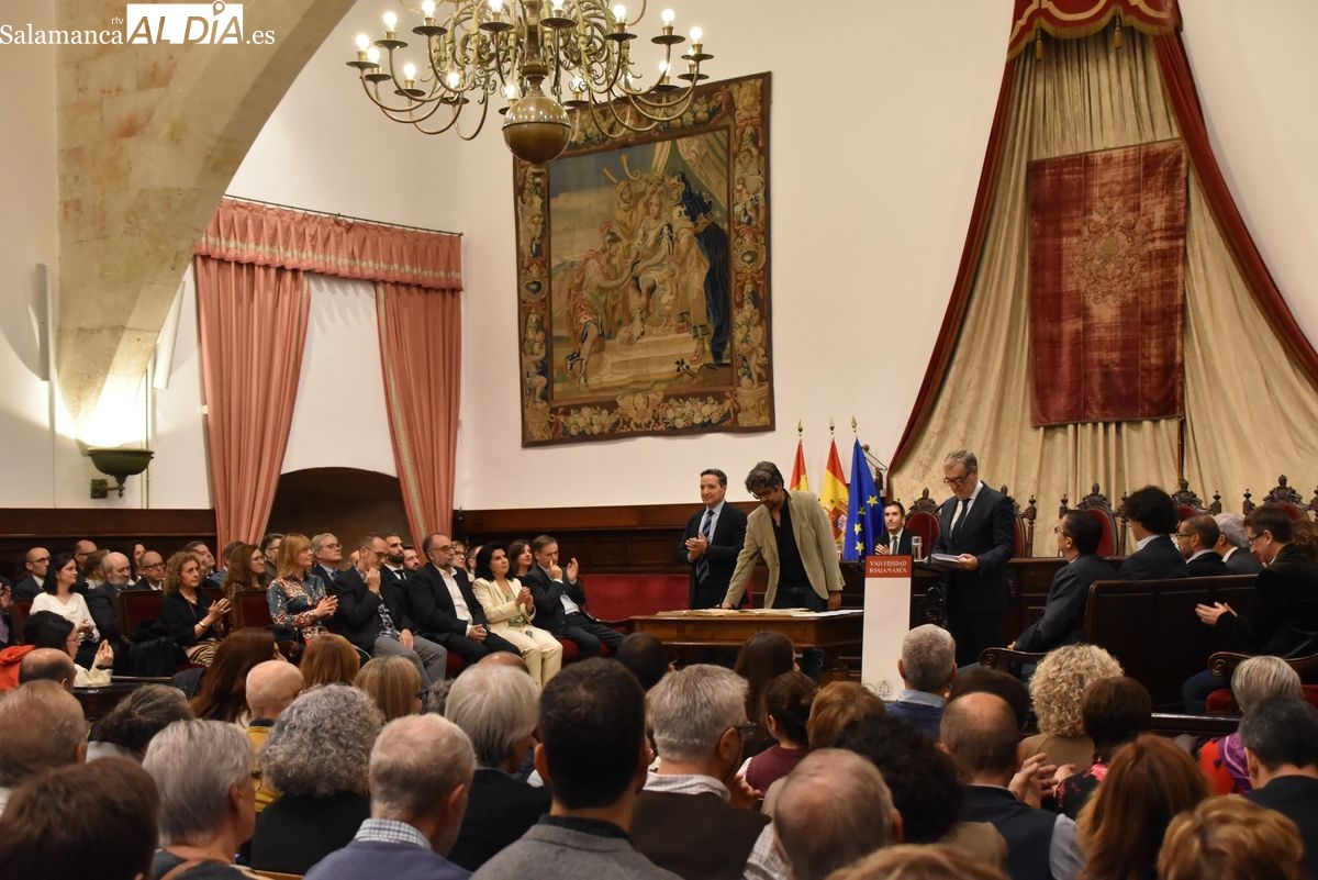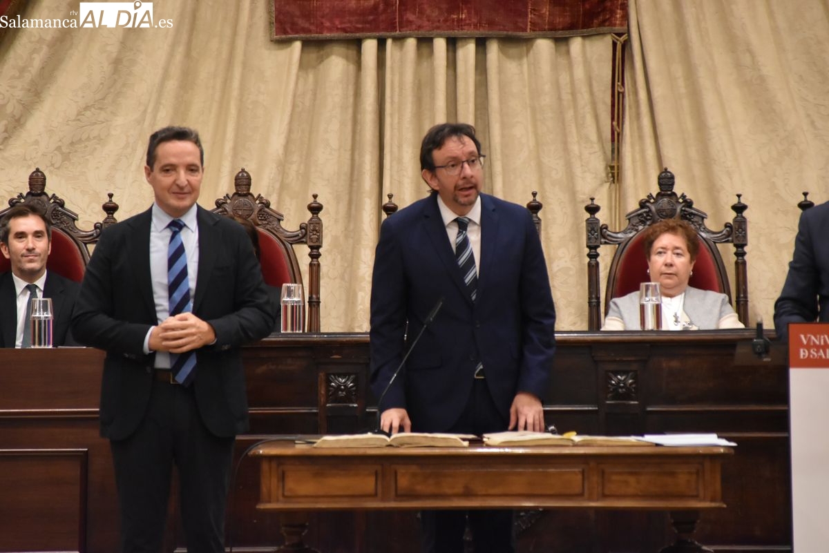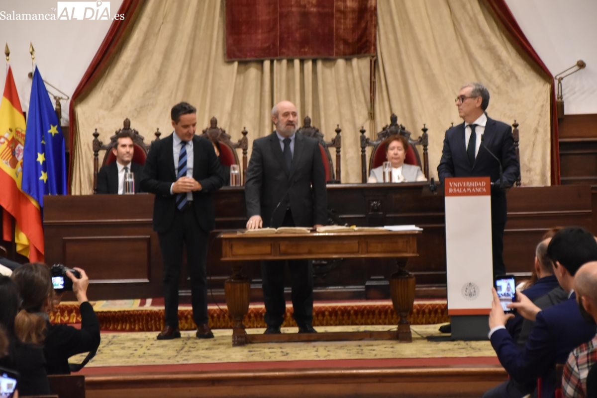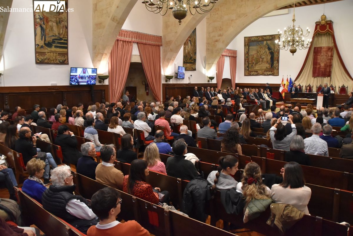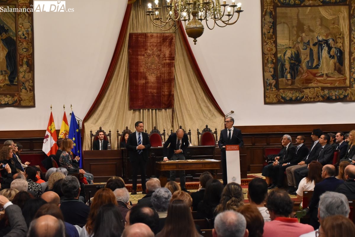 El Paraninfo del edificio de las Escuelas Mayores ha acogido en la mañana de este lunes la renovación de una parte significativa de la estructura académica de la Universidad de Salamanca. El rector, Juan Manuel Corchado, ha presidido el acto en el que asumen sus funciones nuevos decanos, directores de departamento e instituto, y un amplio grupo de catedráticos.