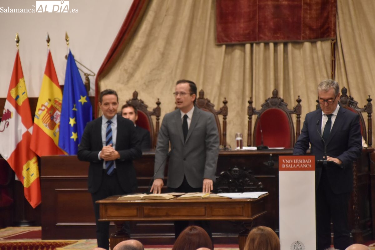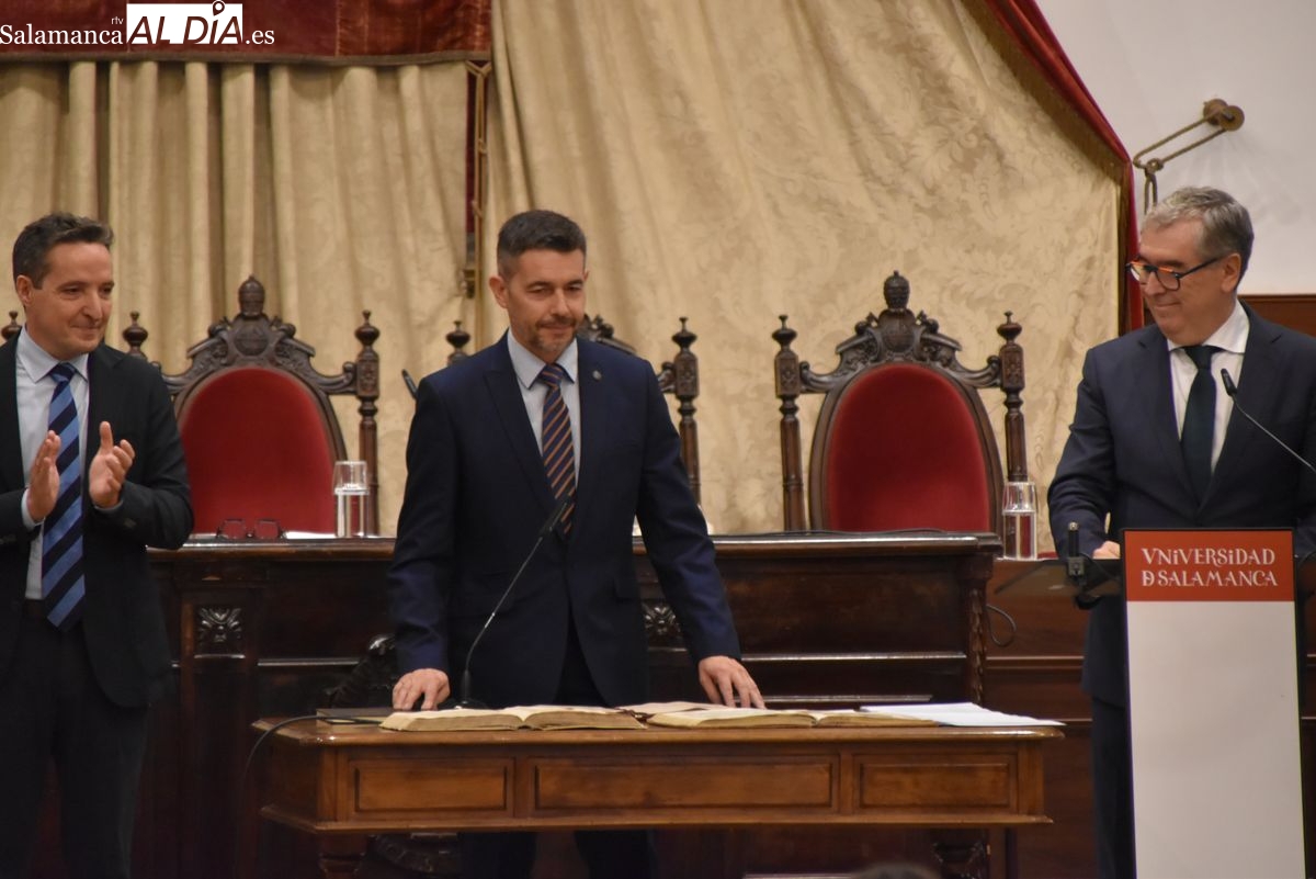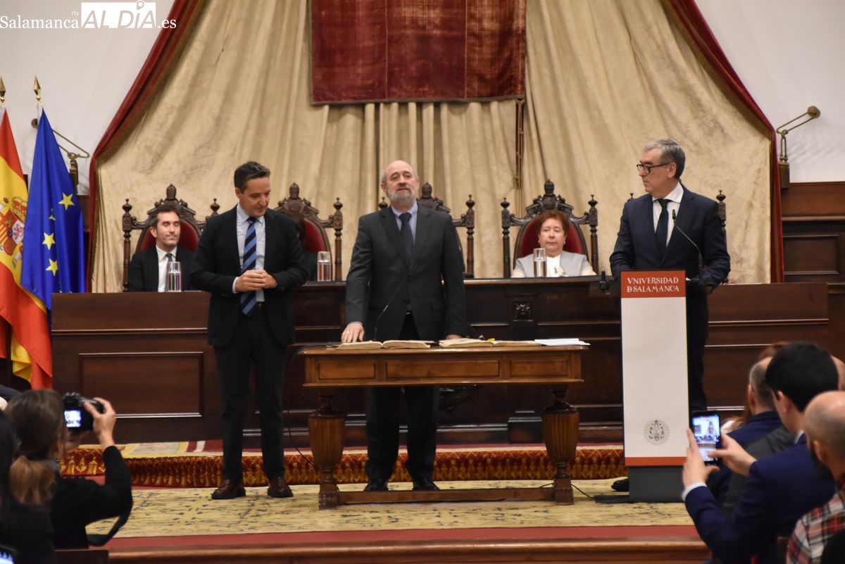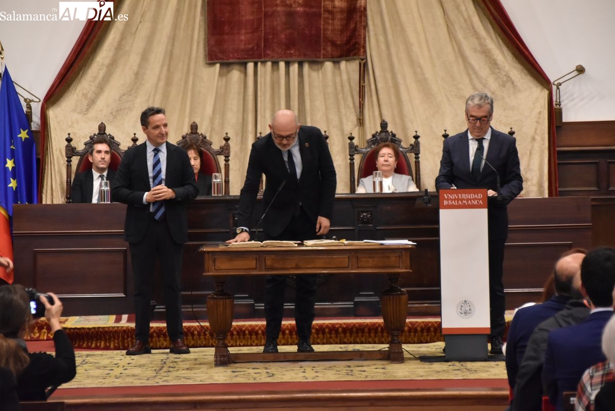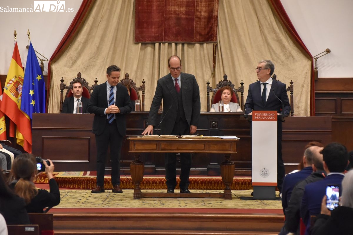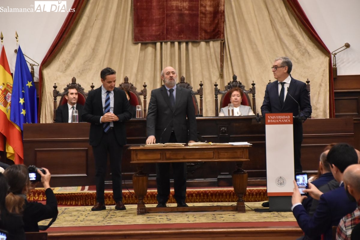 El Paraninfo del edificio de las Escuelas Mayores ha acogido en la mañana de este lunes la renovación de una parte significativa de la estructura académica de la Universidad de Salamanca. El rector, Juan Manuel Corchado, ha presidido el acto en el que asumen sus funciones nuevos decanos, directores de departamento e instituto, y un amplio grupo de catedráticos.