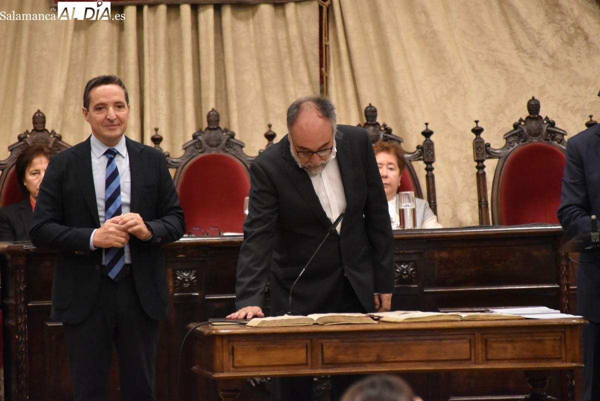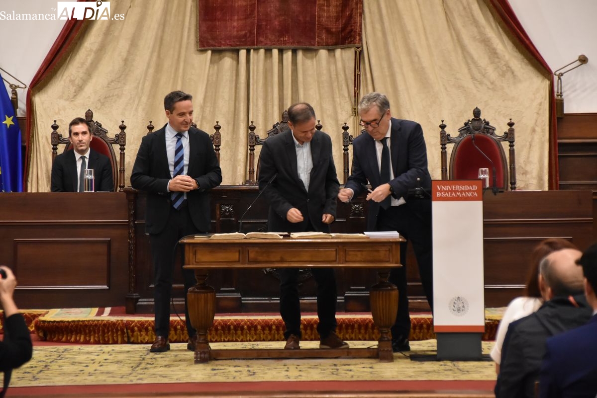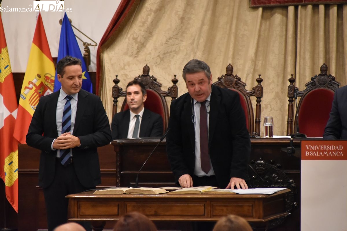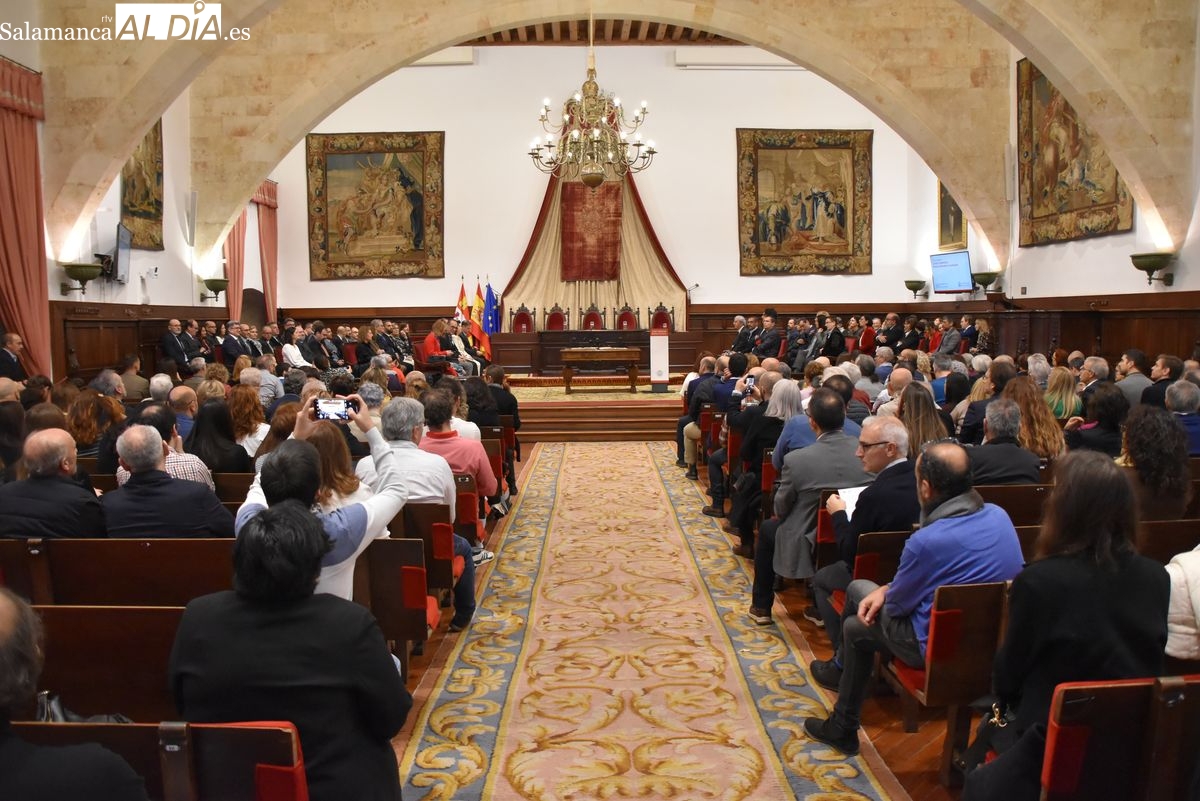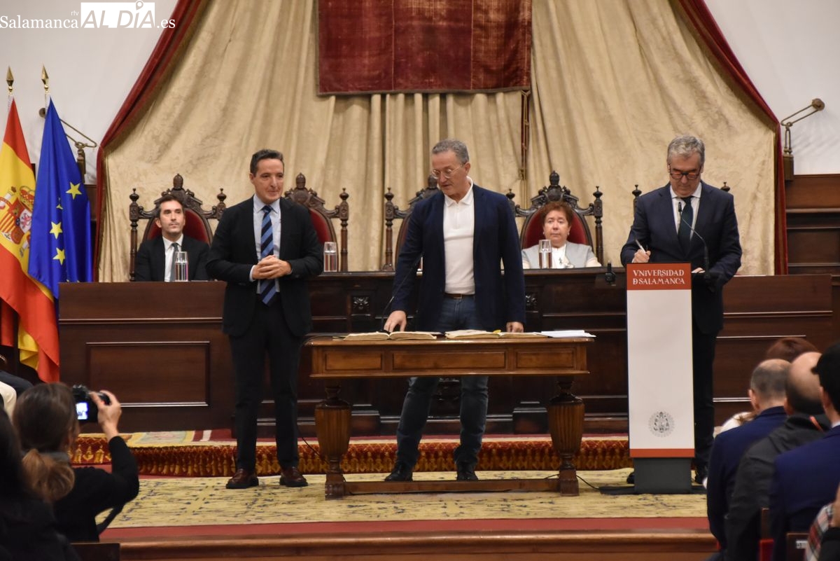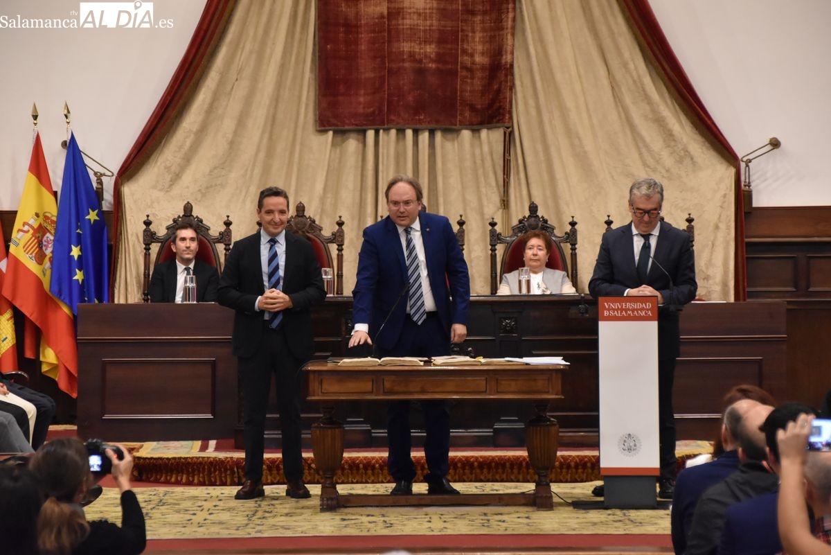 El Paraninfo del edificio de las Escuelas Mayores ha acogido en la mañana de este lunes la renovación de una parte significativa de la estructura académica de la Universidad de Salamanca. El rector, Juan Manuel Corchado, ha presidido el acto en el que asumen sus funciones nuevos decanos, directores de departamento e instituto, y un amplio grupo de catedráticos.