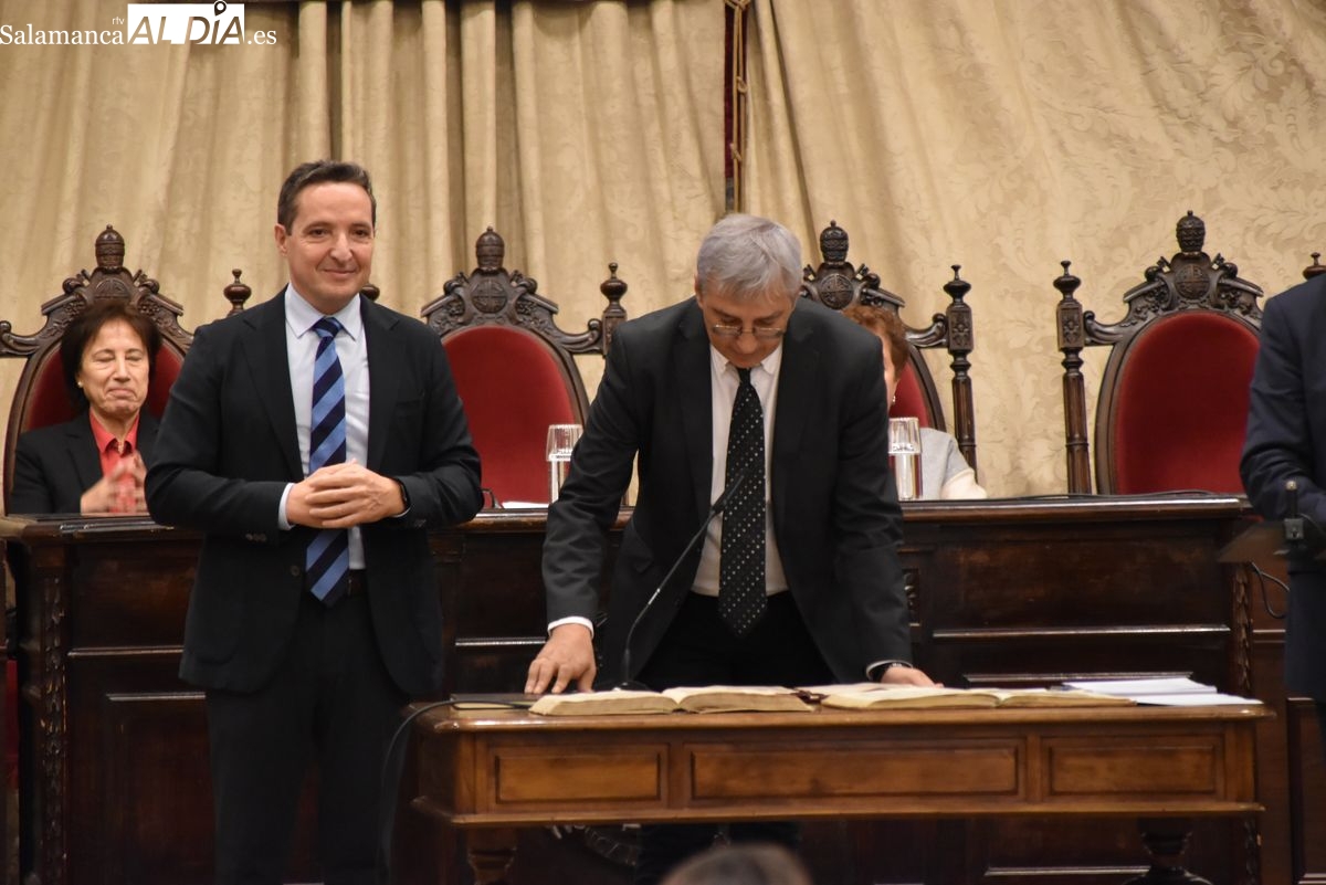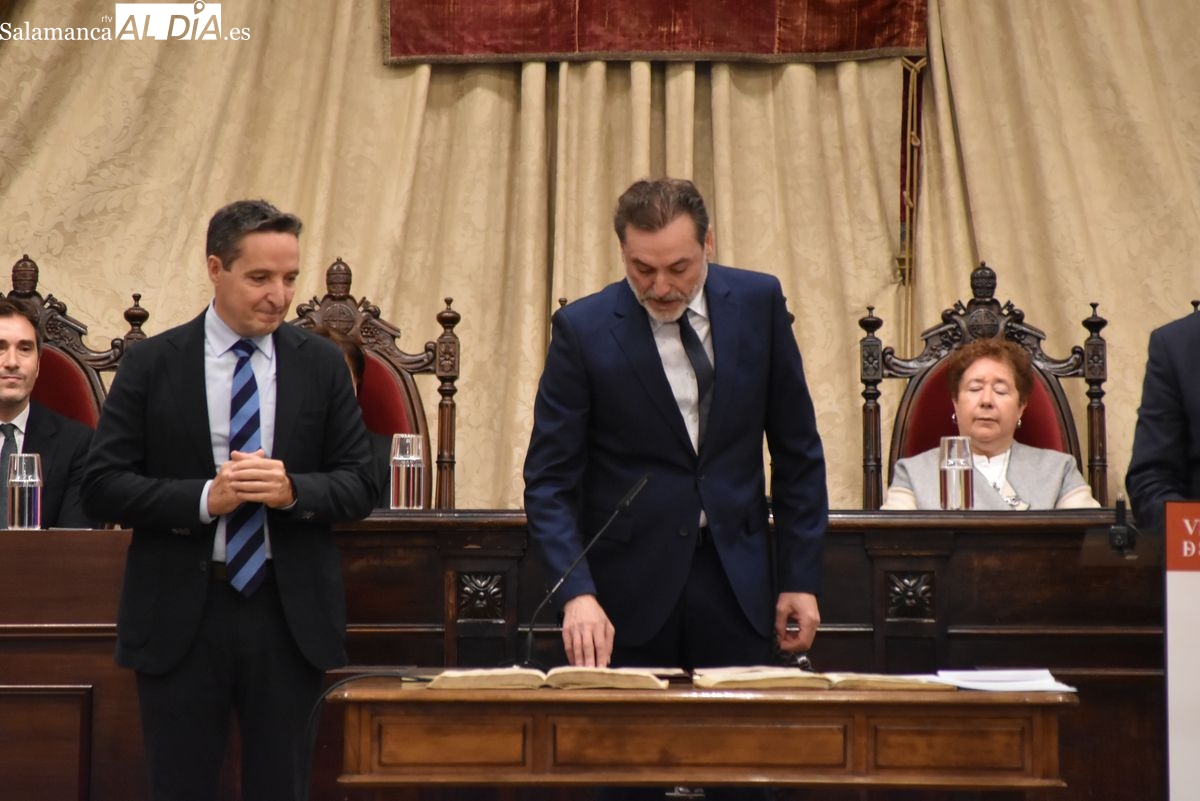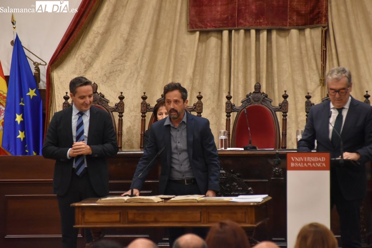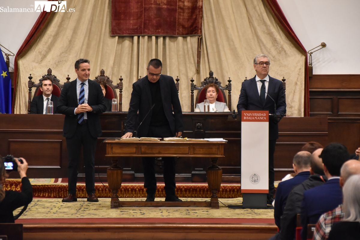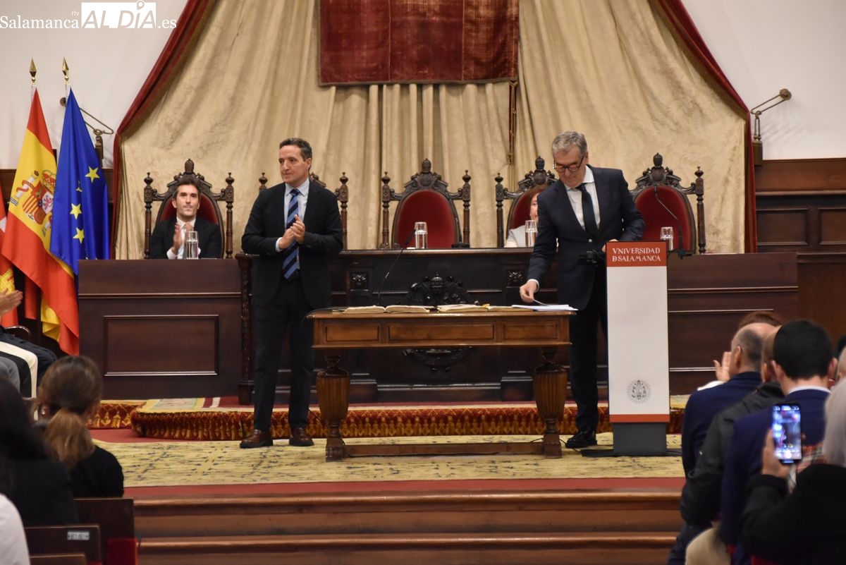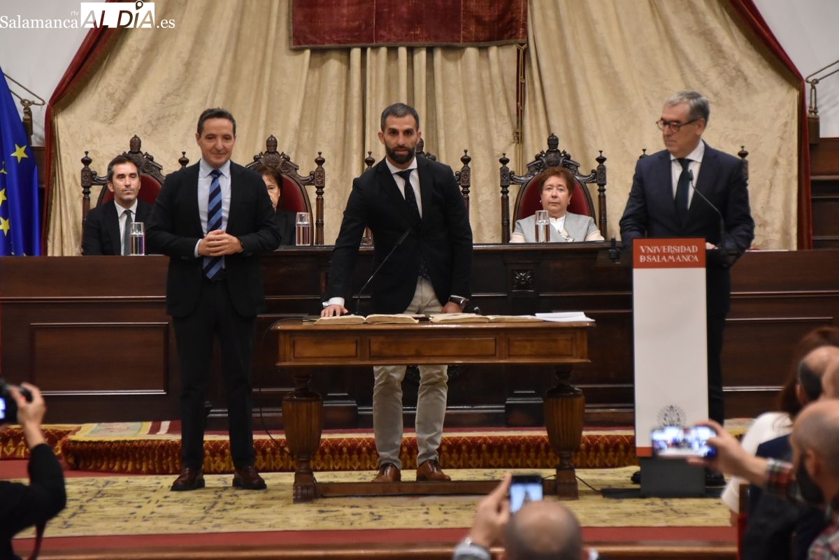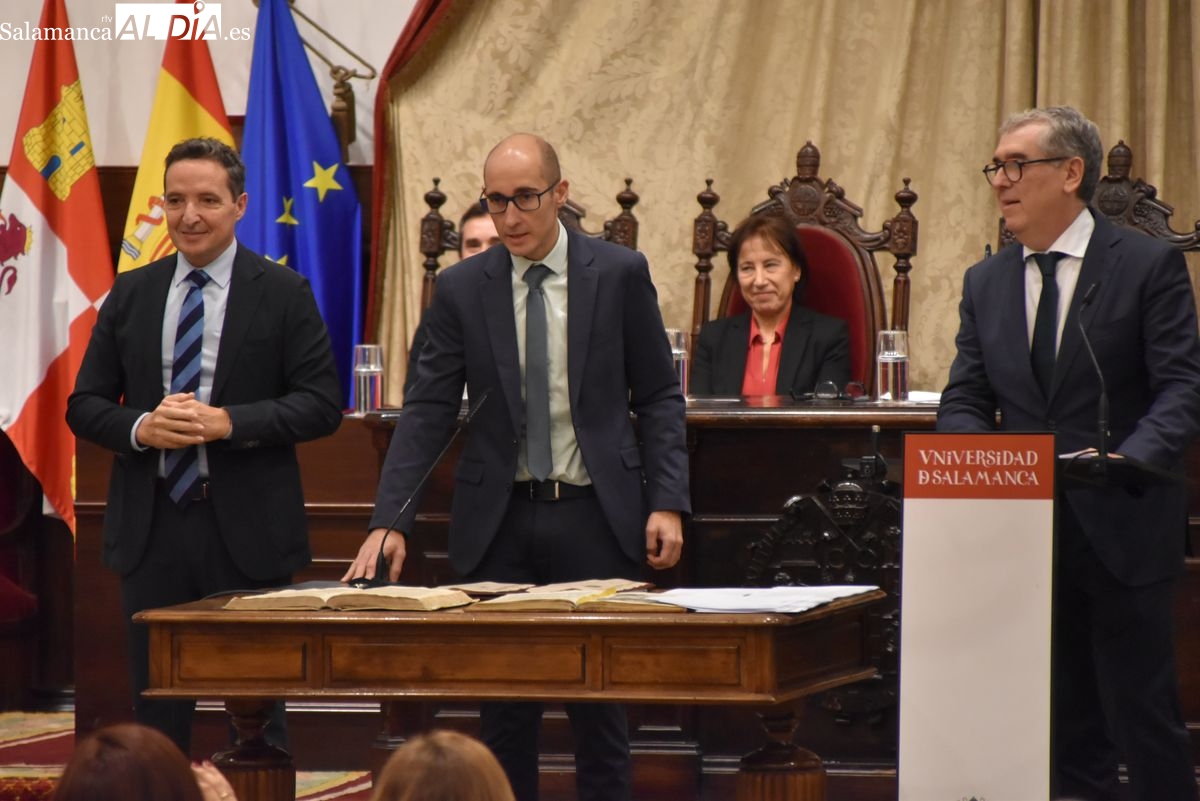 El Paraninfo del edificio de las Escuelas Mayores ha acogido en la mañana de este lunes la renovación de una parte significativa de la estructura académica de la Universidad de Salamanca. El rector, Juan Manuel Corchado, ha presidido el acto en el que asumen sus funciones nuevos decanos, directores de departamento e instituto, y un amplio grupo de catedráticos.