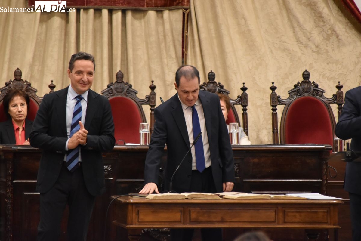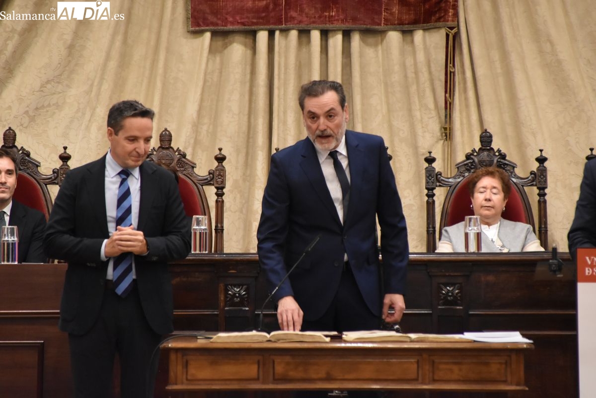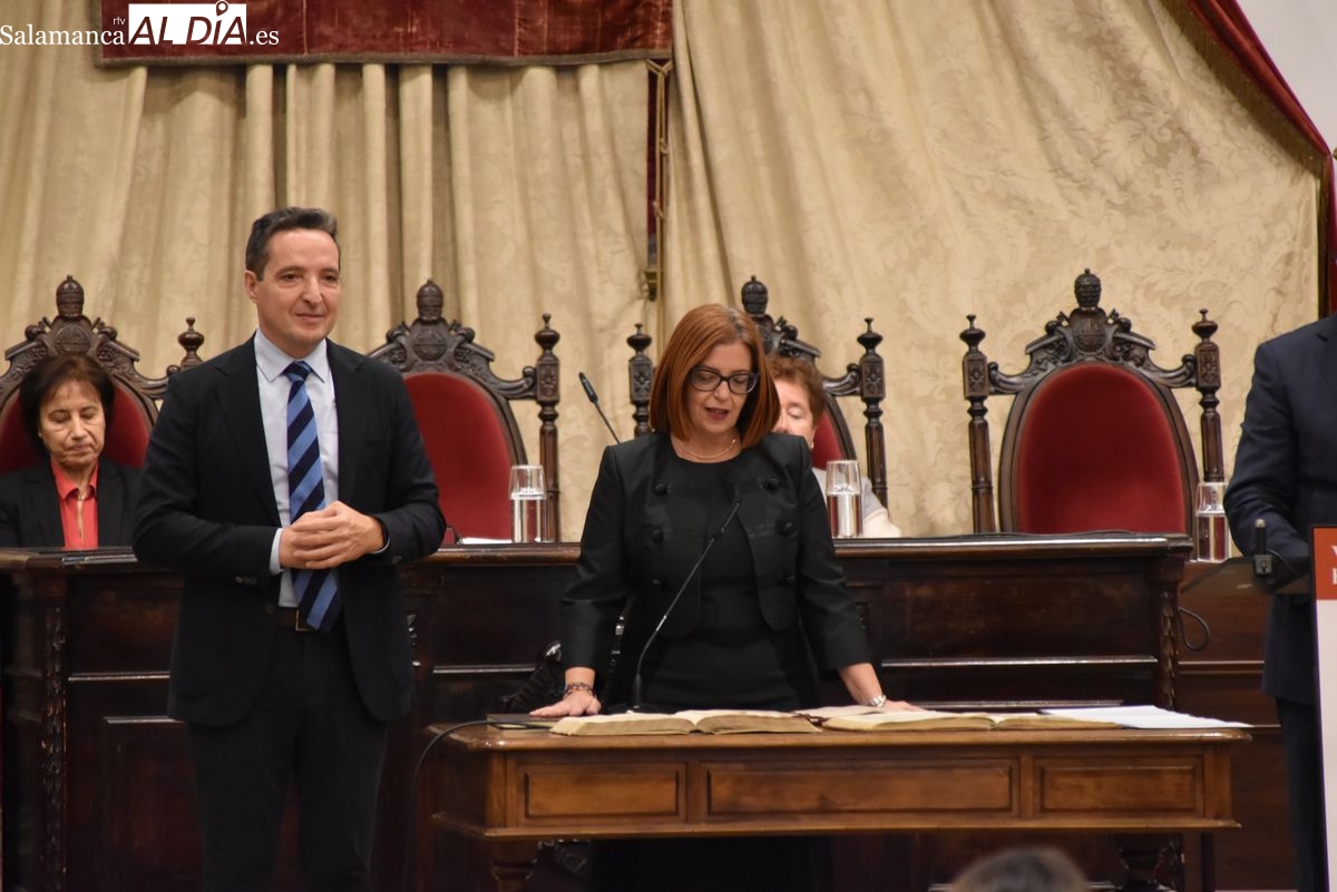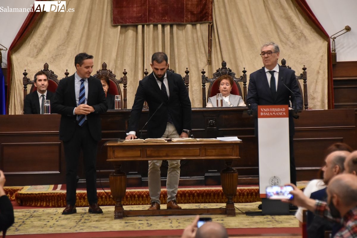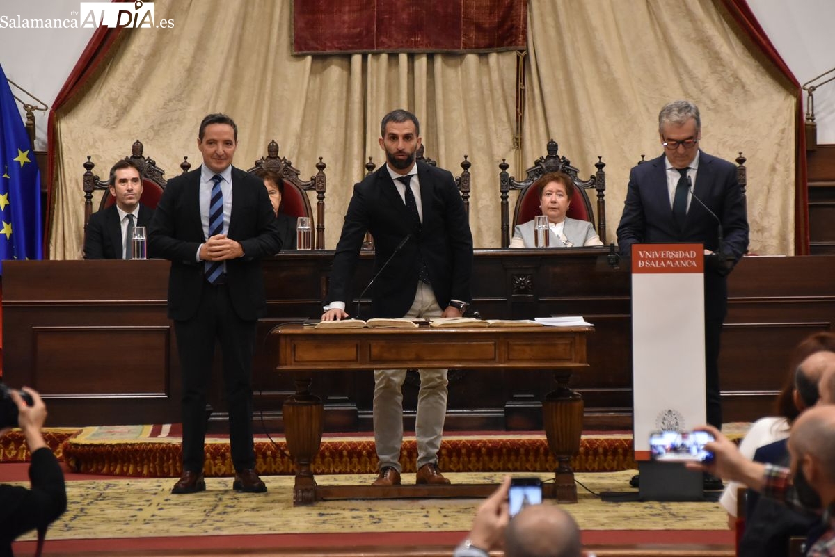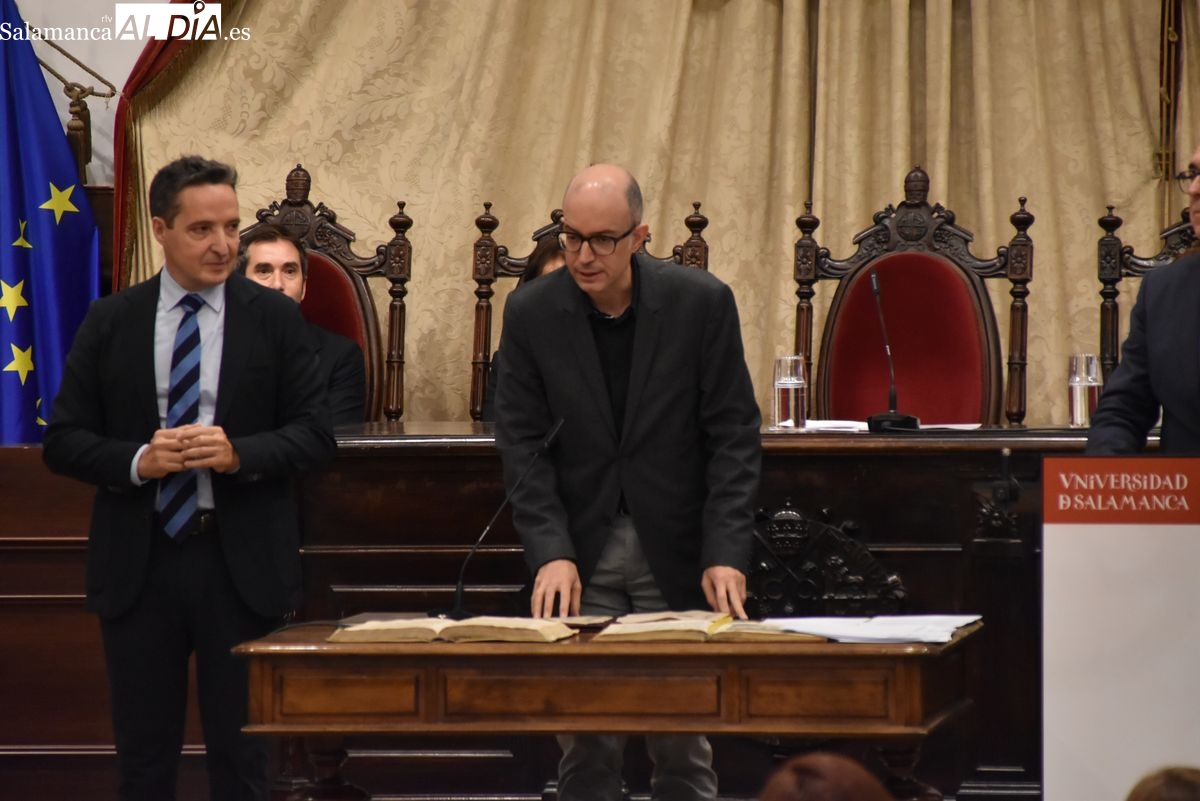 El Paraninfo del edificio de las Escuelas Mayores ha acogido en la mañana de este lunes la renovación de una parte significativa de la estructura académica de la Universidad de Salamanca. El rector, Juan Manuel Corchado, ha presidido el acto en el que asumen sus funciones nuevos decanos, directores de departamento e instituto, y un amplio grupo de catedráticos.