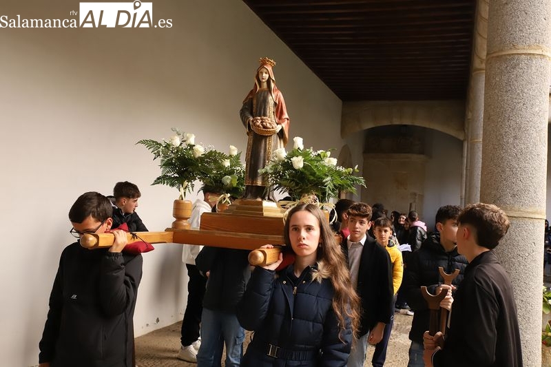 El Colegio Santa Isabel de Alba de Tormes ha celebrado este lunes, 17 de noviembre, la festividad de su patrona, Santa Isabel de Hungría, con una jornada repleta de actividades. La lluvia que ha caído sobre la villa ducal durante la mañana ha obligado a modificar uno de los actos centrales, la procesión, que finalmente ha transcurrido por el interior de las instalaciones del centro.
