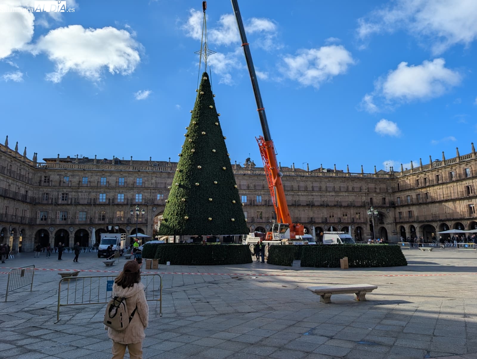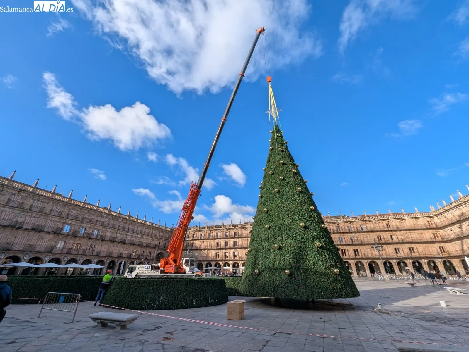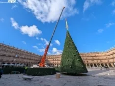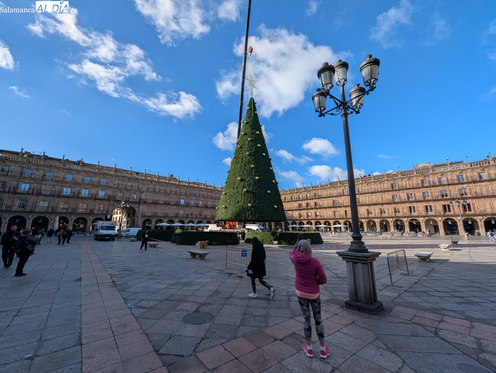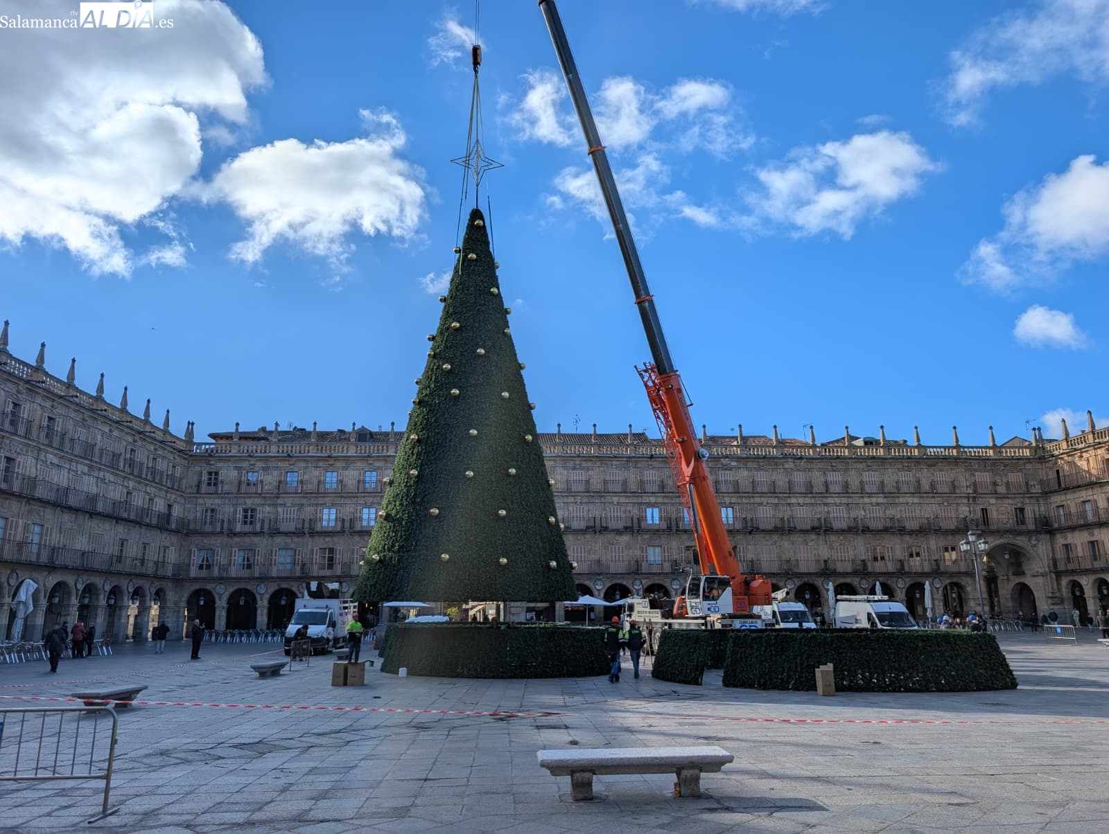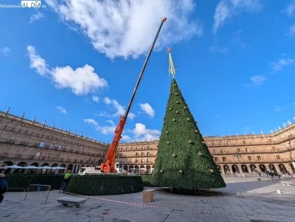Ya hay árbol de Navidad en la Plaza Mayor de Salamanca. Si el pasado lunes, 17 de noviembre contábamos que empezaba amontarse la estructura, ahora ya puede verse en su totalidad. El árbol, de 23 metros de altura, centrará miles de miradas en las próximas fechas navideñas desde su encendido: el próximo jueves, 27 de noviembre.
