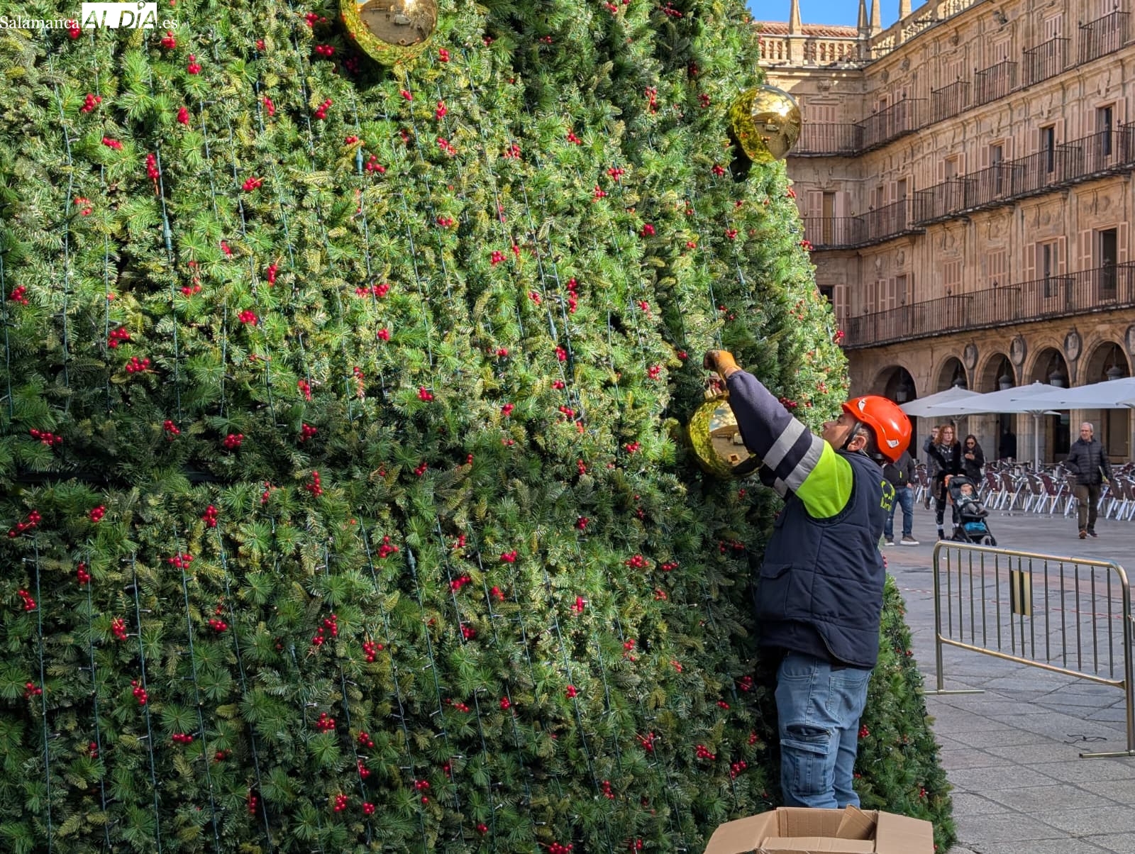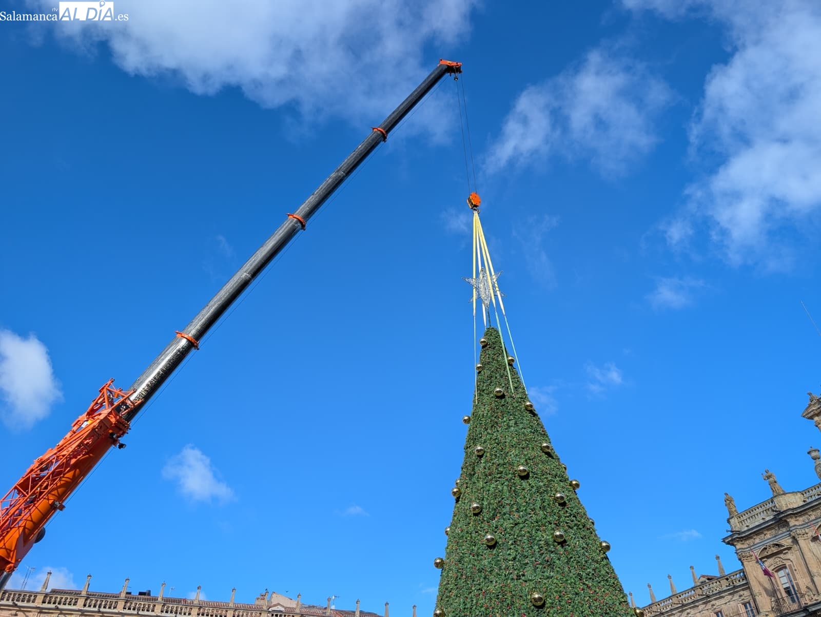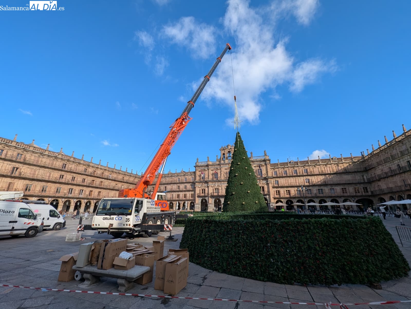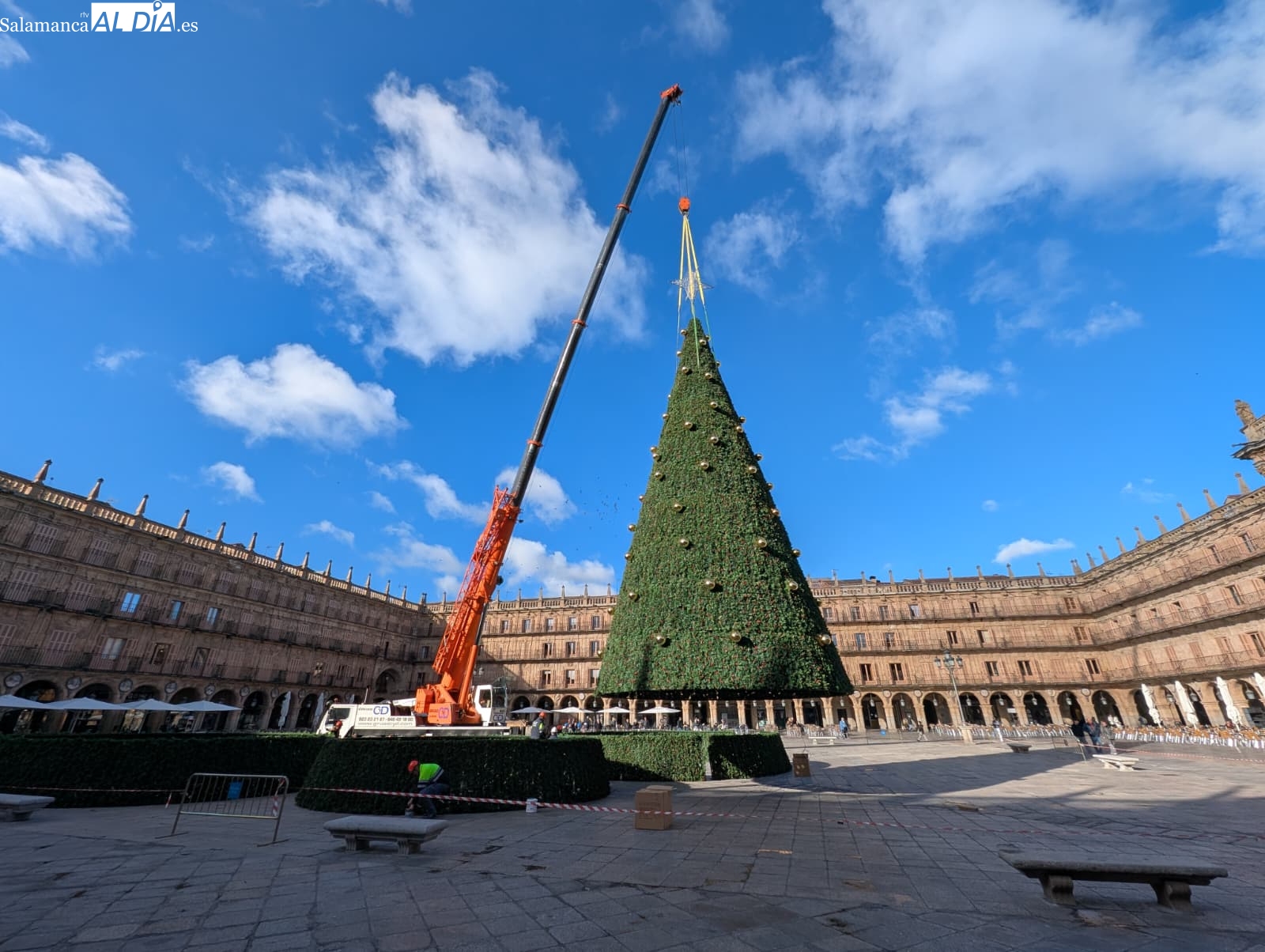 Ya hay árbol de Navidad en la Plaza Mayor de Salamanca. Si el pasado lunes, 17 de noviembre contábamos que empezaba amontarse la estructura, ahora ya puede verse en su totalidad. El árbol, de 23 metros de altura, centrará miles de miradas en las próximas fechas navideñas desde su encendido: el próximo jueves, 27 de noviembre.