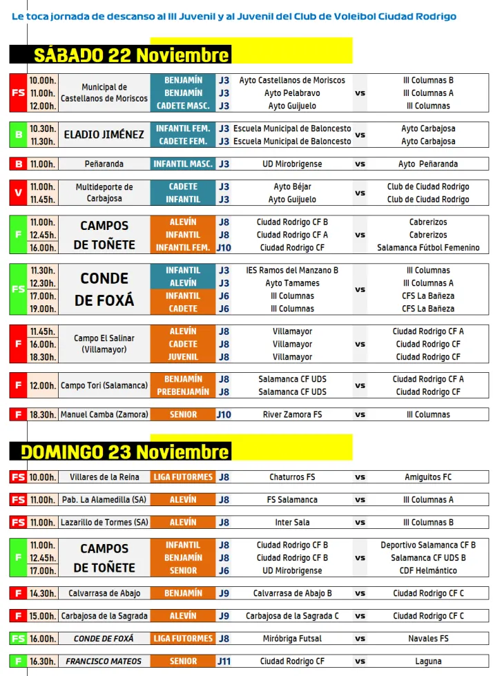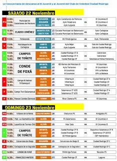 En lo que respecta a los partidos federados de fútbol sala, se trata de nuevos encuentros del Infantil y el Cadete del III Columnas, que volverán a jugar por 4ª semana consecutiva en Conde de Foxá, al haberse vuelto a producir un intercambio del orden establecido de los partidos, en este caso por petición de su rival, La Bañeza. En total, estos equipos han jugado 5 de sus 6 partidos en Ciudad Rodrigo, sin haber salido todavía de la provincia de Salamanca (el que disputó cada uno de ellos como visitante fue en Salamanca capital), lo que no harán hasta mediados de enero.