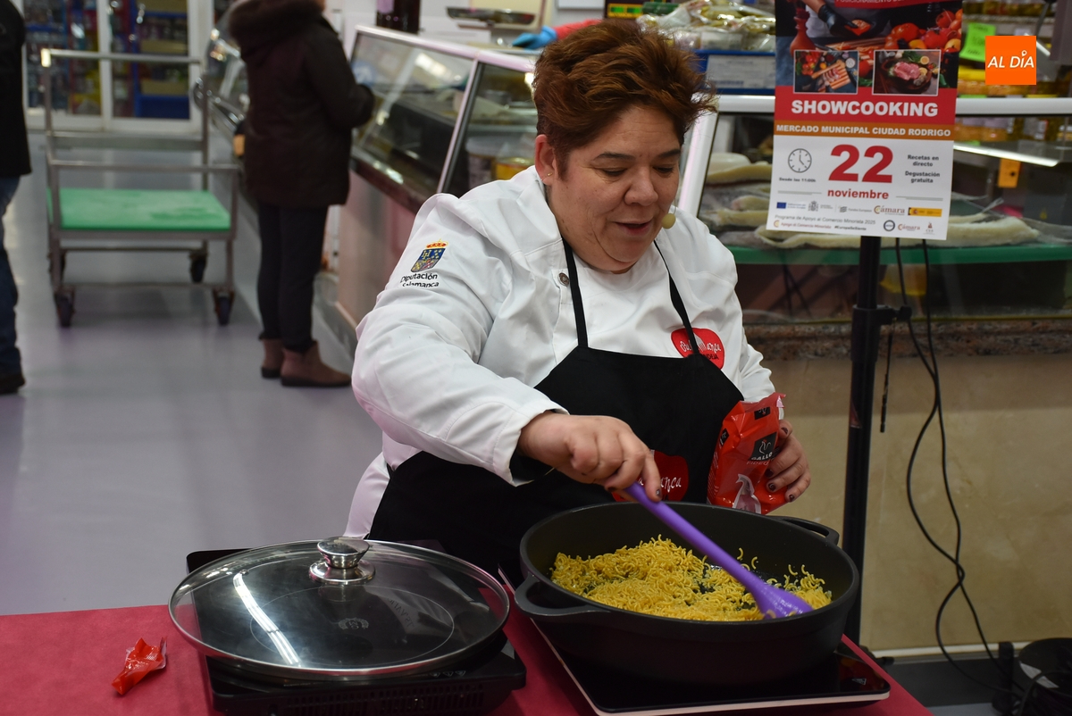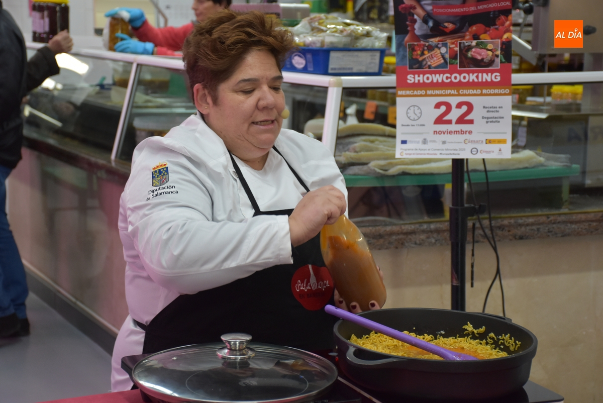 Como aquellos anteriores showcookings, la cita de la mañana sabatina corrió a cargo de la chef mirobrigense Leticia Martín Palos, quién espera que sea “el principio de más veces”. Con productos adquiridos, respectivamente, en las pescaderías, las carnicerías y las fruterías del Mercado, Leticia Martín preparó una Fideuá negra con calamar de potera y langostinos, Carrilleras al Jerez, y Crema de Limón coronada por una rosquilla de Ledesma.