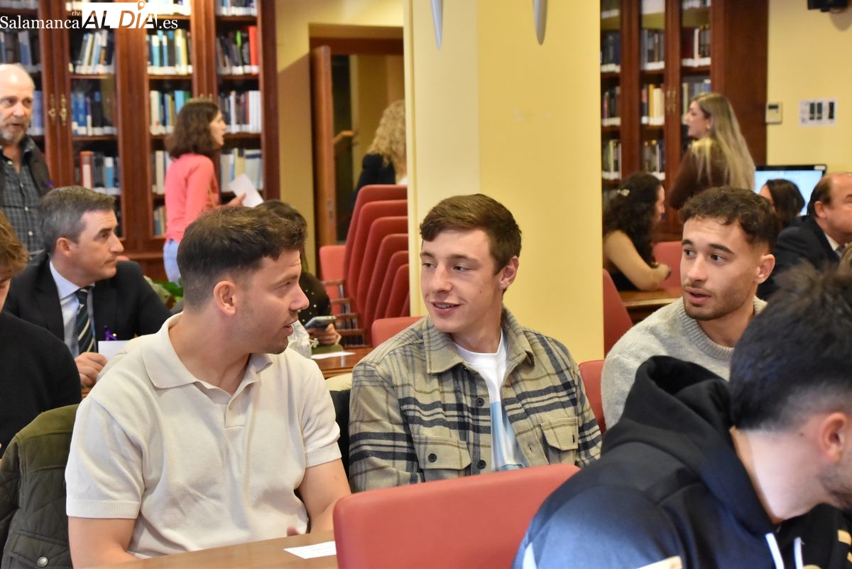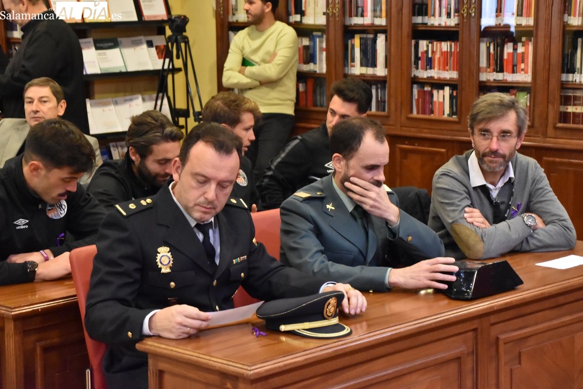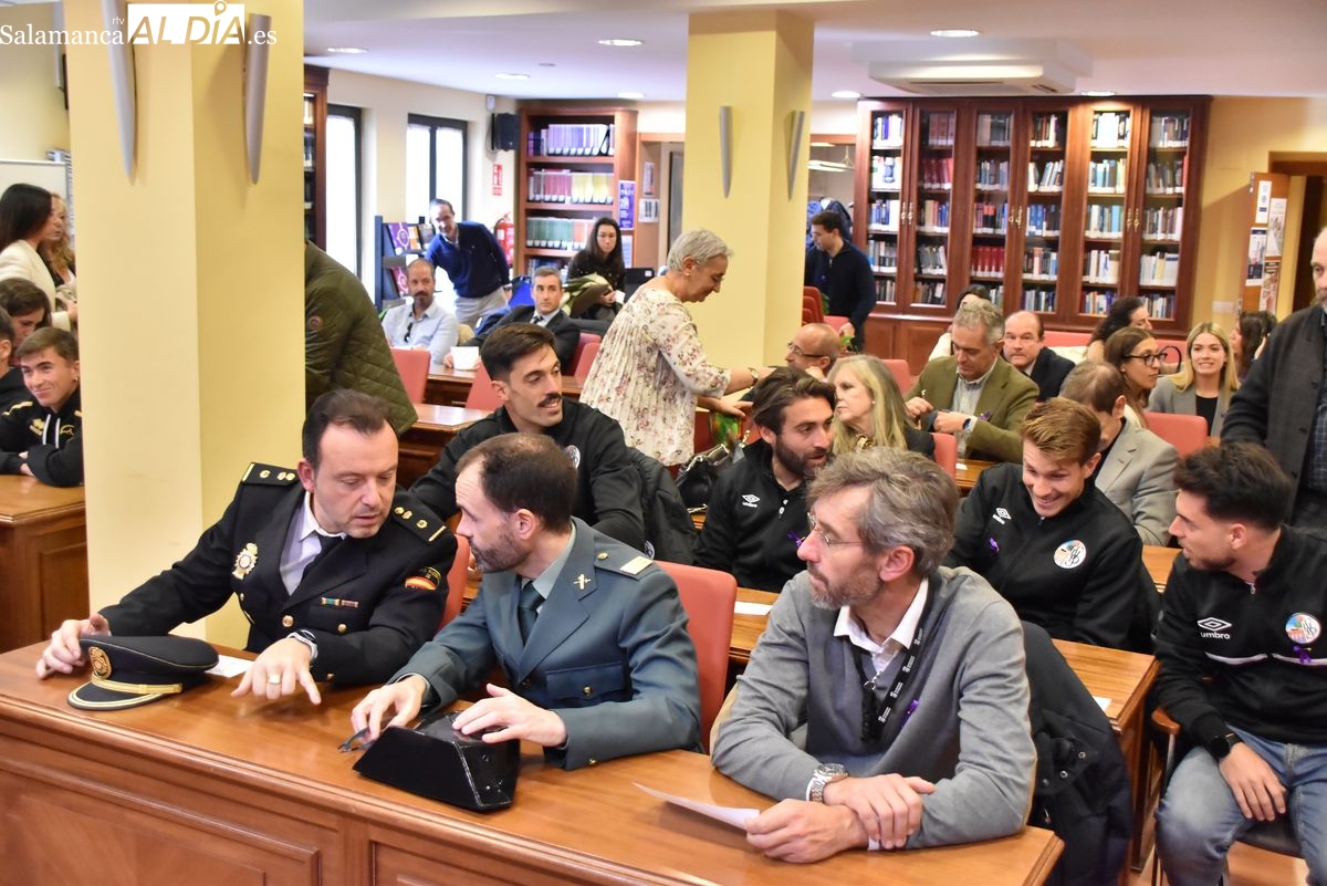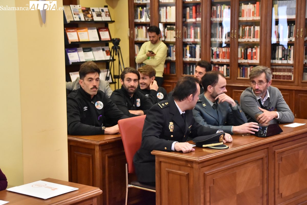 Representantes de las plantillas de Unionistas de Salamanca, el Salamanca Club de Fútbol UDS y el Club Deportivo Guijuelo han acudido a la sede colegial para participar activamente en el homenaje. Su presencia simboliza un compromiso conjunto que supera las rivalidades deportivas en favor de los derechos humanos.