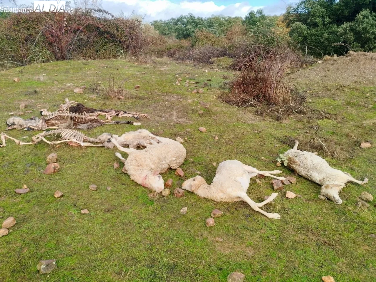 Según han relatado los afectados, la imagen que ofrecía la parcela era dantesca, con cadáveres esparcidos por diferentes puntos del recinto. De las ocho ovejas muertas, tres aparecieron en el interior de una charca, presumiblemente ahogadas o atacadas mientras intentaban huir del depredador. Los cuerpos de las otras cinco ovejas se encontraban dispersos por el resto de la parcela y habían sido devorados prácticamente en su totalidad por los buitres, lo que evidencia la rapidez con la que actúan las aves necrófagas tras este tipo de incidentes.