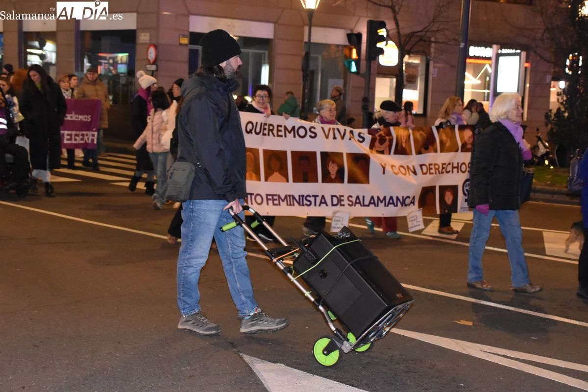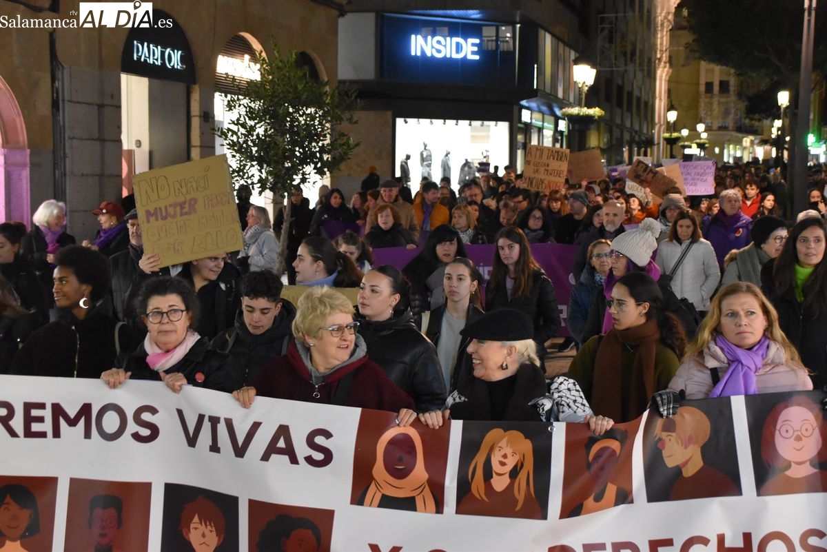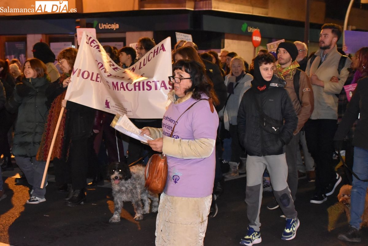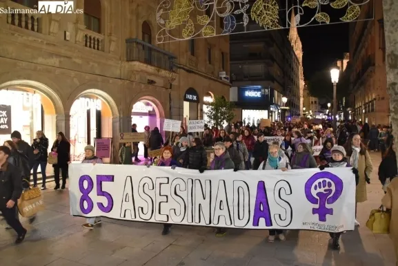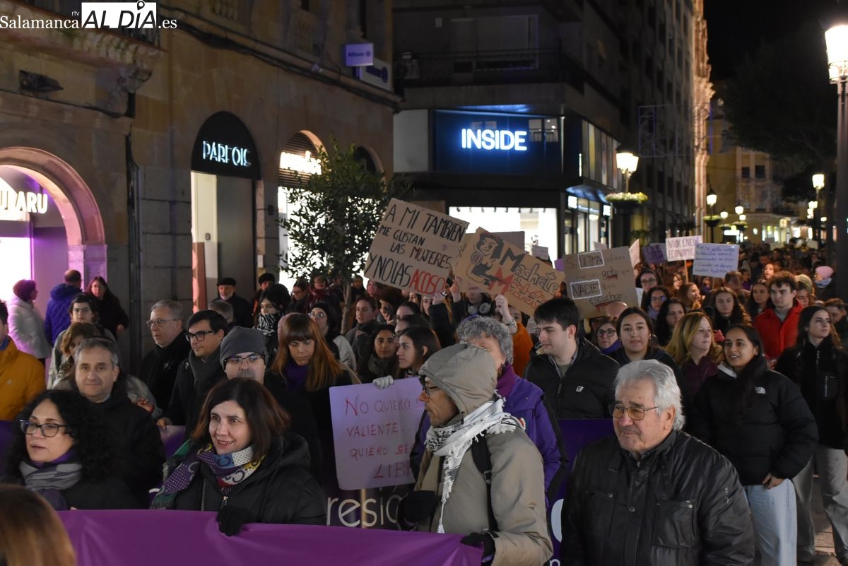 Una multitudinaria marea morada ha tomado esta tarde las calles de Salamanca para alzar la voz, un año más, contra la violencia de género. Convocada por el Movimiento Feminista de Salamanca, la manifestación ha reunido a personas de todas las edades en una jornada reivindicativa que ha teñido de violeta el eje comercial y social de la capital del Tormes bajo el lema 'El machismo nos cuesta la vida'.