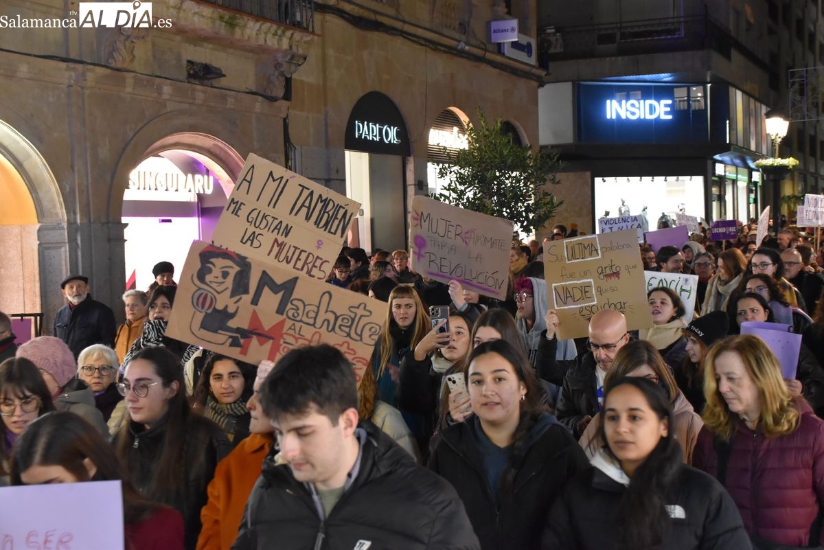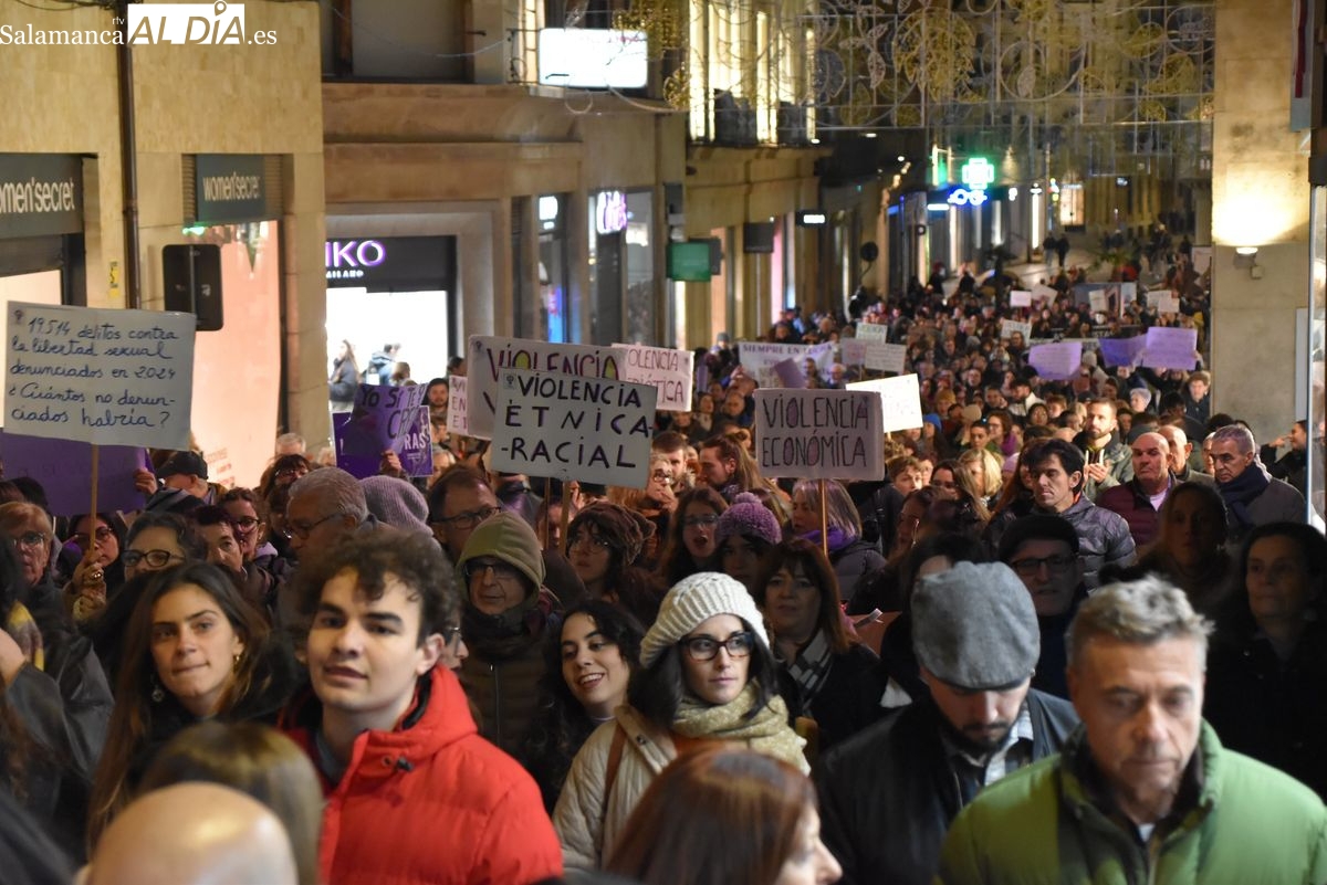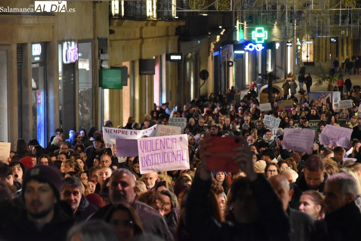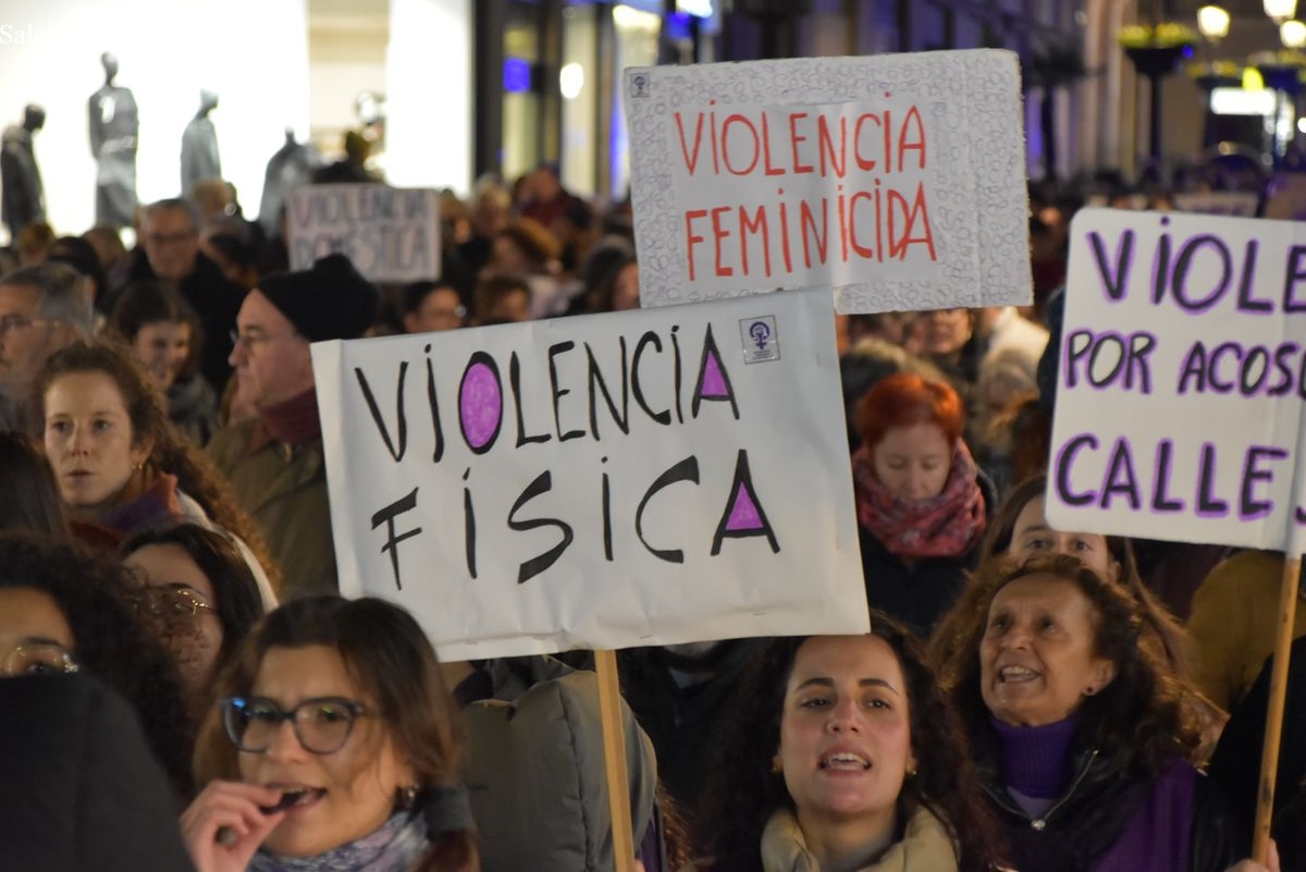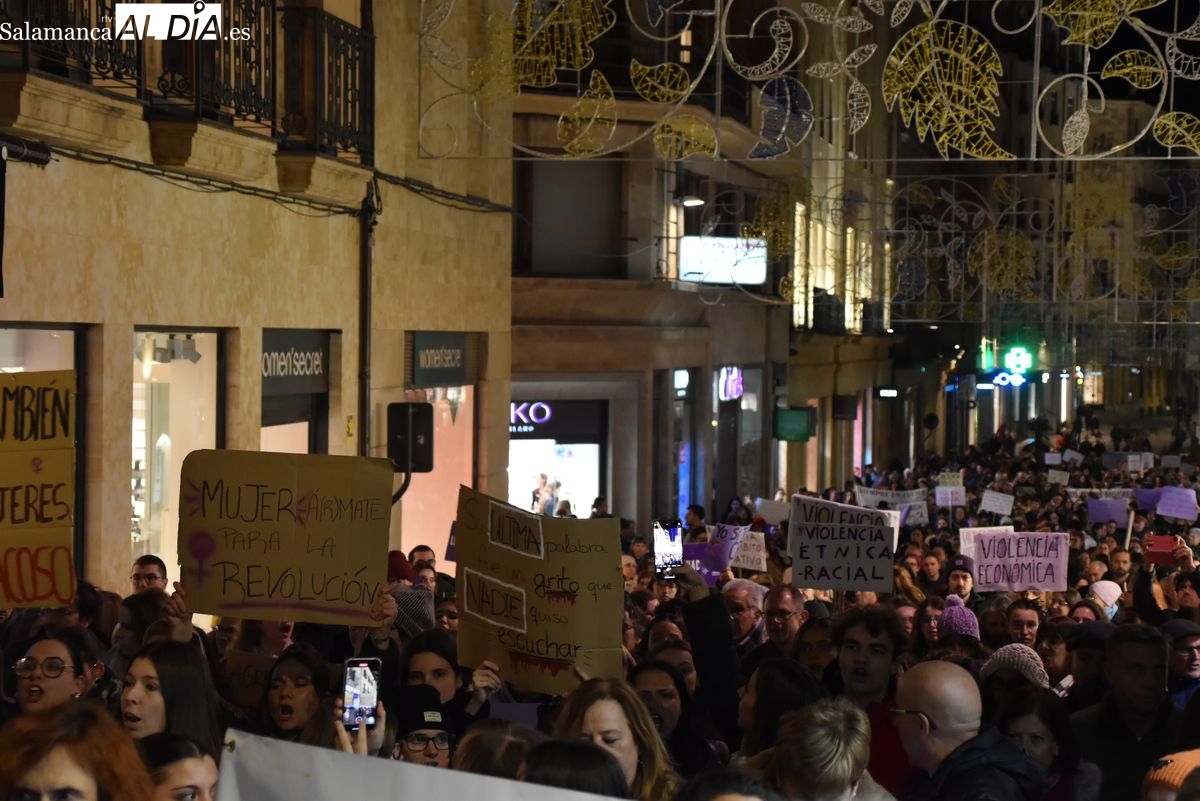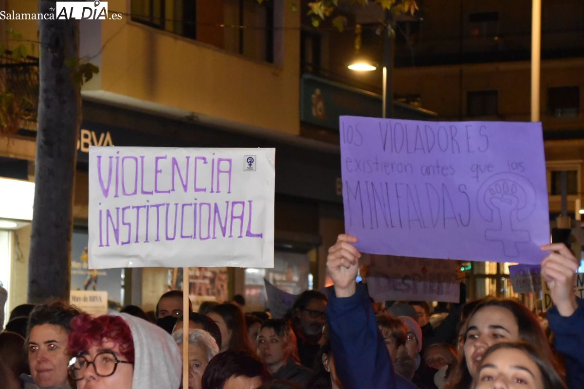 Numerosas personas, convocadas por el Movimiento Feminista de Salamanca, han recorrido este 25 de noviembre el centro de la ciudad en una masiva manifestación, que ha culminado en la Plaza Mayor con la lectura de un manifiesto que ha denunciado la violencia institucional y la 'justicia patriarcal'