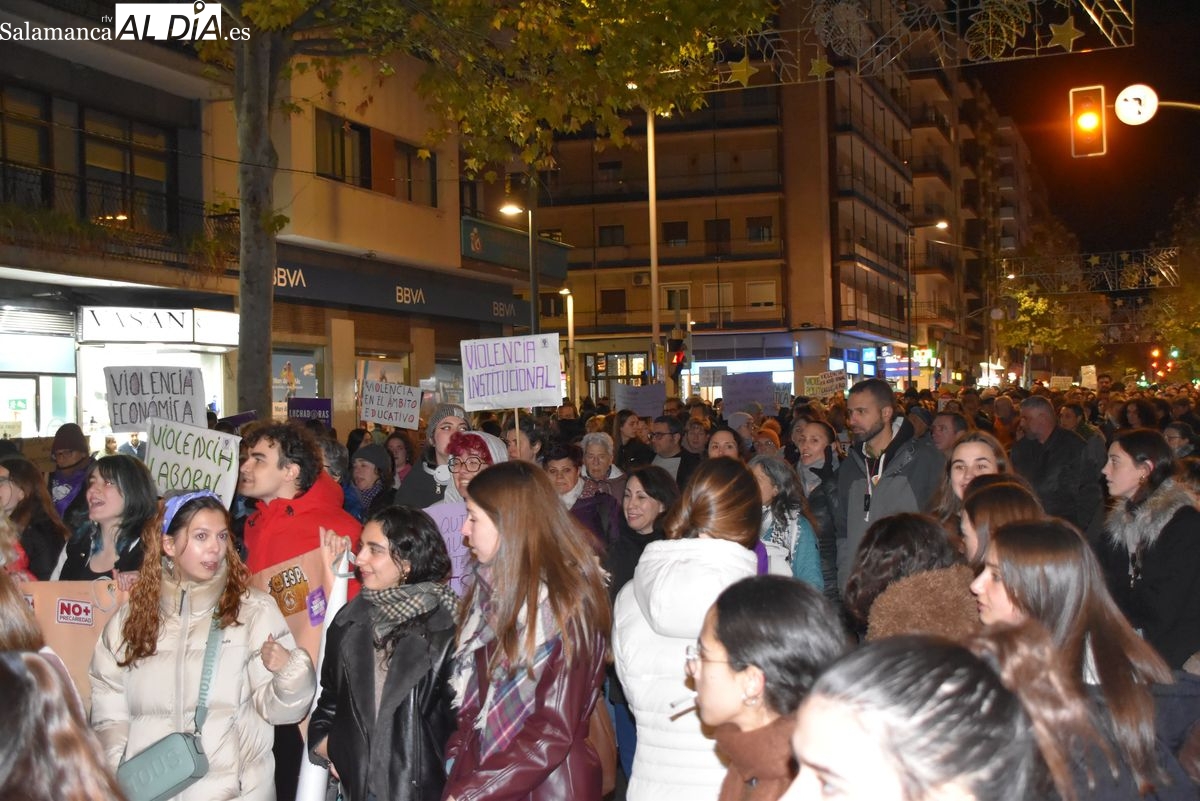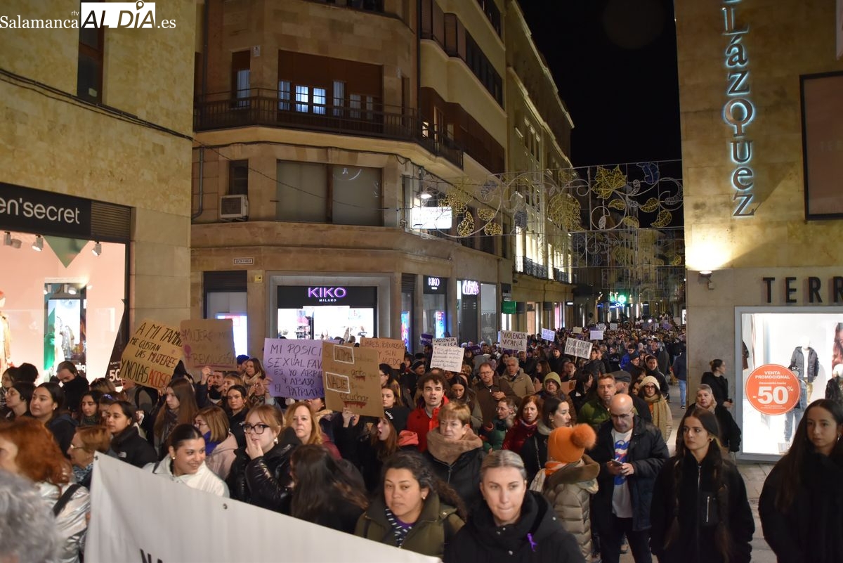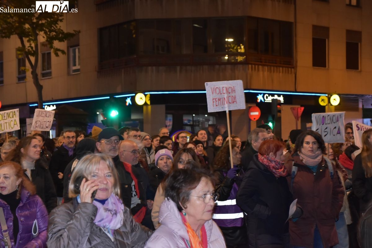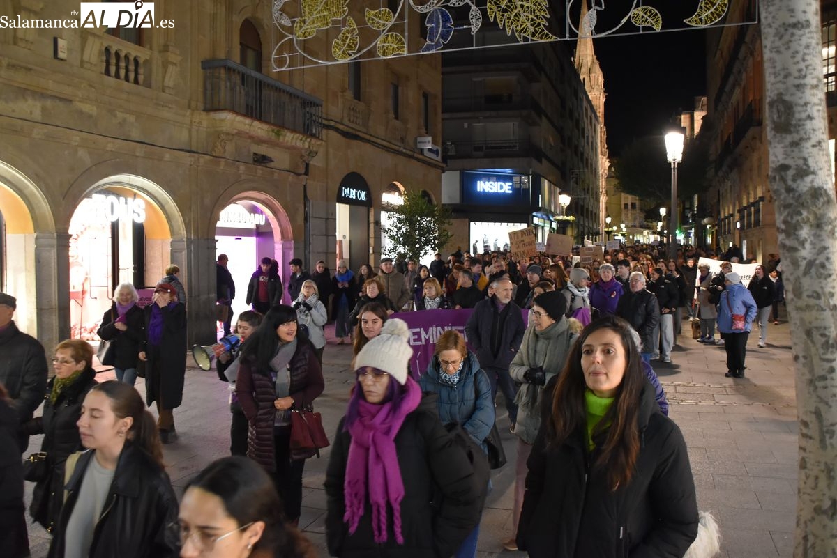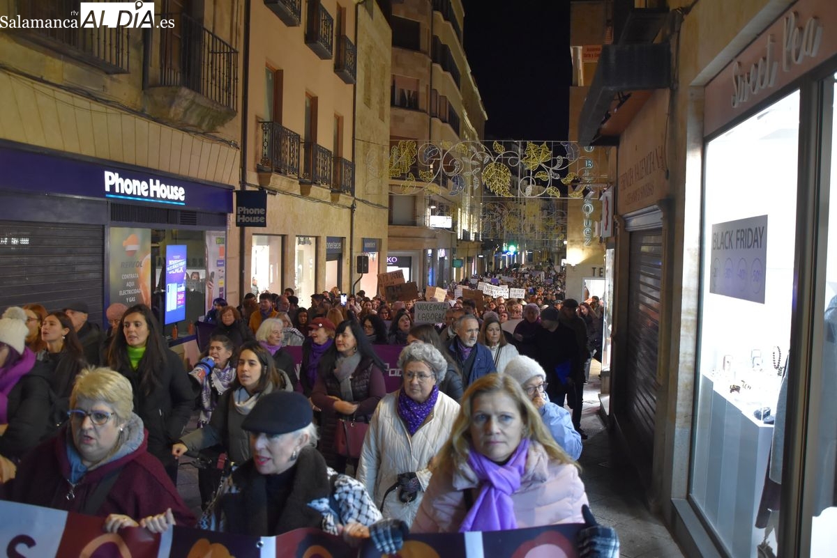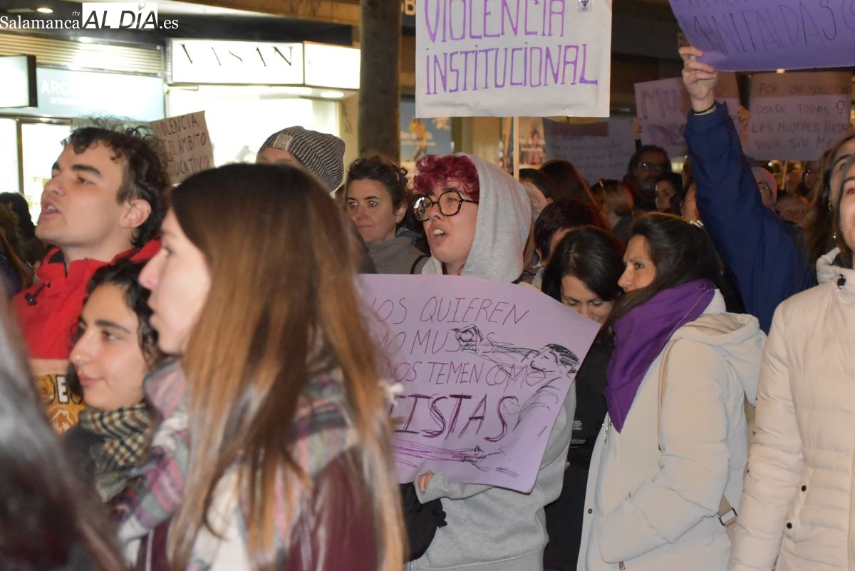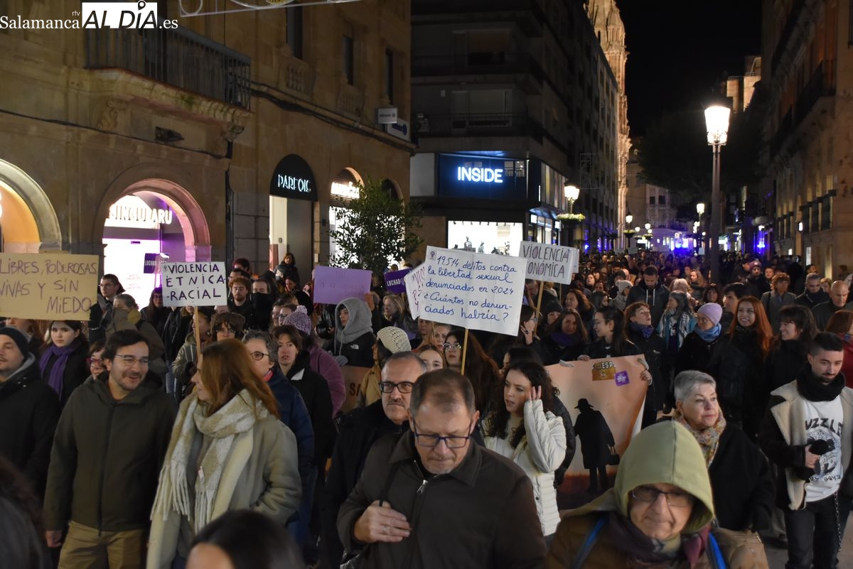 Numerosas personas, convocadas por el Movimiento Feminista de Salamanca, han recorrido este 25 de noviembre el centro de la ciudad en una masiva manifestación, que ha culminado en la Plaza Mayor con la lectura de un manifiesto que ha denunciado la violencia institucional y la 'justicia patriarcal'