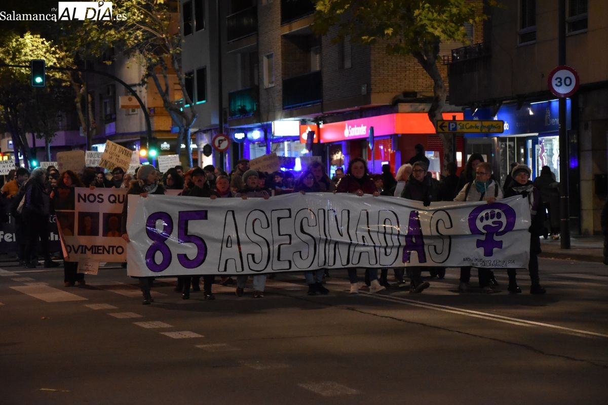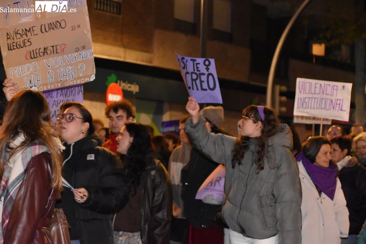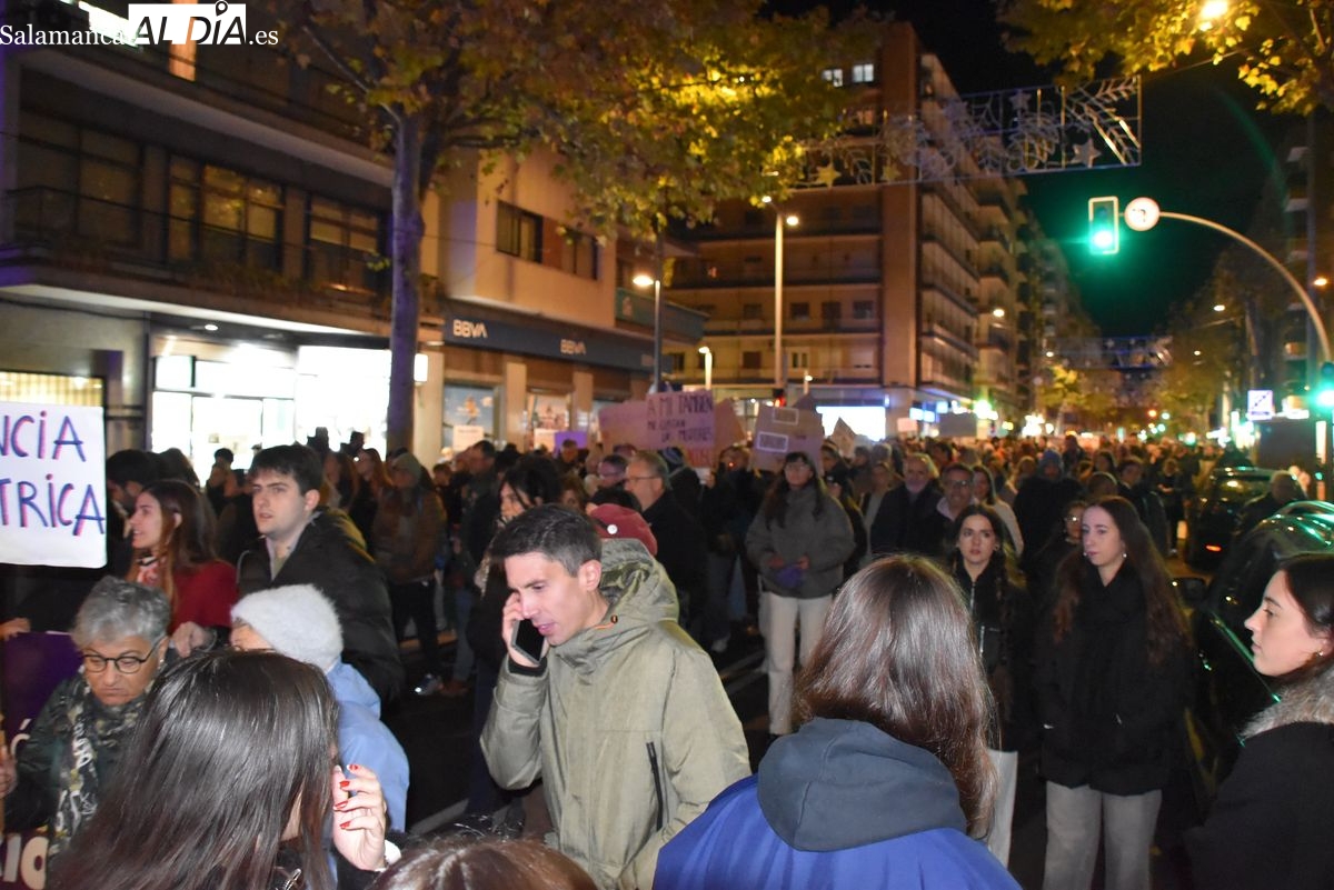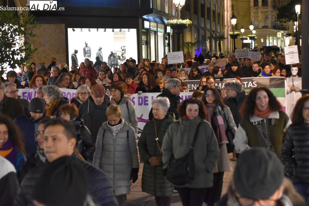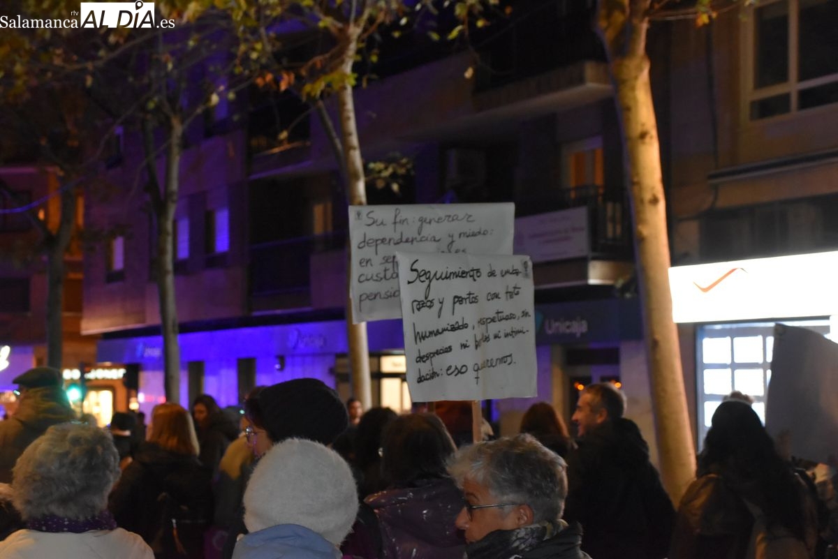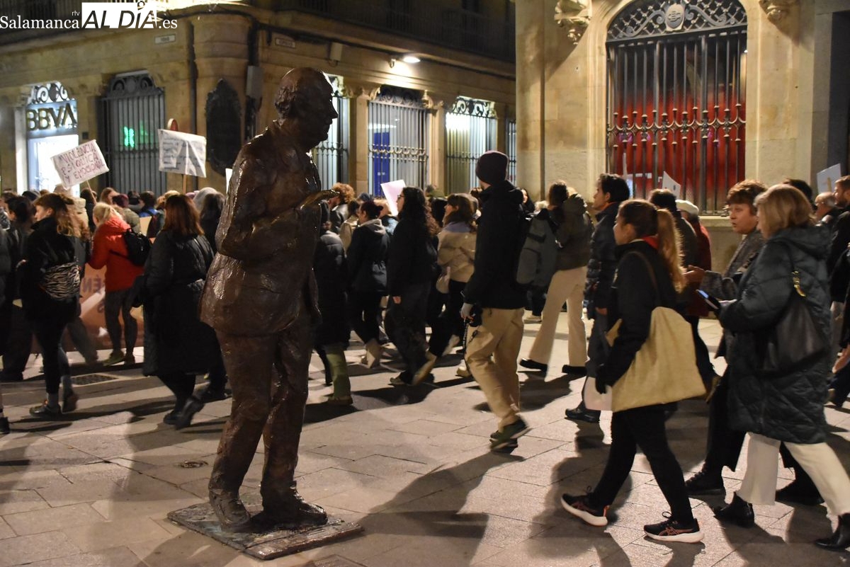 Numerosas personas, convocadas por el Movimiento Feminista de Salamanca, han recorrido este 25 de noviembre el centro de la ciudad en una masiva manifestación, que ha culminado en la Plaza Mayor con la lectura de un manifiesto que ha denunciado la violencia institucional y la 'justicia patriarcal'