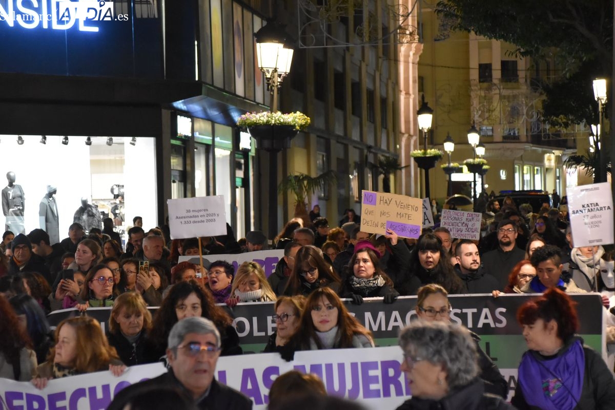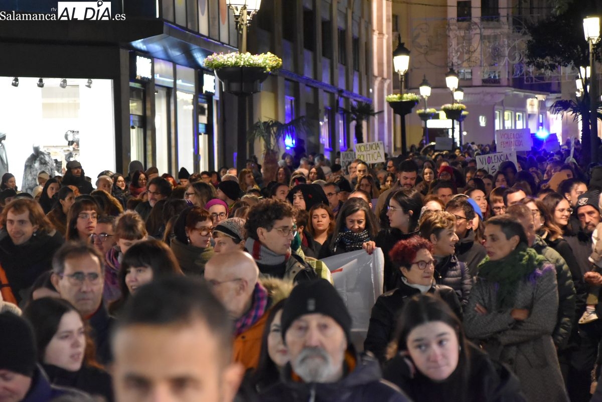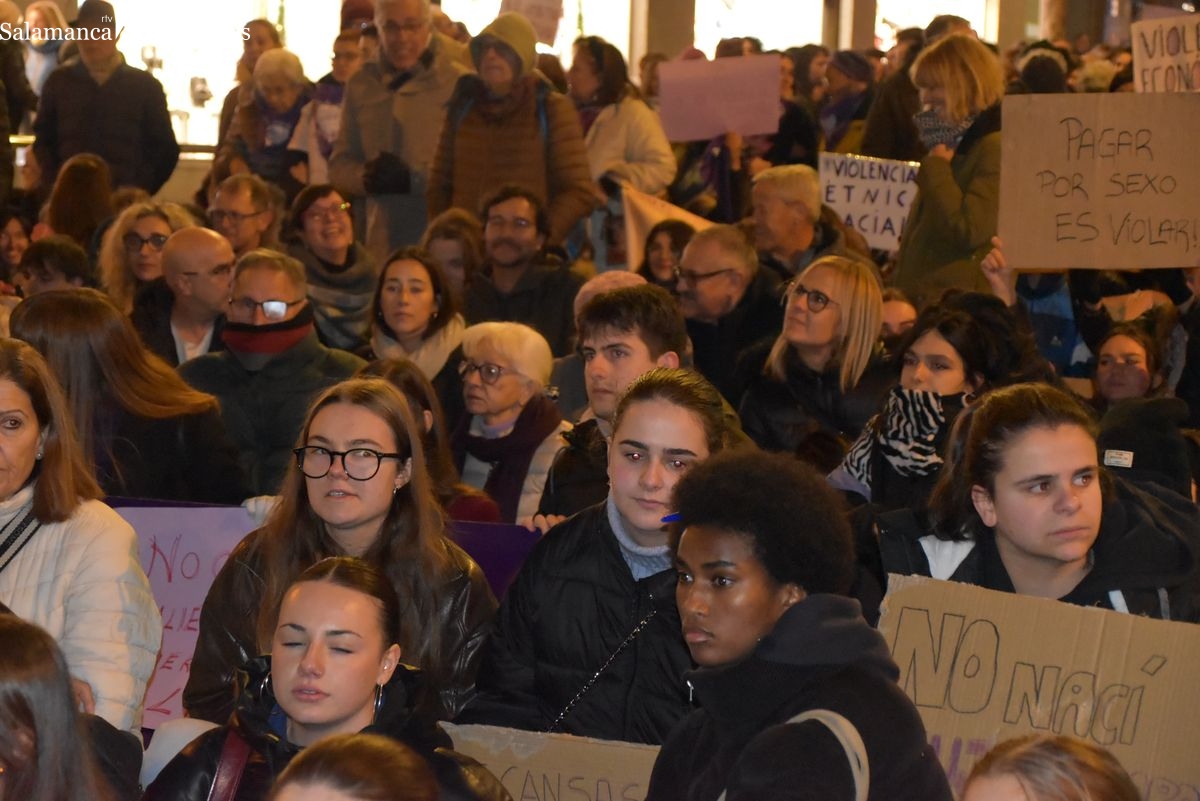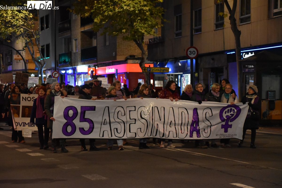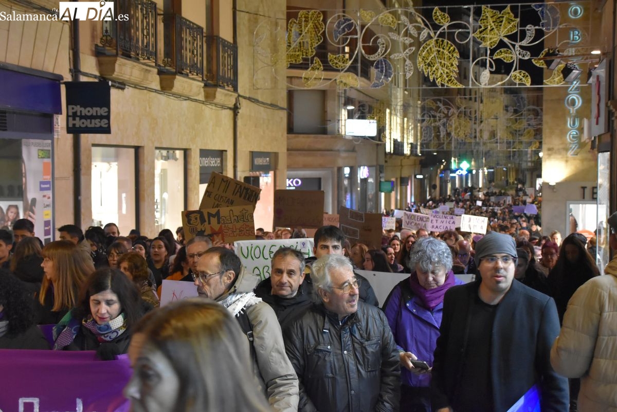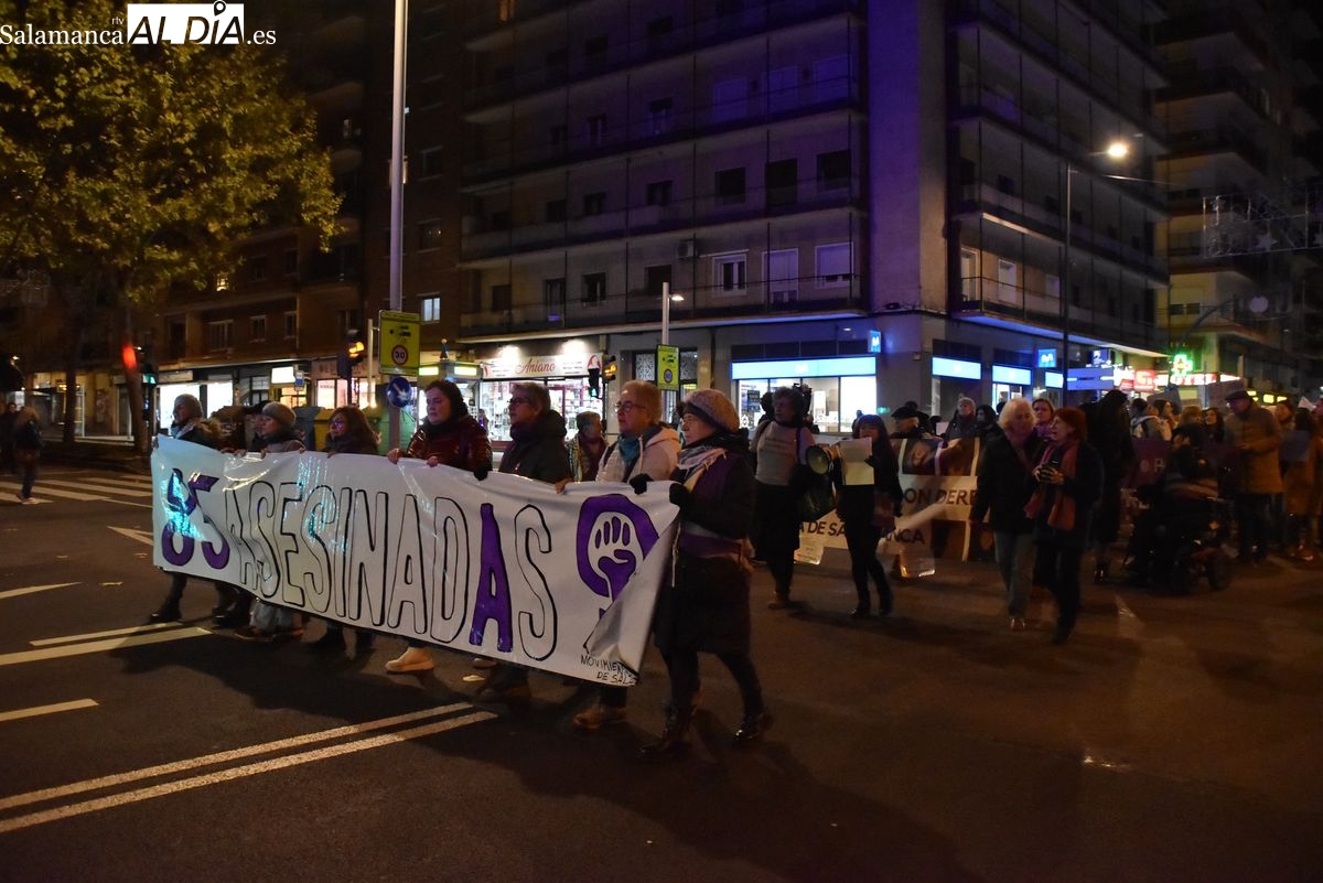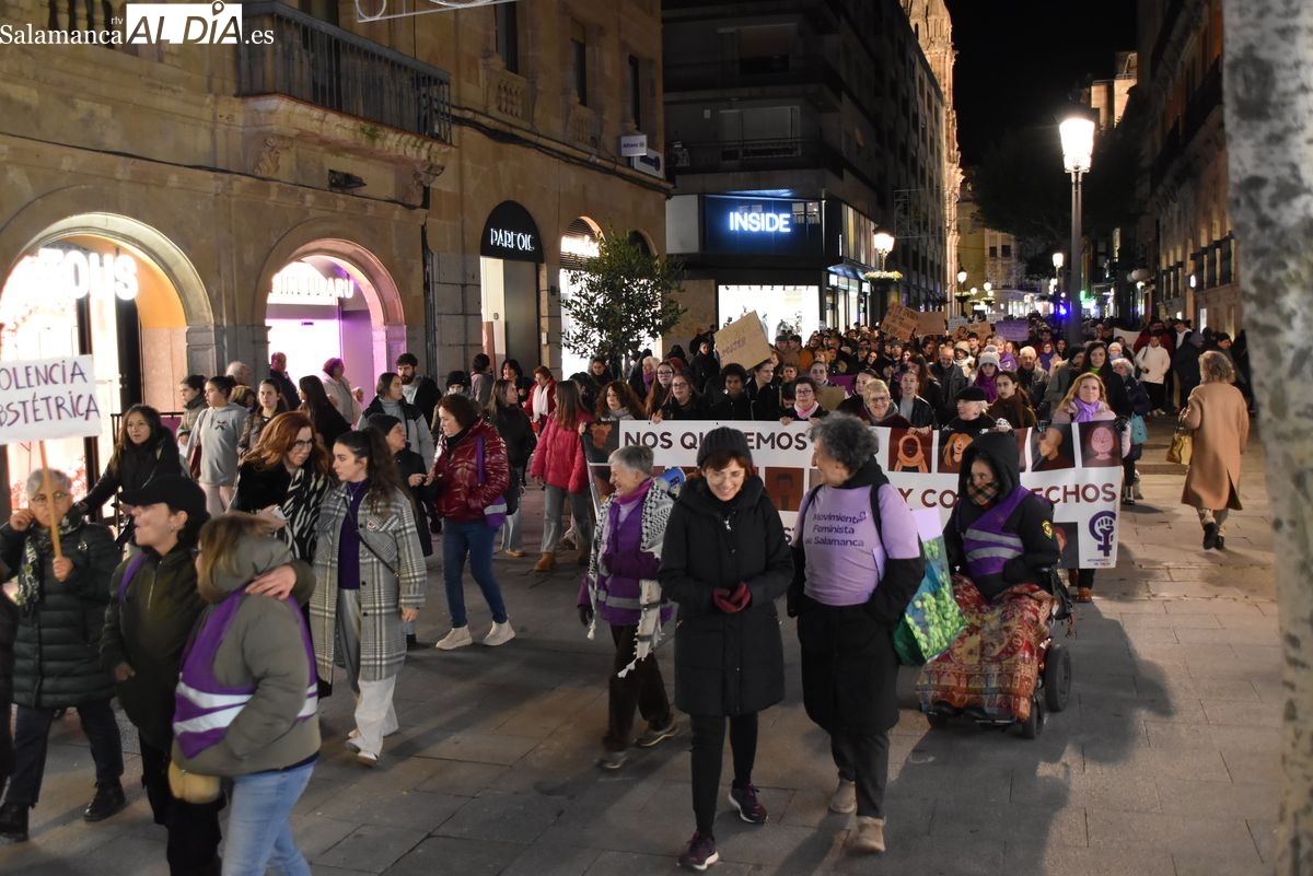 Numerosas personas, convocadas por el Movimiento Feminista de Salamanca, han recorrido este 25 de noviembre el centro de la ciudad en una masiva manifestación, que ha culminado en la Plaza Mayor con la lectura de un manifiesto que ha denunciado la violencia institucional y la 'justicia patriarcal'