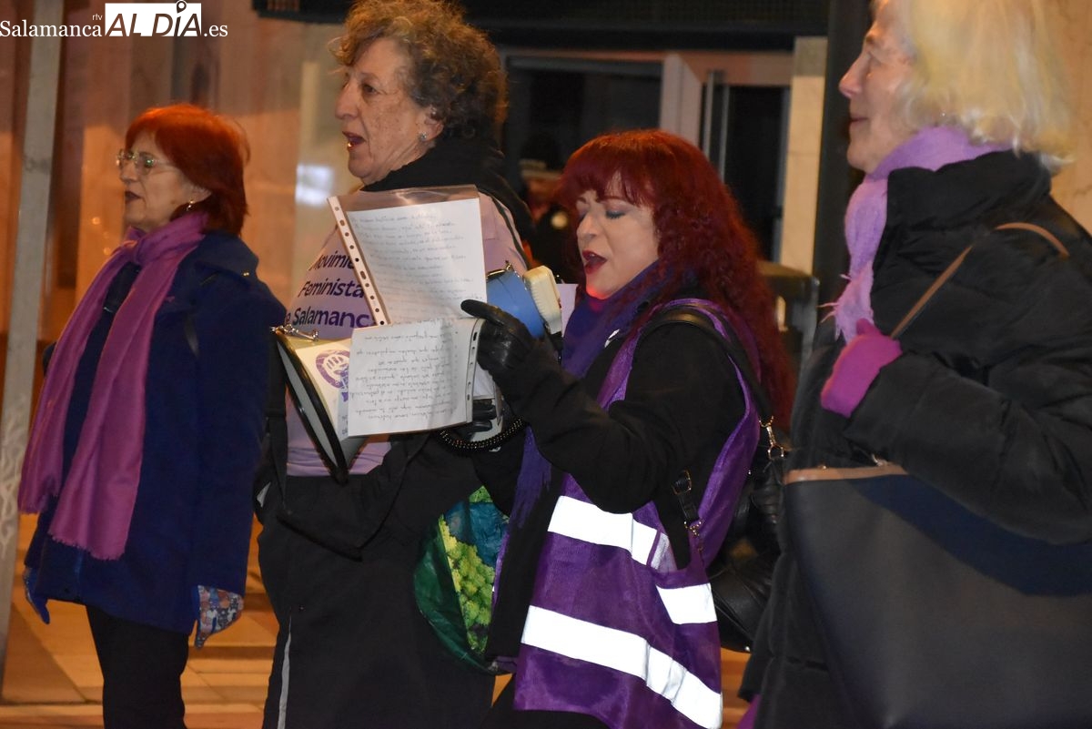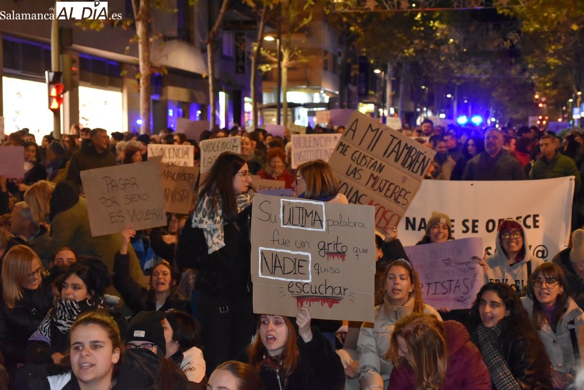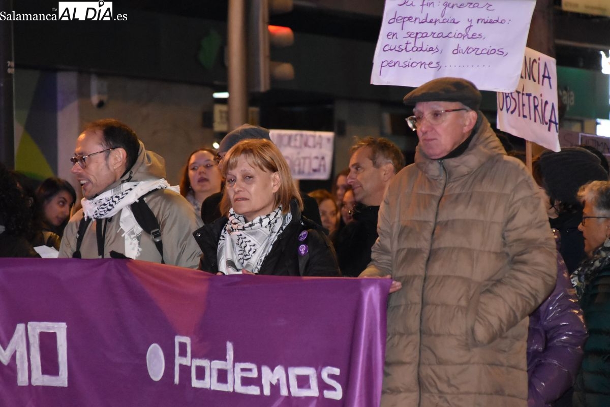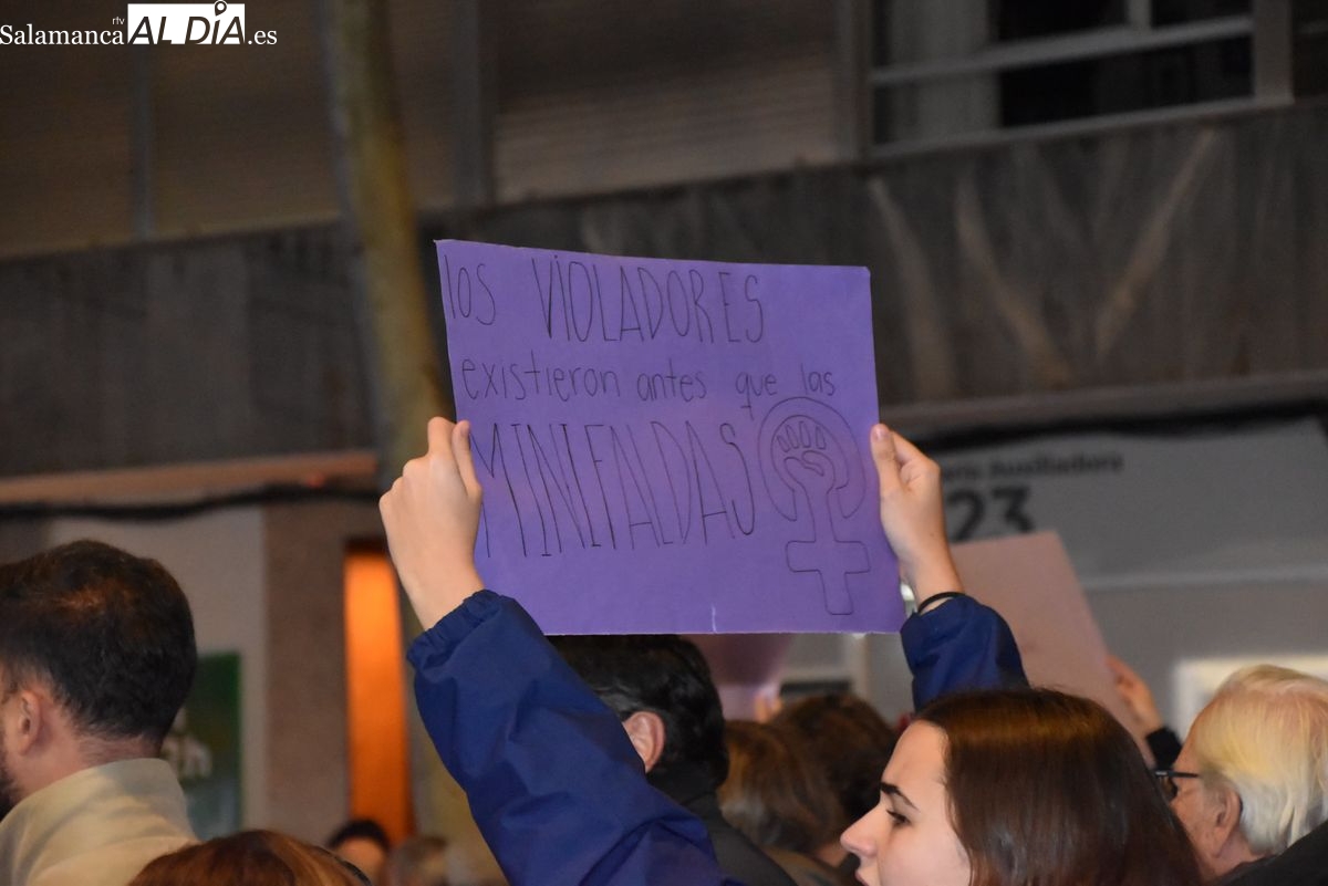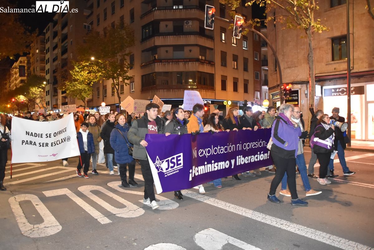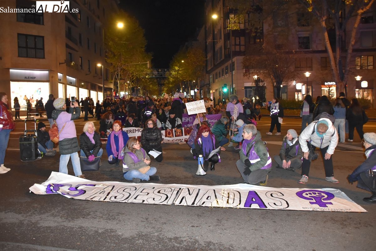 Numerosas personas, convocadas por el Movimiento Feminista de Salamanca, han recorrido este 25 de noviembre el centro de la ciudad en una masiva manifestación, que ha culminado en la Plaza Mayor con la lectura de un manifiesto que ha denunciado la violencia institucional y la 'justicia patriarcal'