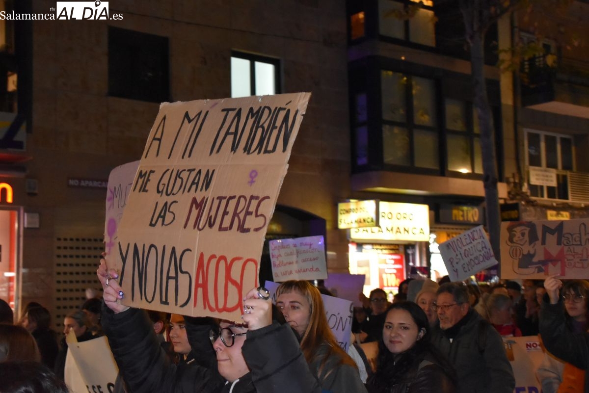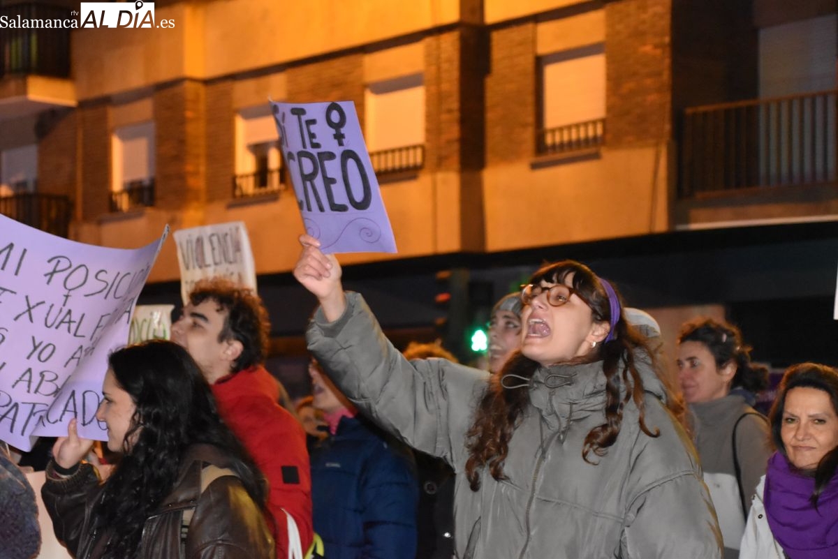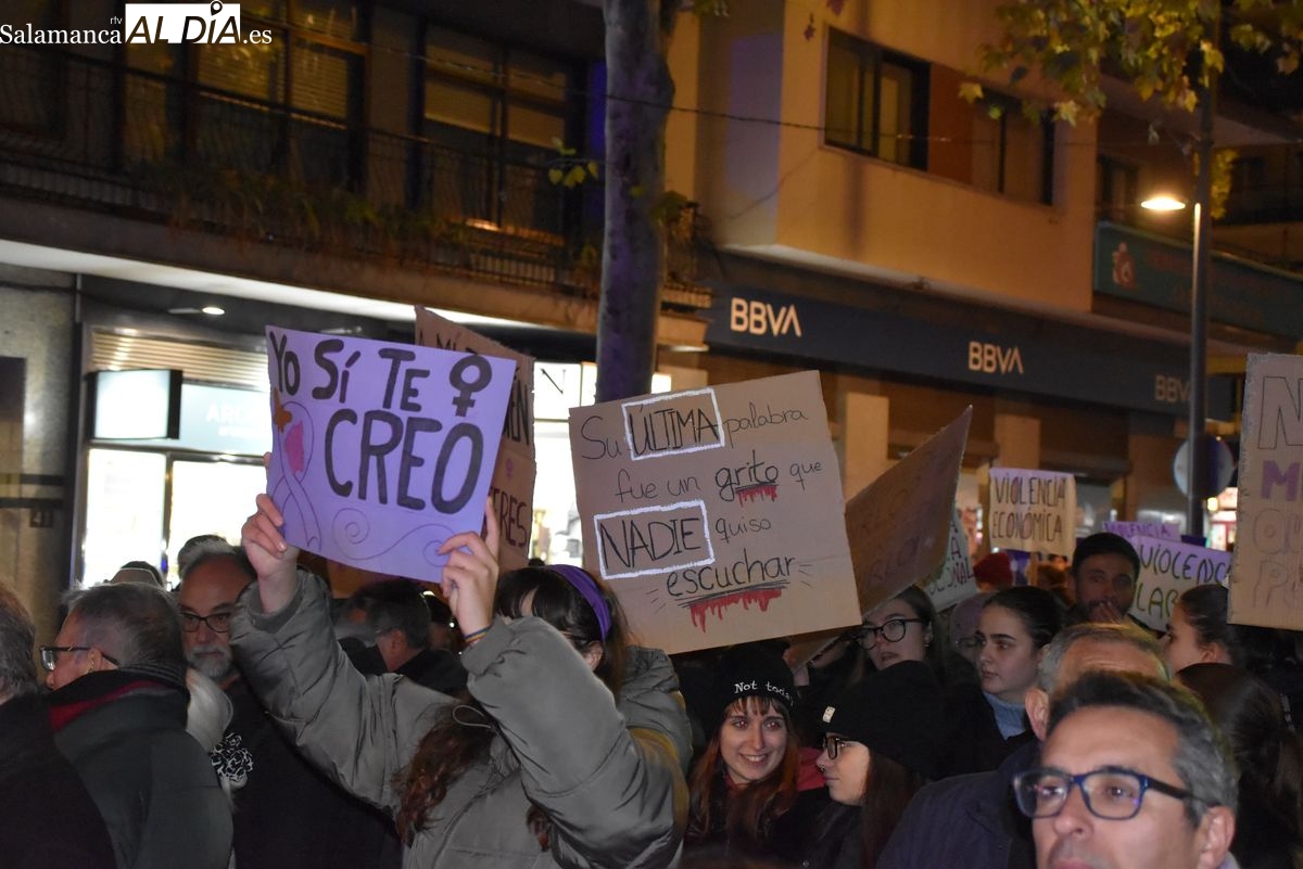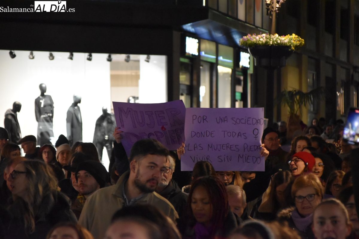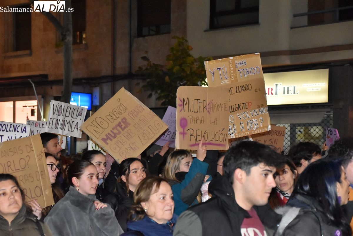 Alrededor de las 19:30 horas, la cabecera ha iniciado su recorrido. La manifestación ha descendido por la avenida de María Auxiliadora, ocupando la calzada con una larga columna de manifestantes que portaban carteles y coreaban lemas exigiendo seguridad y justicia. "No estamos solas, no nos callaremos más", ha sido uno de los mensajes repetidos a lo largo del trayecto, que ha continuado por la calle Toro hasta desembocar en el ágora salmantina.