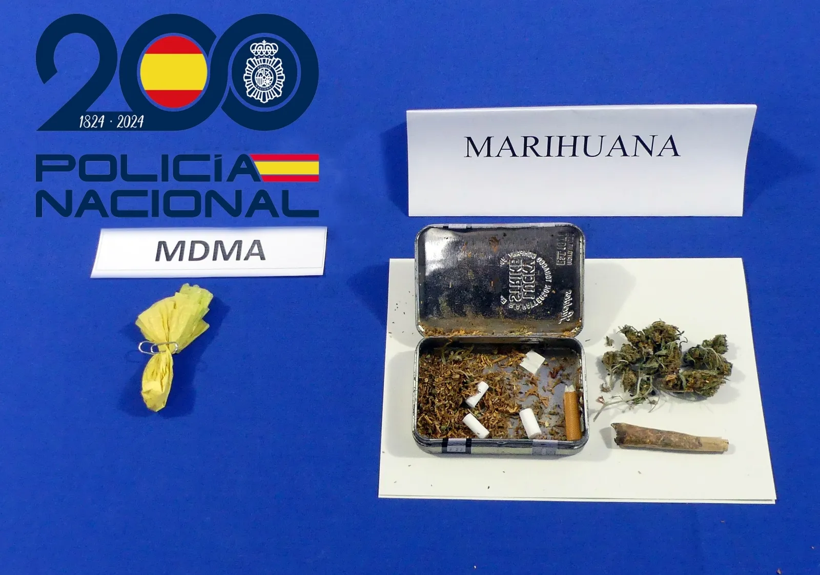 Ante esta situación, los efectivos policiales realizaron una inspección de seguridad de las pertenencias del sospechoso. Durante el registro, localizaron en un bolsillo del pantalón una bolsita de color amarillo que contenía 2,43 gramos de una sustancia pulverulenta blanquecina, al parecer MDMA. Asimismo, el varón portaba una riñonera en cuyo interior se halló una caja metálica verde con 1,8 gramos de marihuana y un cigarro tipo 'porro' elaborado con dicha sustancia vegetal.