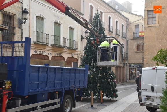 Al mismo tiempo que los trabajadores de Agustín Casado SL continuaban desplegando el alumbrado navideño de Ciudad Rodrigo (por ejemplo en la Plazuela del Buen Alcalde), operarios del Ayuntamiento mirobrigense se encargaron durante la mañana del miércoles de levantar el ya clásico árbol de Navidad del centro de la calle Madrid. Como en años previos, este árbol cuenta con tiras de leds que lo recorren de arriba abajo, así como con múltiples adornos creados por niños en Navidades precedentes.