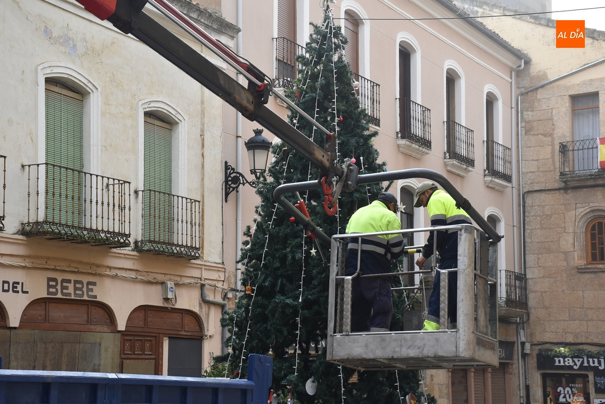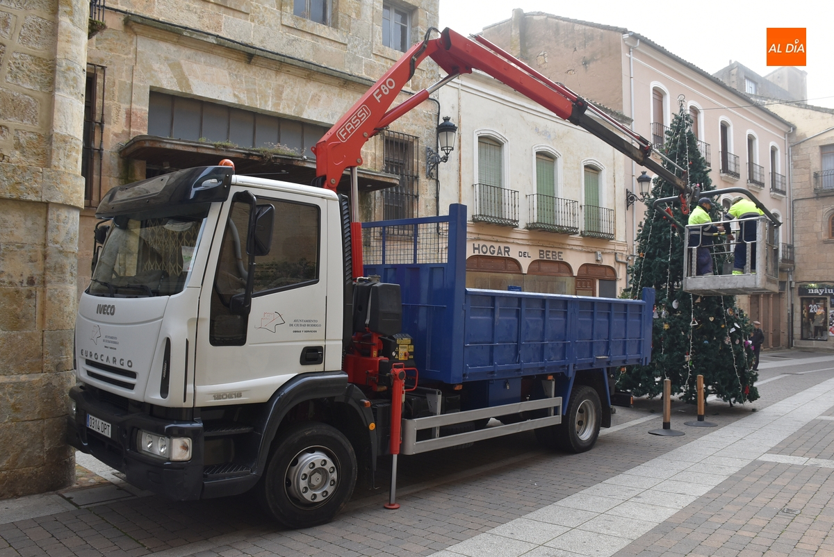 Al mismo tiempo que los trabajadores de Agustín Casado SL continuaban desplegando el alumbrado navideño de Ciudad Rodrigo (por ejemplo en la Plazuela del Buen Alcalde), operarios del Ayuntamiento mirobrigense se encargaron durante la mañana del miércoles de levantar el ya clásico árbol de Navidad del centro de la calle Madrid. Como en años previos, este árbol cuenta con tiras de leds que lo recorren de arriba abajo, así como con múltiples adornos creados por niños en Navidades precedentes.