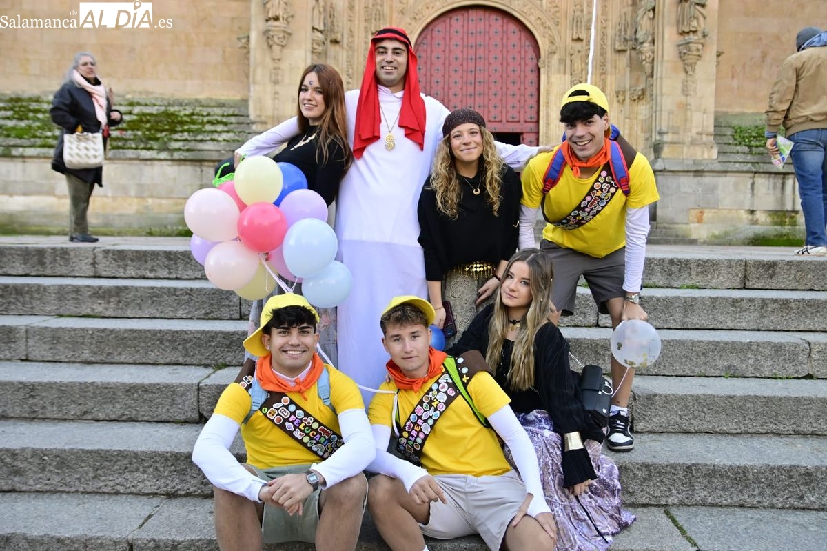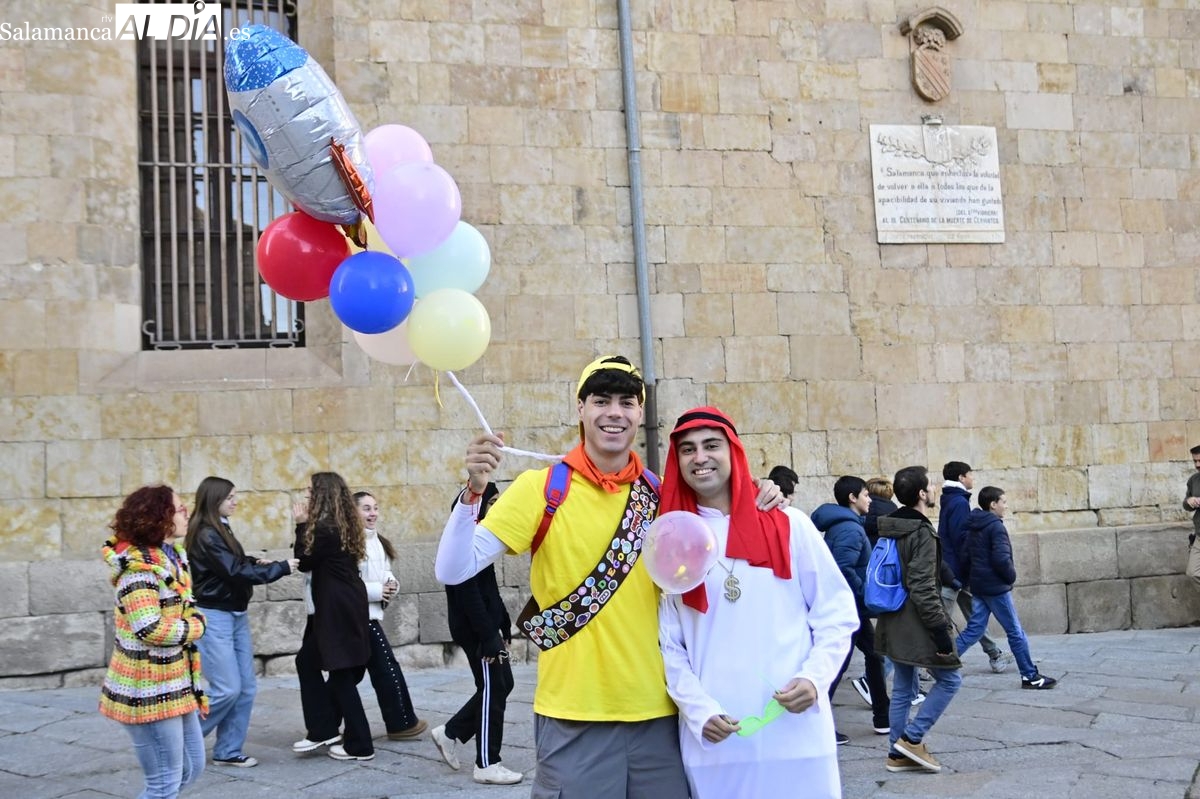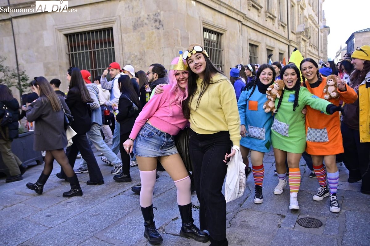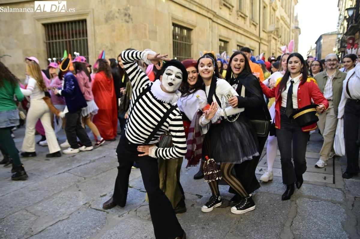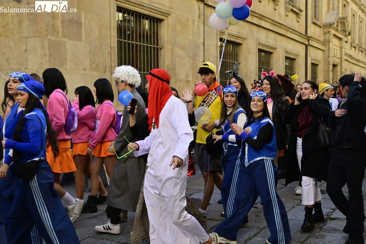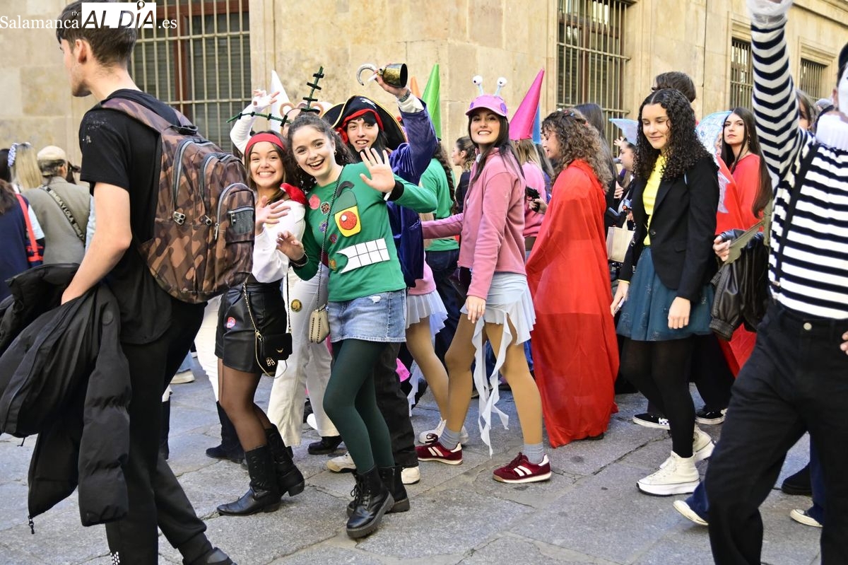 Los estudiantes de la Facultad de Educación de la Universidad de Salamanca (USAL) han celebrado hoy la jornada principal de sus festividades universitarias. El ambiente festivo se ha trasladado desde las aulas hasta las calles del casco histórico, donde grupos de alumnos han protagonizado el tradicional recorrido acompañados por la música de una charanga y ataviados con disfraces de diversas temáticas.