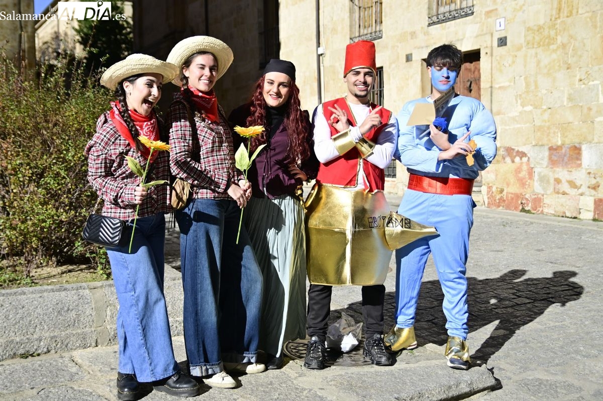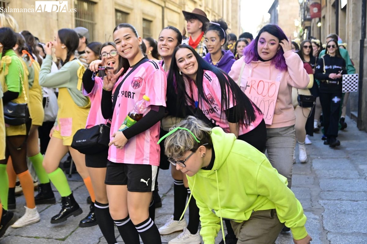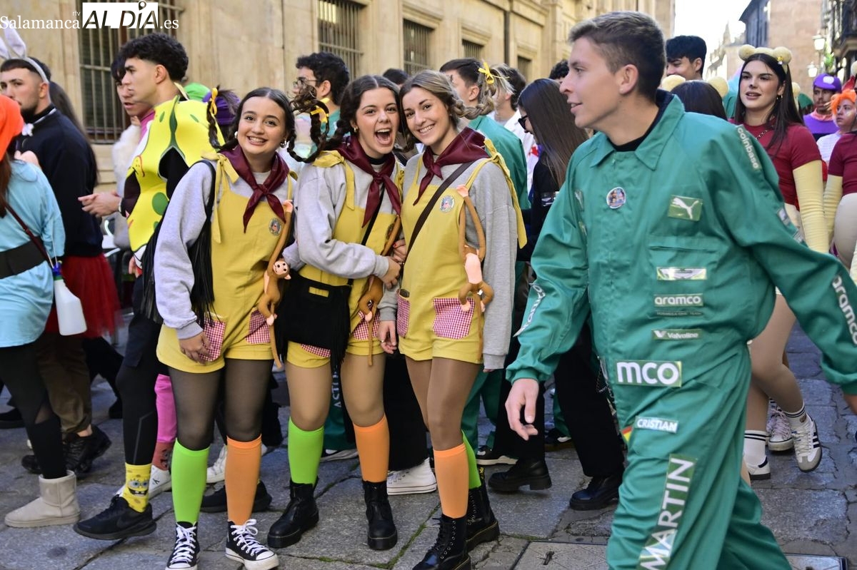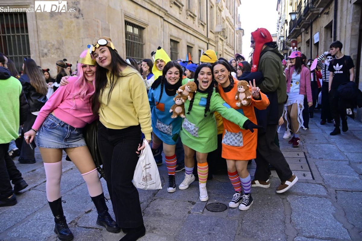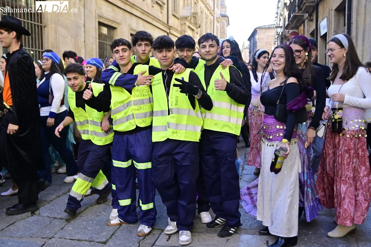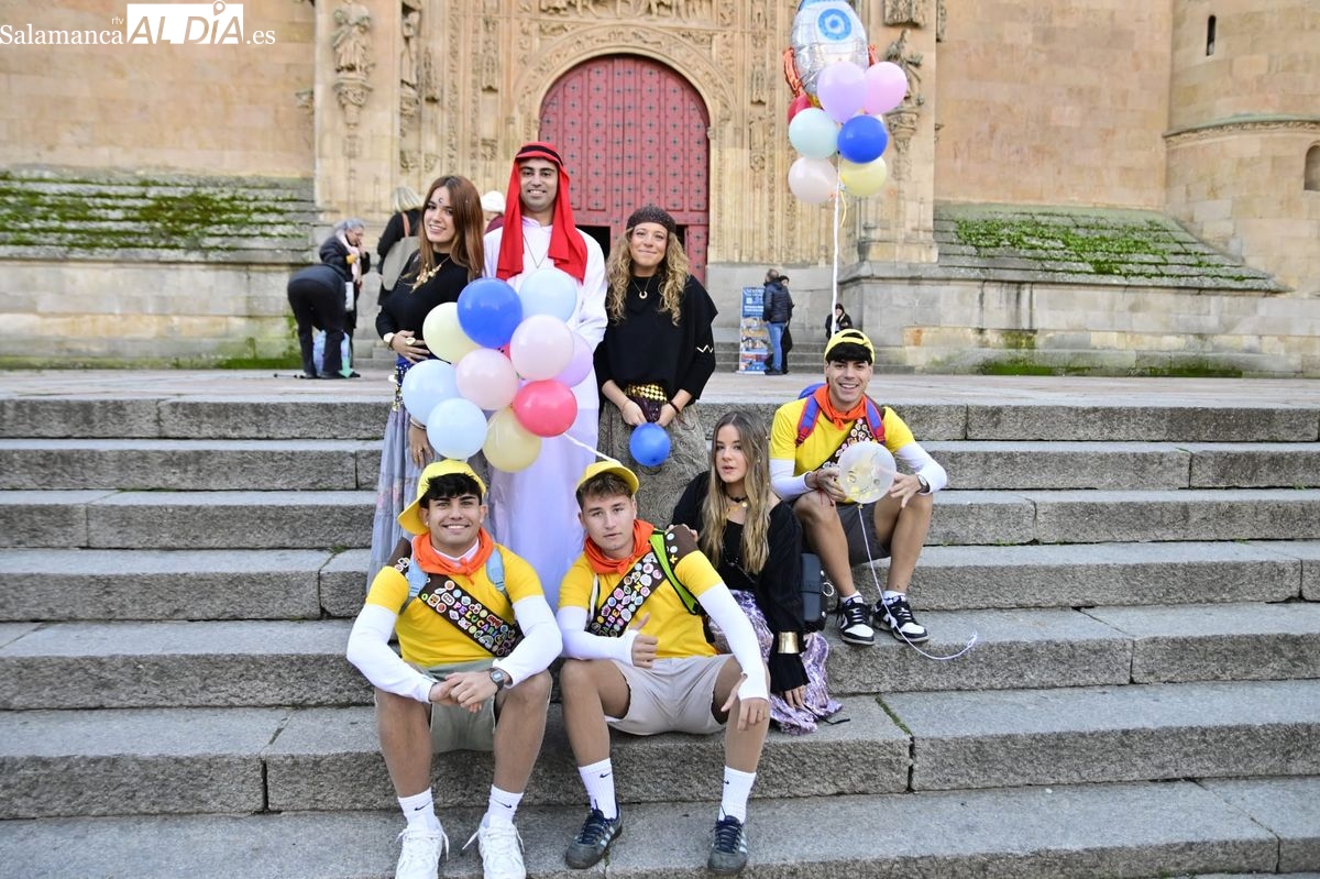 Los estudiantes de la Facultad de Educación de la Universidad de Salamanca (USAL) han celebrado hoy la jornada principal de sus festividades universitarias. El ambiente festivo se ha trasladado desde las aulas hasta las calles del casco histórico, donde grupos de alumnos han protagonizado el tradicional recorrido acompañados por la música de una charanga y ataviados con disfraces de diversas temáticas.