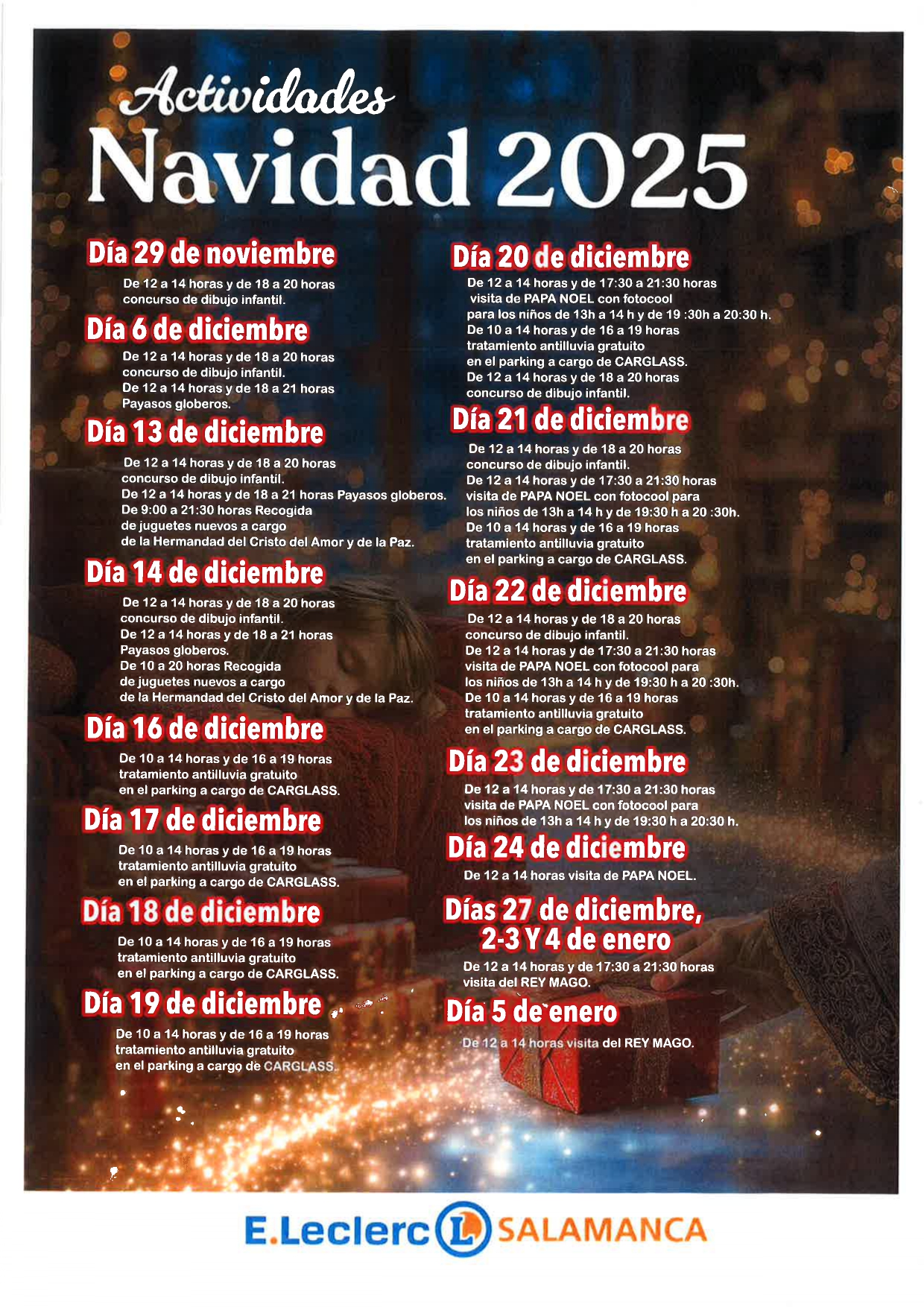 E.Leclerc Salamanca inaugura su programación navideña 2025 con un abanico de actividades familiares que incluye concursos infantiles, visitas de personajes navideños y acciones solidarias. Las propuestas se desarrollarán durante las próximas semanas en la galería comercial.