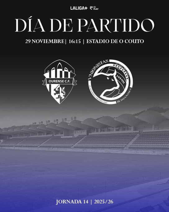 ¡Saludos y bienvenidos a la retransmisión en directo del Ourense - Unionistas! Desde SALAMANCArtv AL DÍA te contamos todo lo que pase en el partido y así no te pierdes absolutamente nada gracias a nuestro minuto a minuto. El balón comenzará a rodar en el Reina Sofía a partir de las 16:15 horas en la jornada 14 de Liga de Primera Federación.