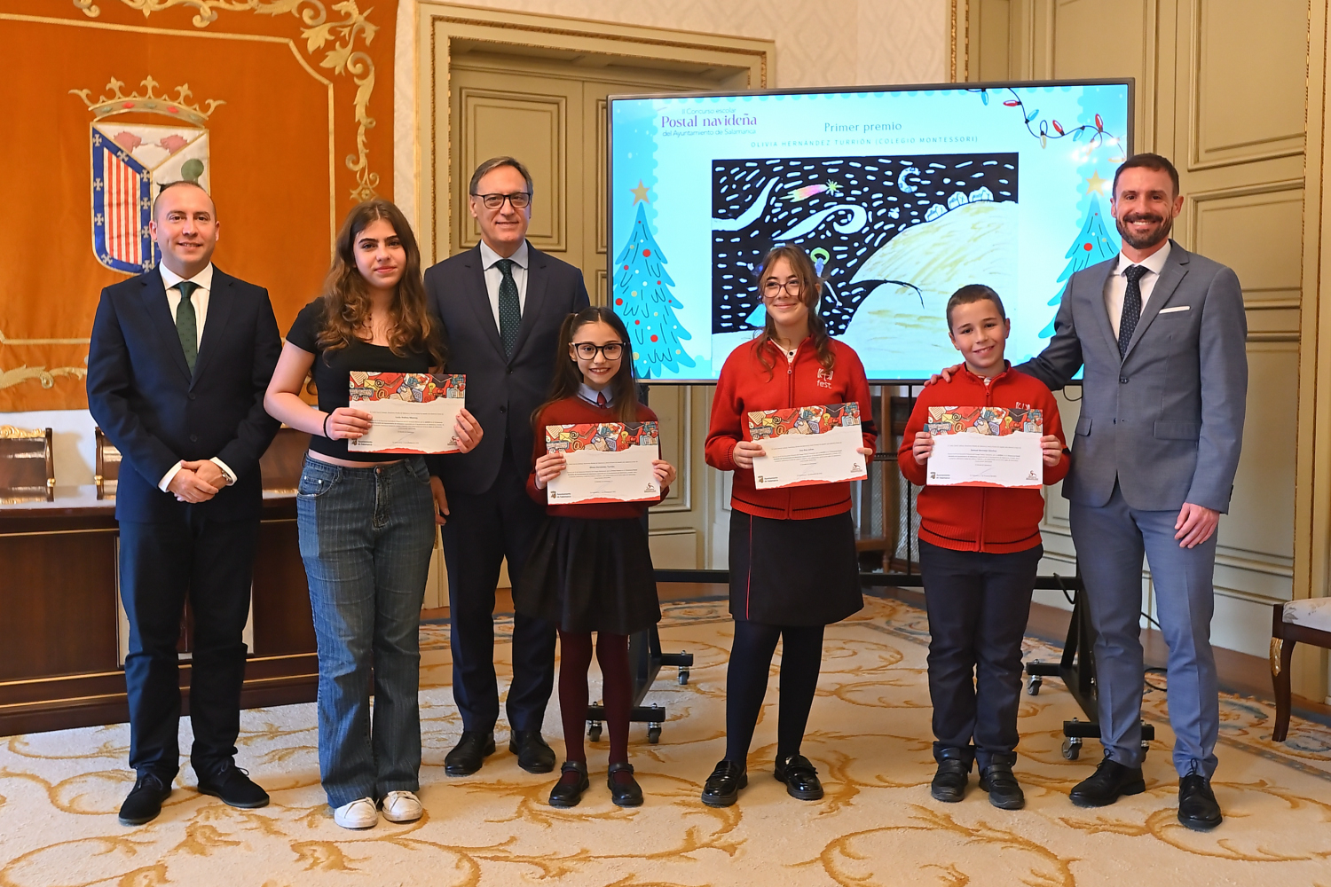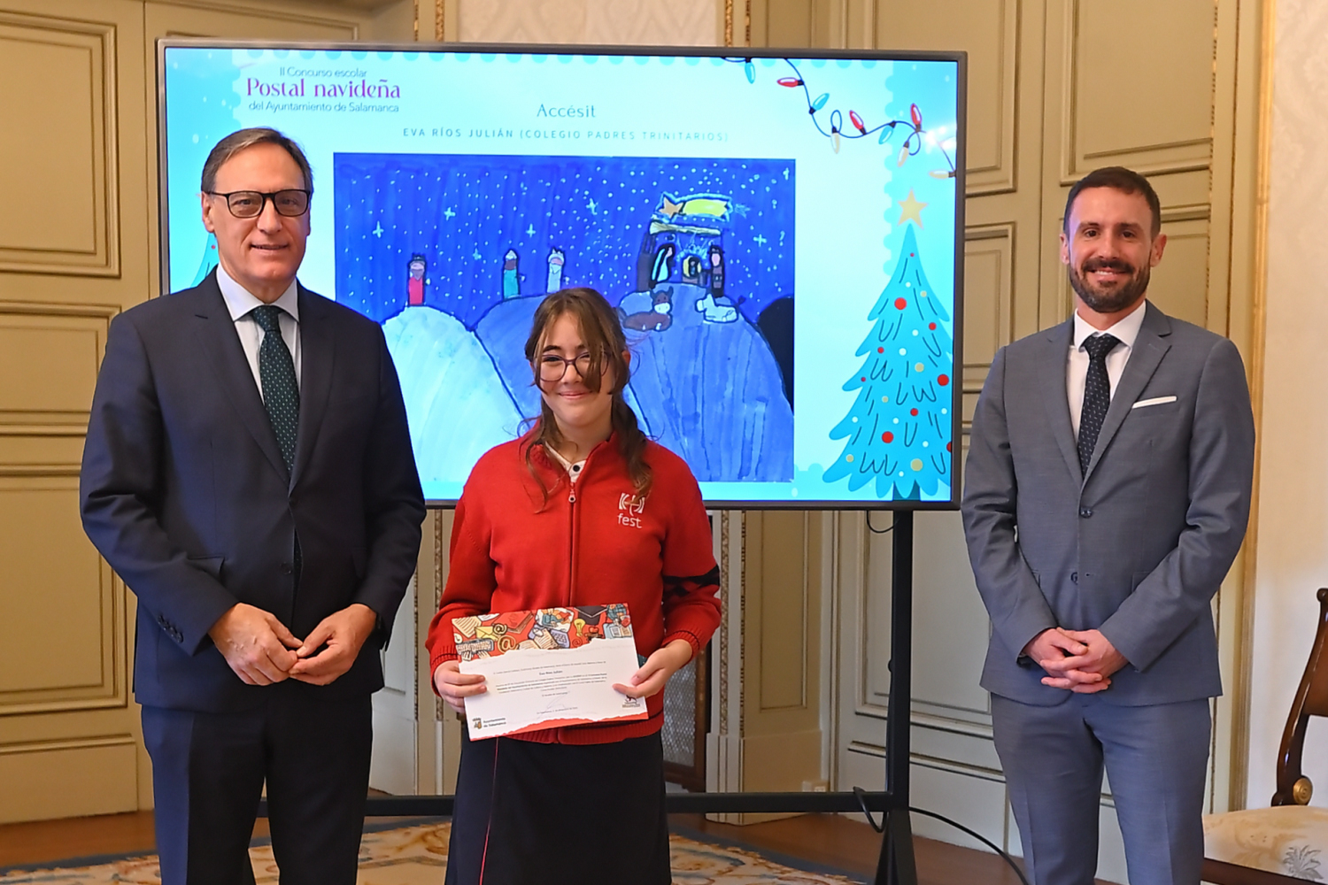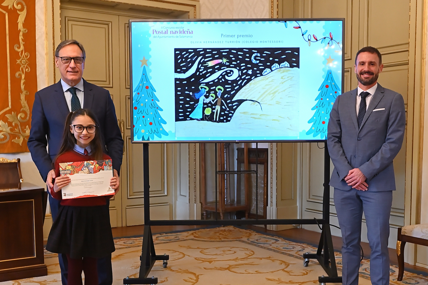Olivia Hernández Turrión, estudiante del colegio Montessori, se ha alzado con el primer premio de la segunda edición del concurso escolar 'Postal Navideña'. El alcalde de Salamanca, Carlos García Carbayo, ha hecho entrega de los galardones esta mañana en un acto que pone en valor la creatividad de los escolares salmantinos.