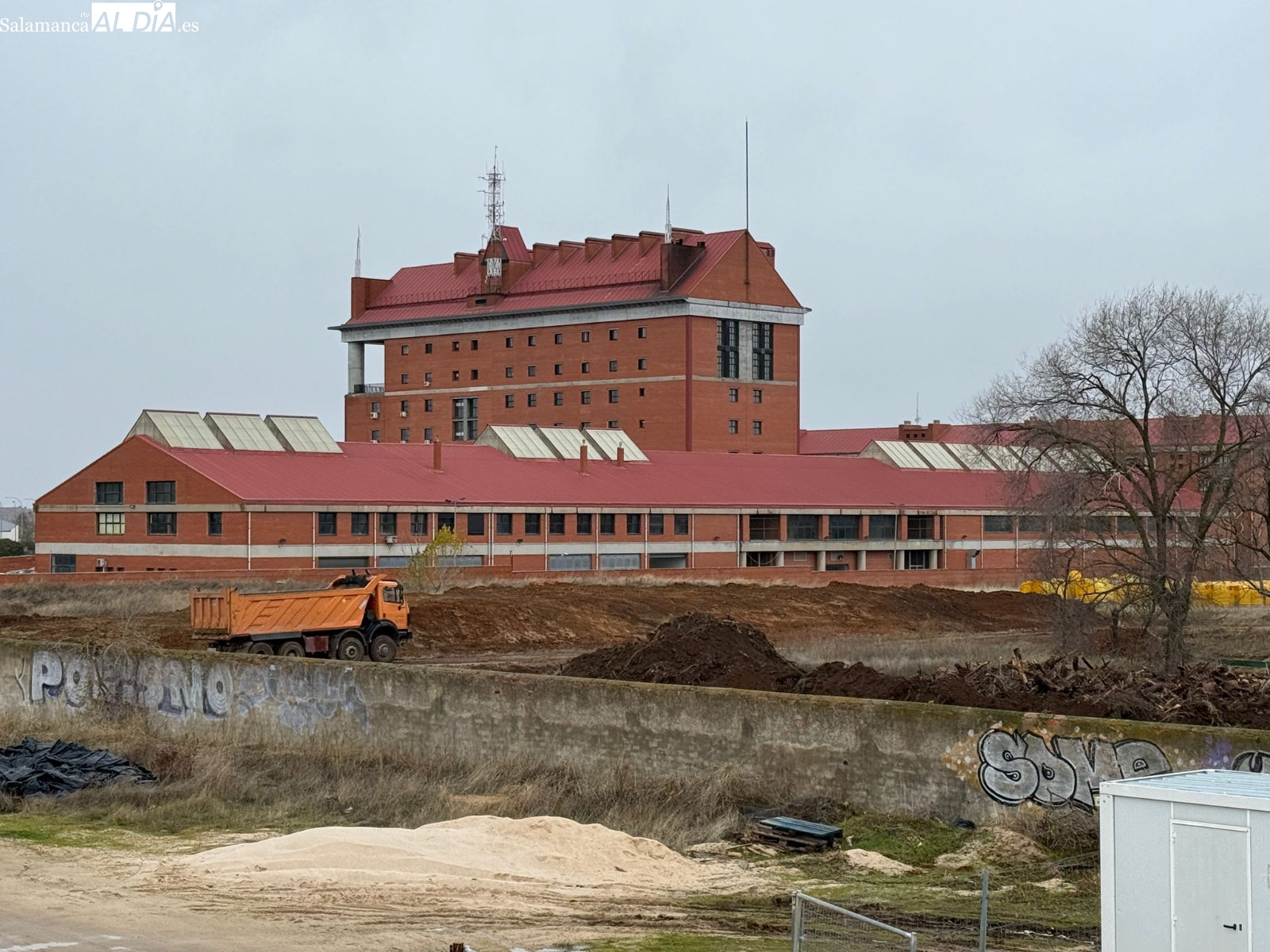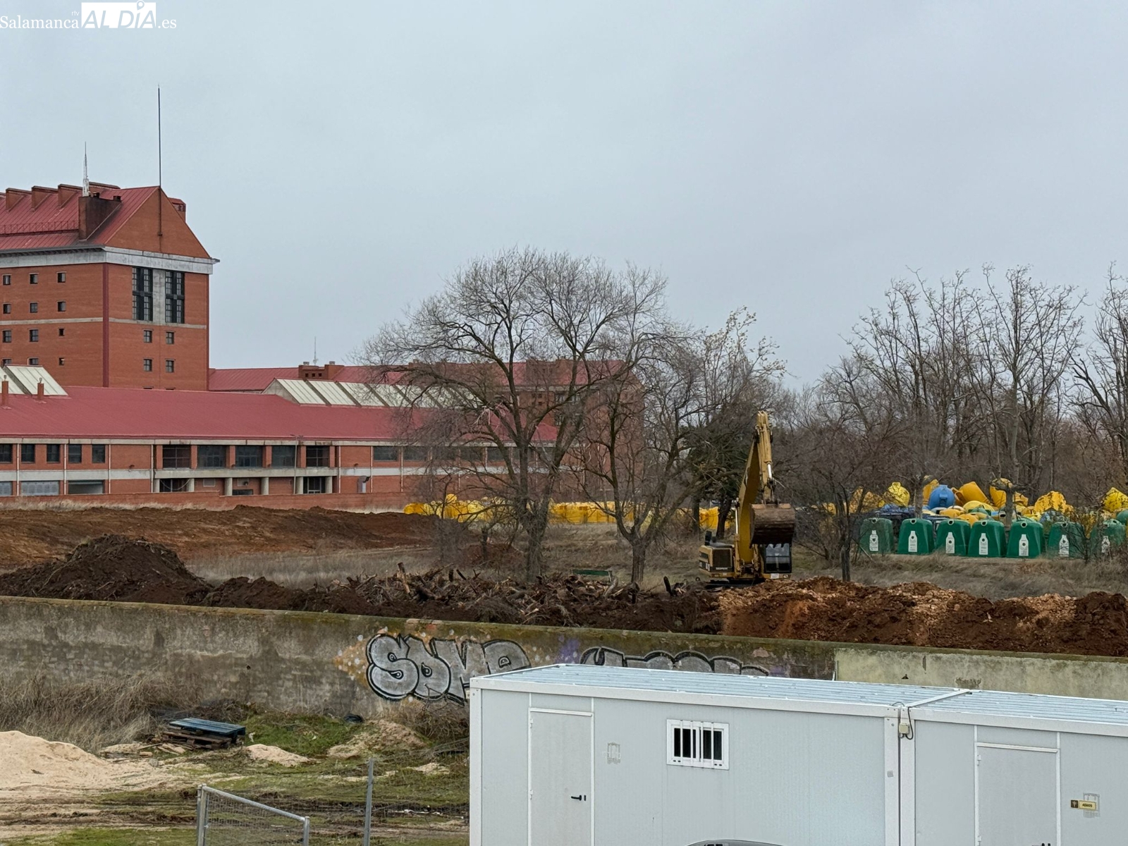 Las mejoras para el segundo acceso al Reina Sofía han continuado en esta lluviosa mañana con la excavadora trabajando en la zona, aunque aún queda mucho por hacer. Por último, el césped, cuidado por Hermaflor, se encuentra en buen estado pese al mal clima.