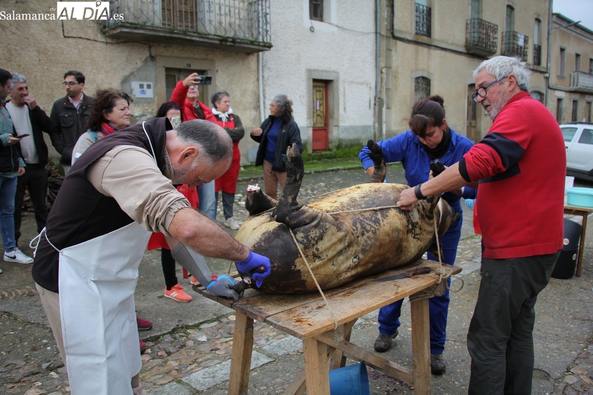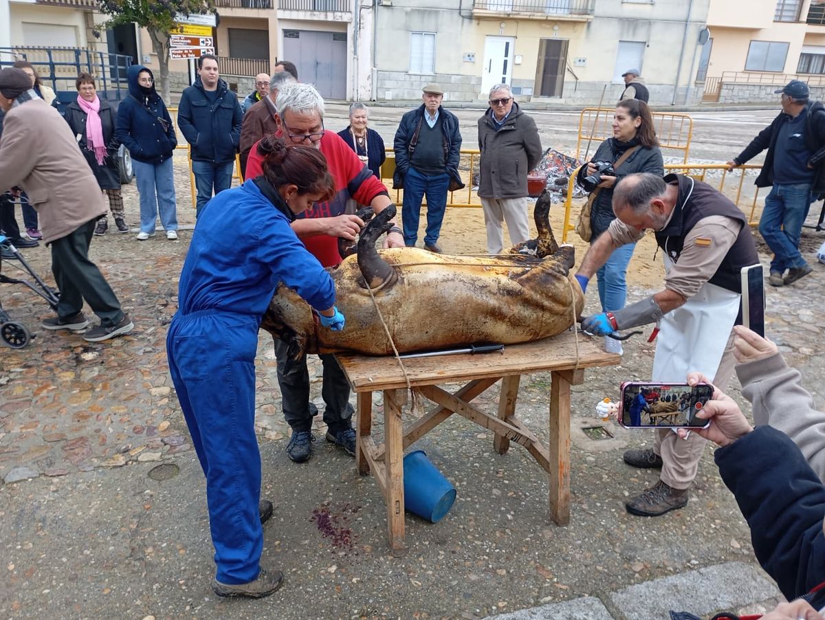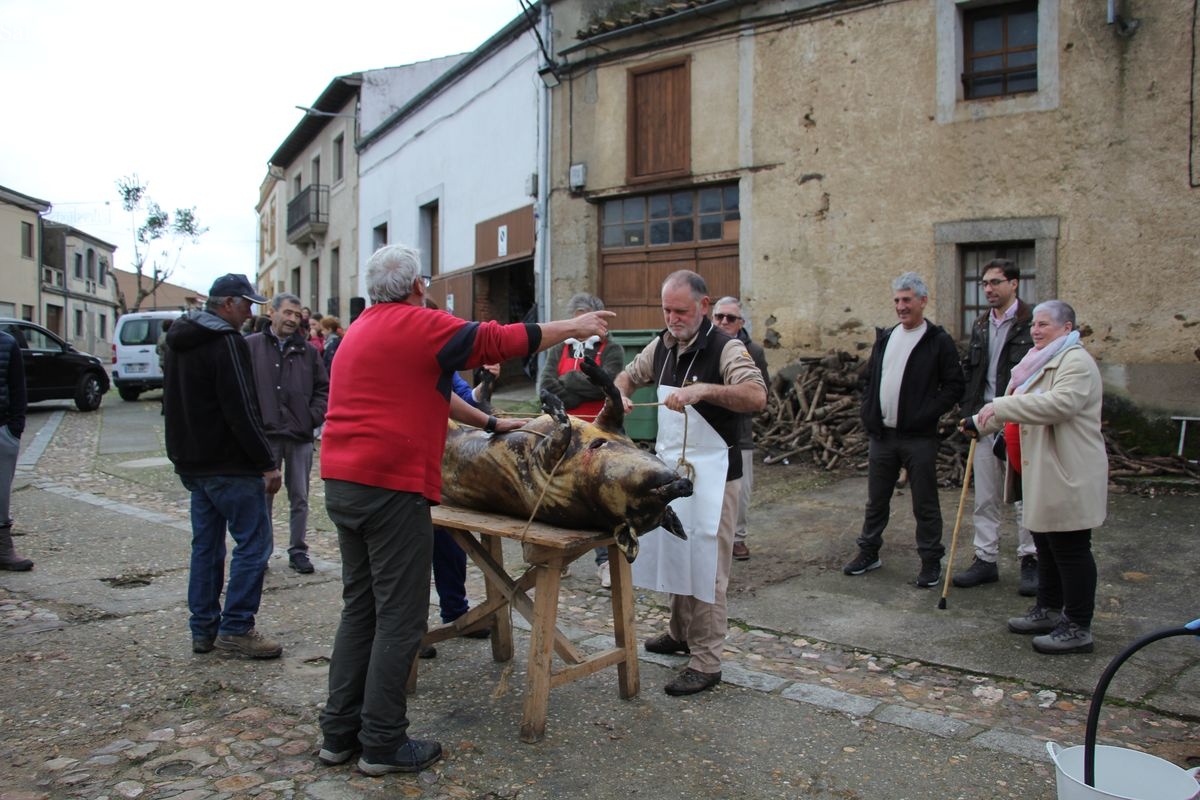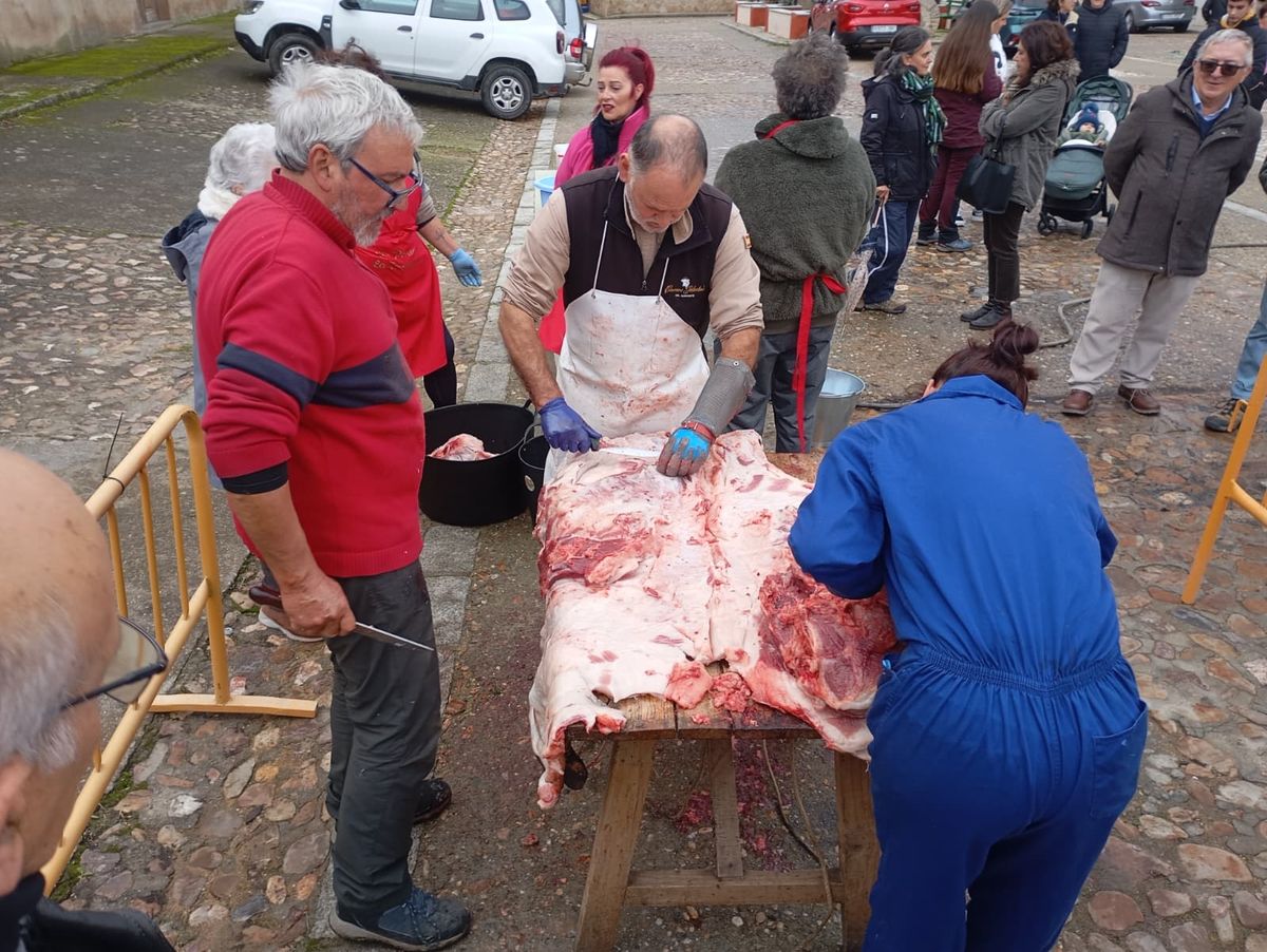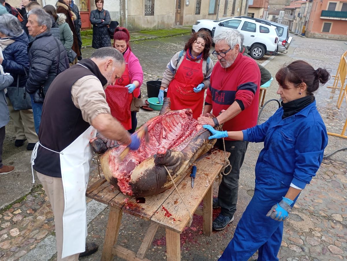 De este modo, la jornada comenzaba con un desayuno a base de dulces y aguardiente para dar la bienvenida a los participantes y prepararlos para el frío de la mañana. El acto central era el despiece del cebón, un momento que tenía como protagonista a Nerea Caballero y a un grupo de voluntarios, que daban cuenta del cebón para llevar las carnes a los varardeles.
