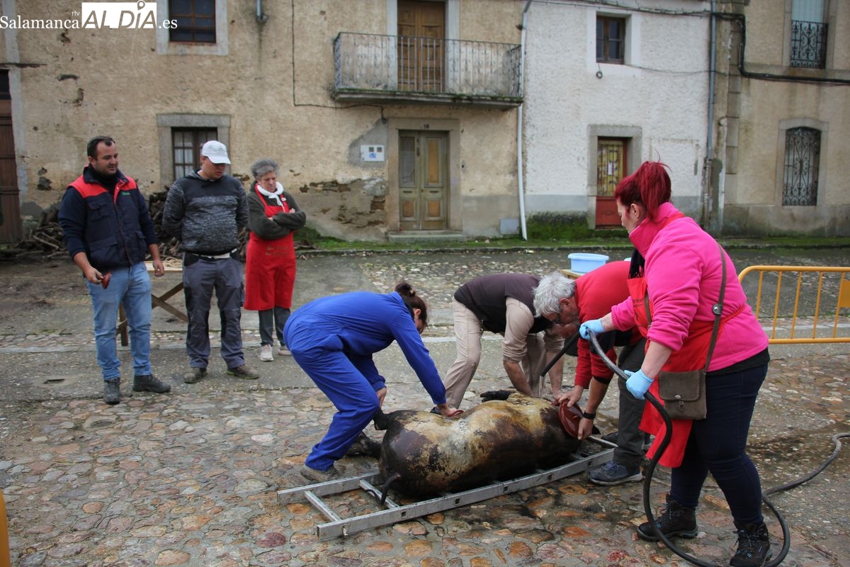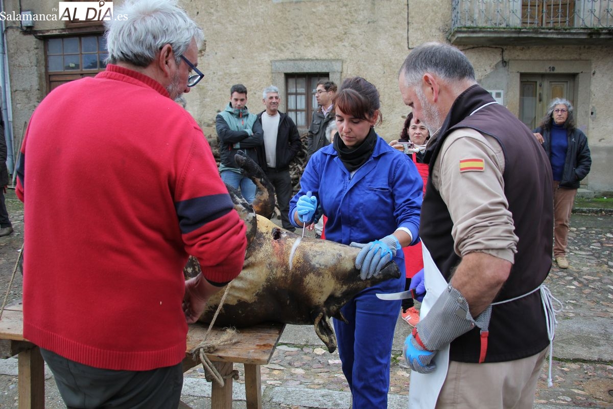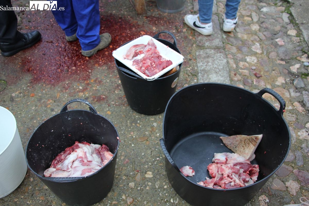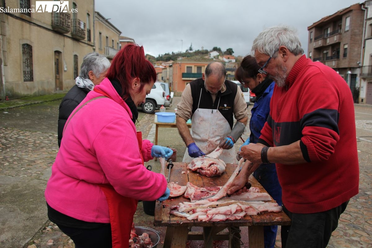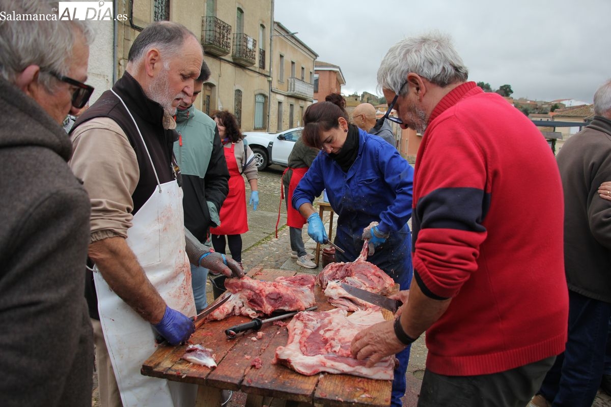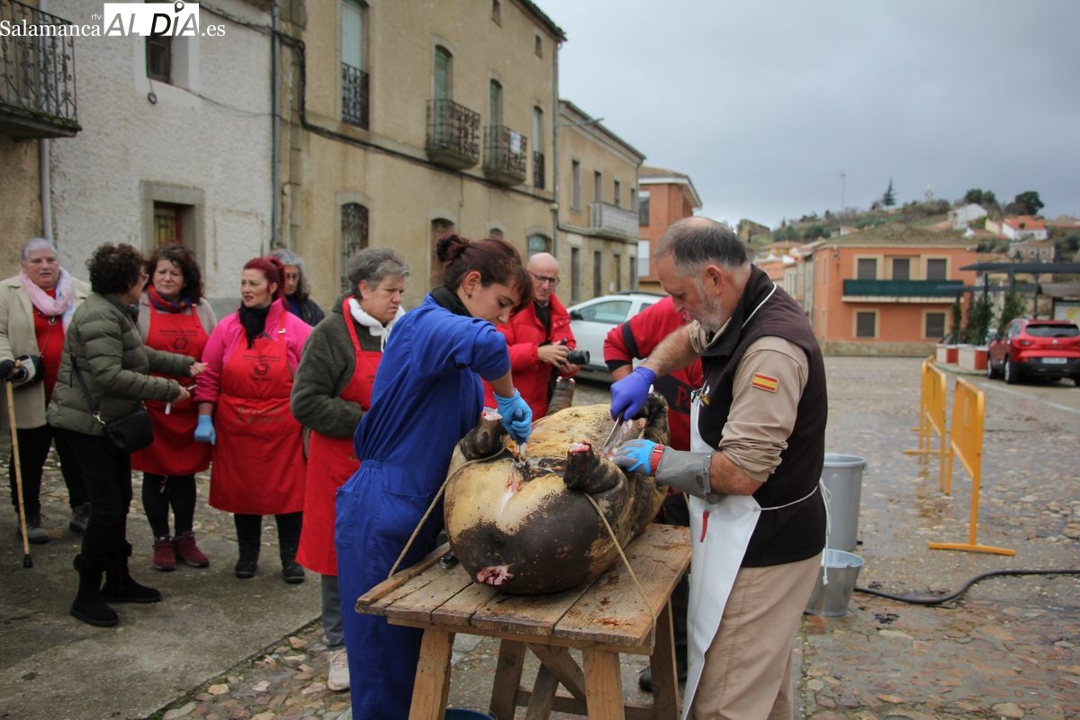 De este modo, la jornada comenzaba con un desayuno a base de dulces y aguardiente para dar la bienvenida a los participantes y prepararlos para el frío de la mañana. El acto central era el despiece del cebón, un momento que tenía como protagonista a Nerea Caballero y a un grupo de voluntarios, que daban cuenta del cebón para llevar las carnes a los varardeles.