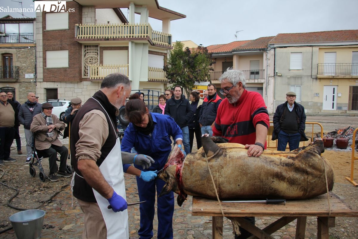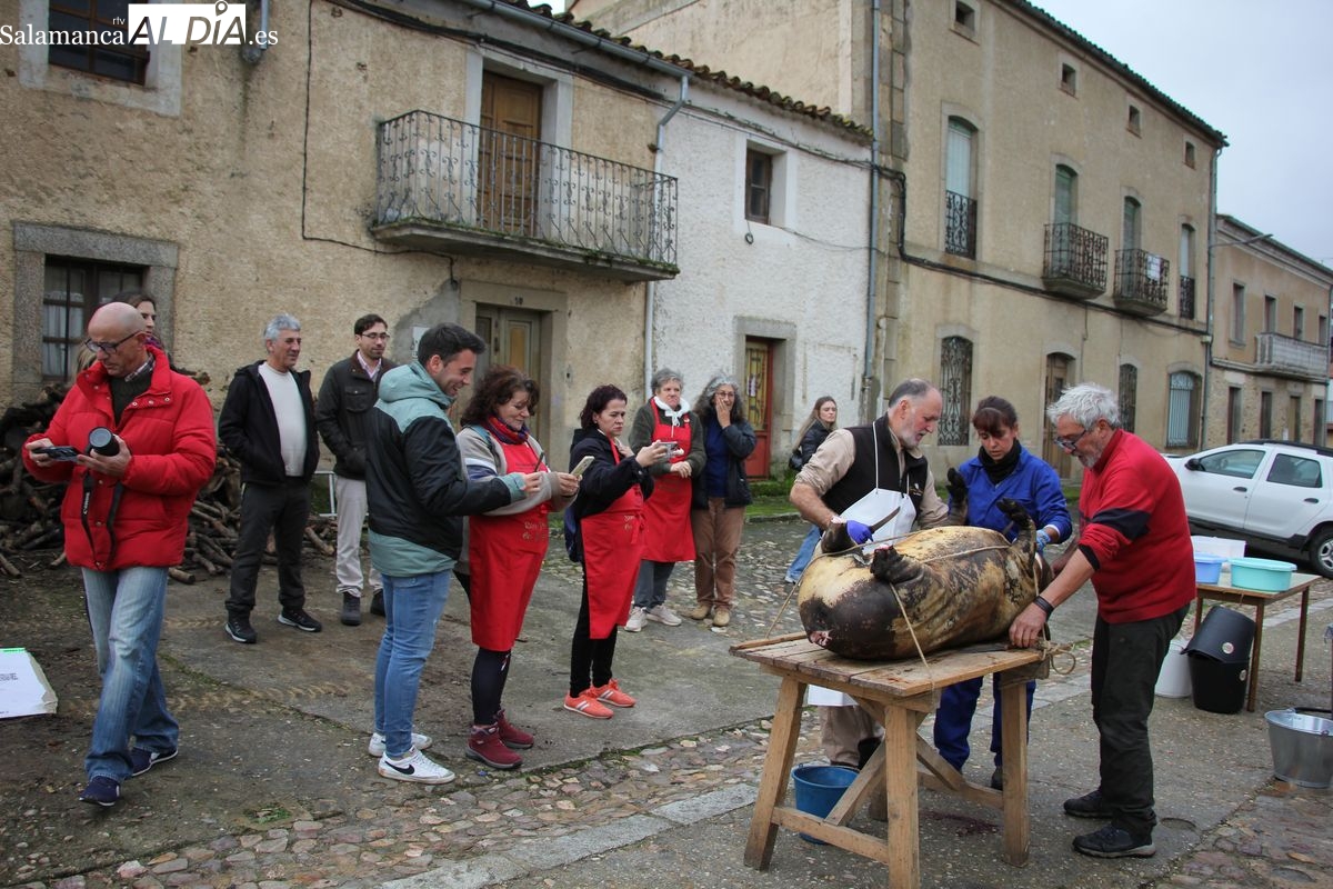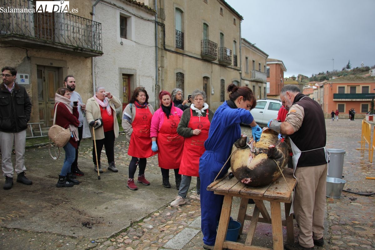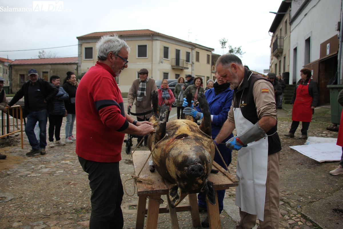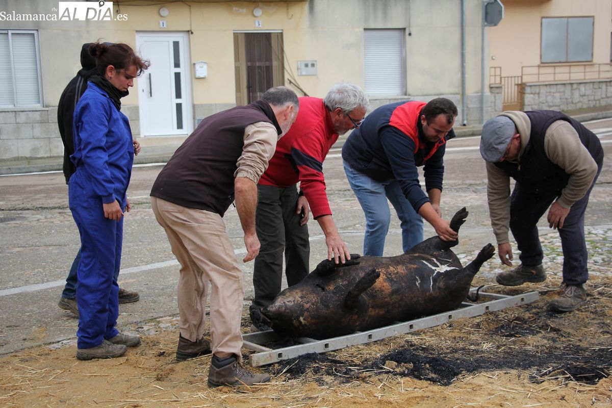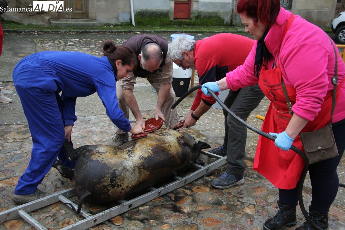 De este modo, la jornada comenzaba con un desayuno a base de dulces y aguardiente para dar la bienvenida a los participantes y prepararlos para el frío de la mañana. El acto central era el despiece del cebón, un momento que tenía como protagonista a Nerea Caballero y a un grupo de voluntarios, que daban cuenta del cebón para llevar las carnes a los varardeles.