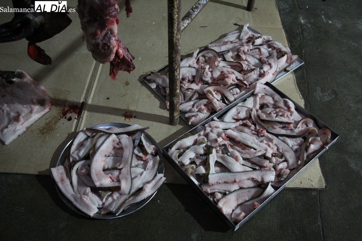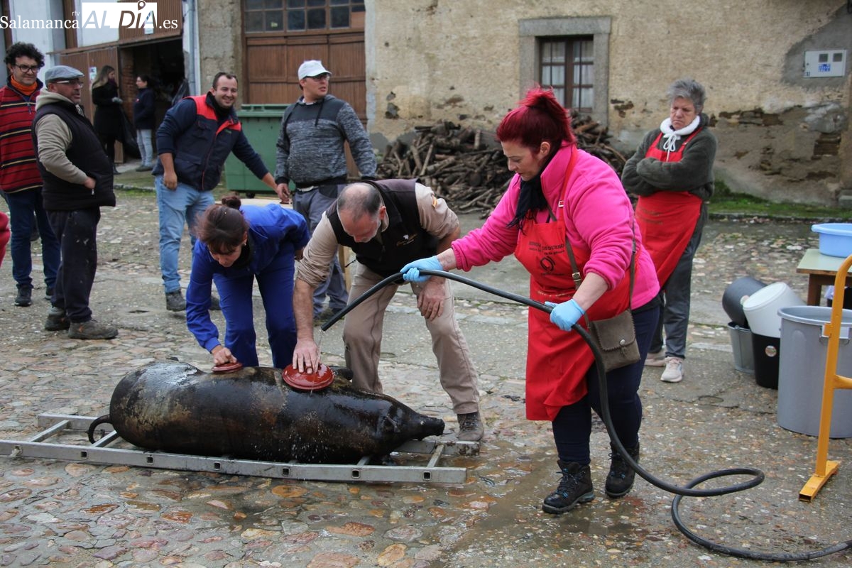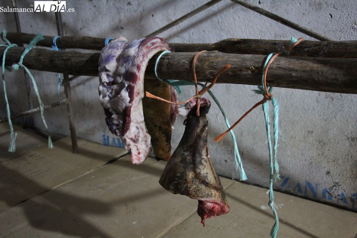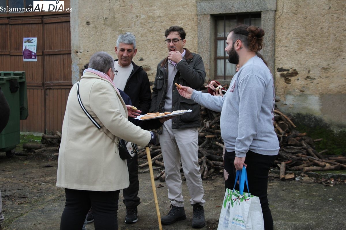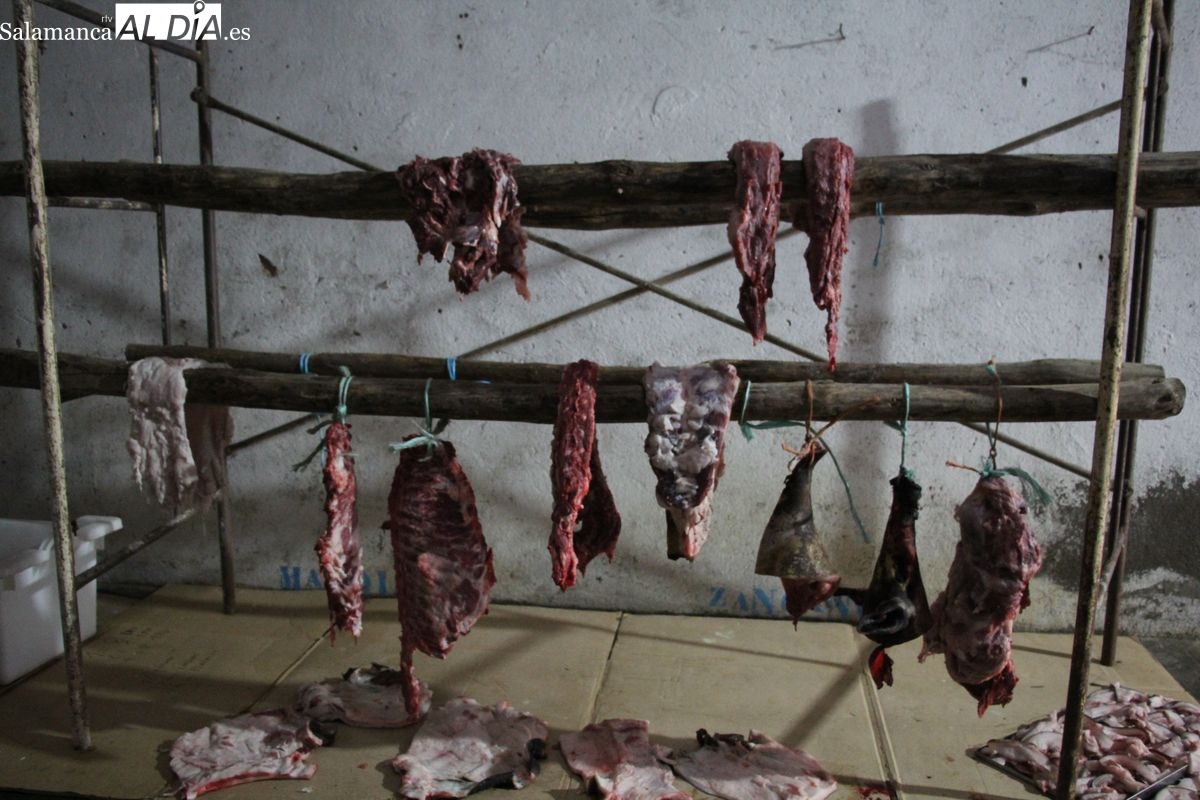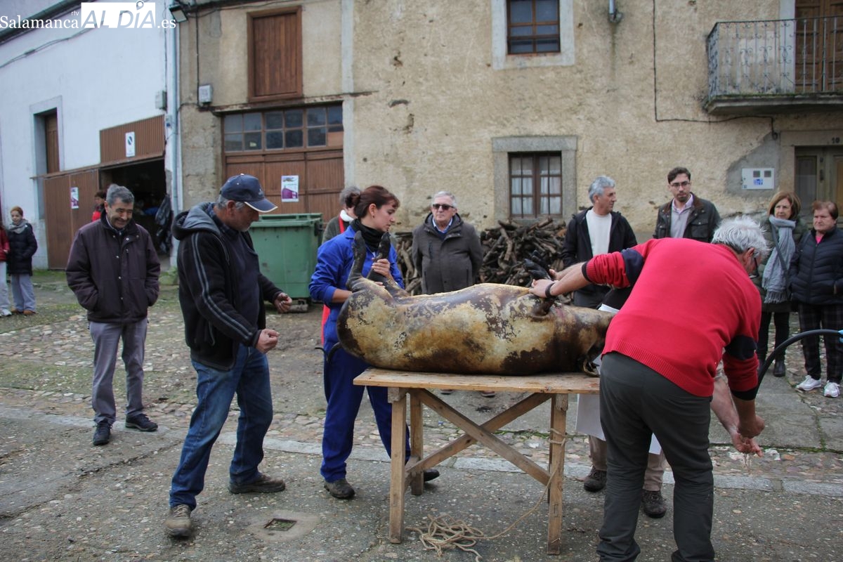 De este modo, la jornada comenzaba con un desayuno a base de dulces y aguardiente para dar la bienvenida a los participantes y prepararlos para el frío de la mañana. El acto central era el despiece del cebón, un momento que tenía como protagonista a Nerea Caballero y a un grupo de voluntarios, que daban cuenta del cebón para llevar las carnes a los varardeles.
