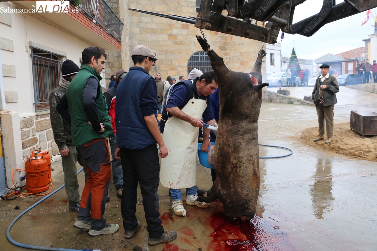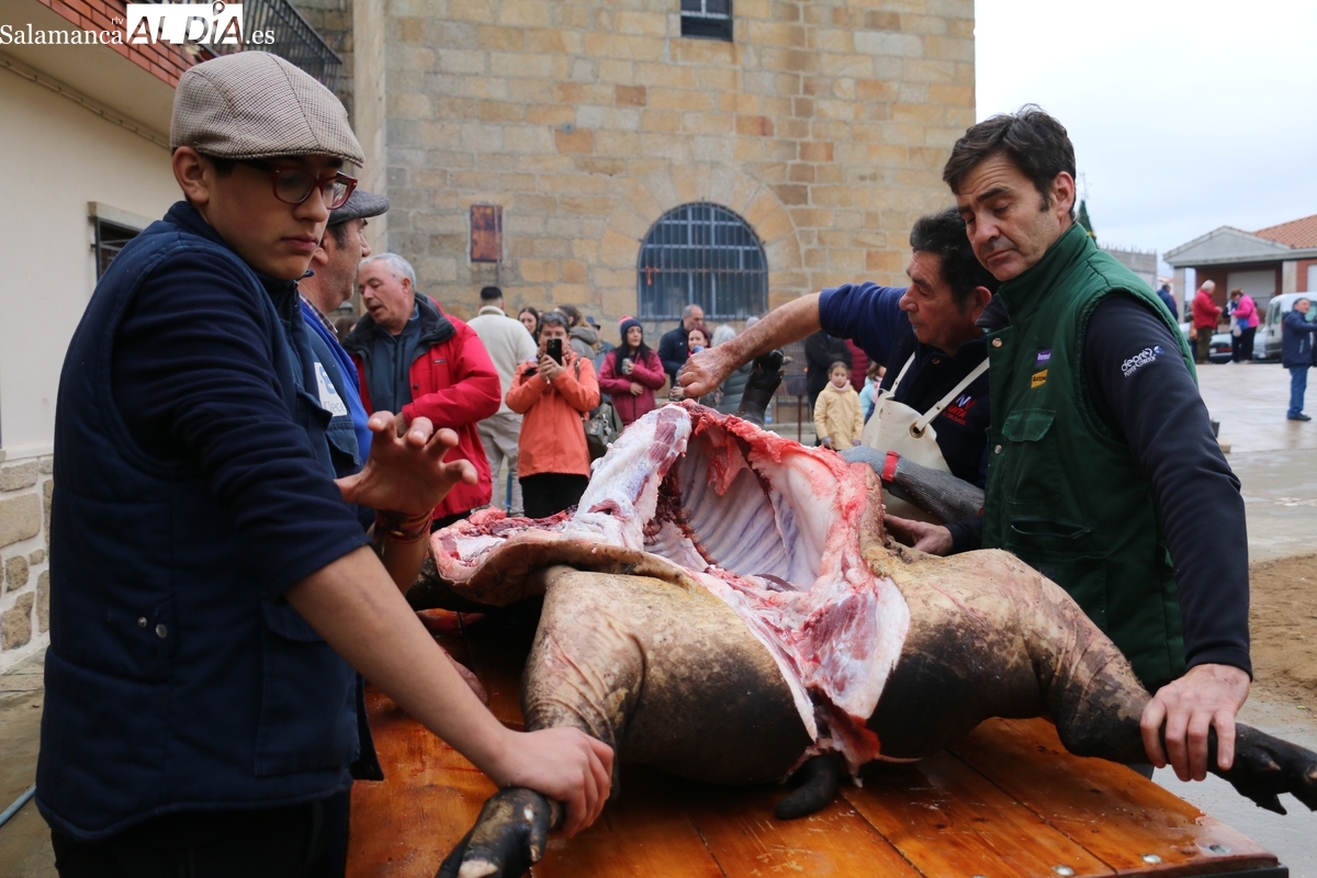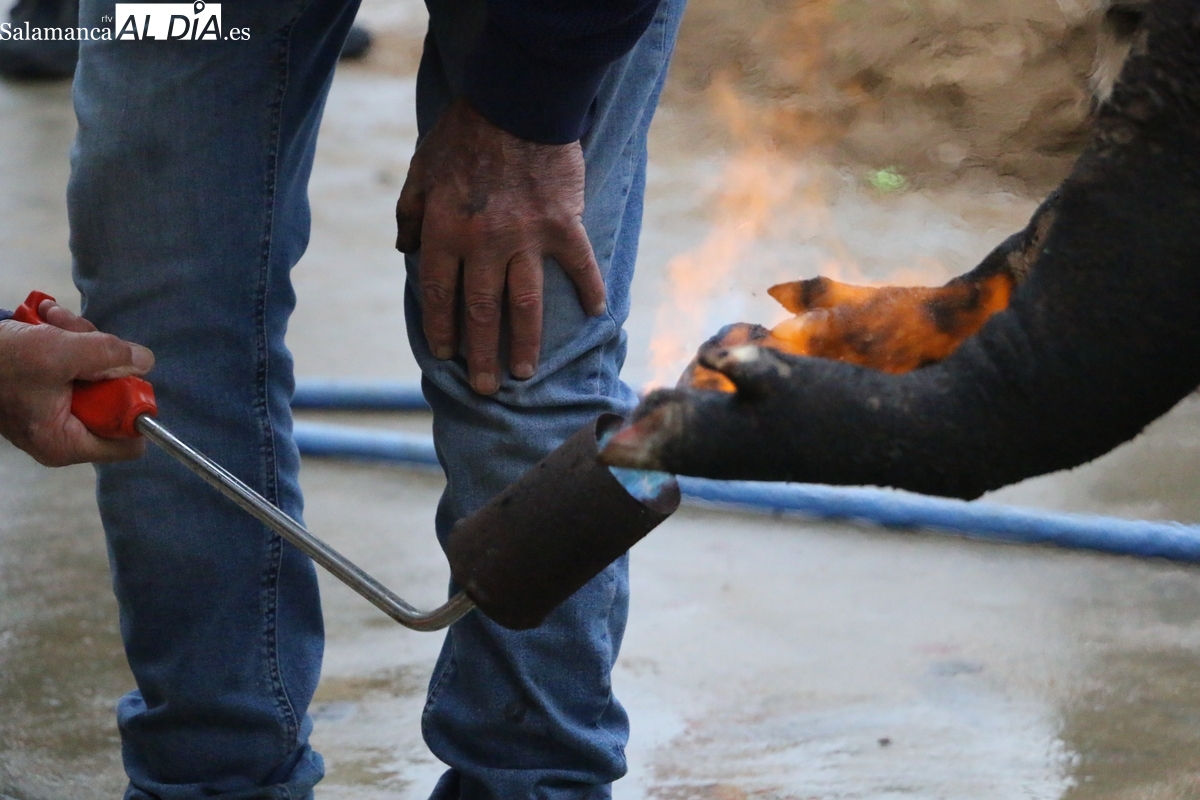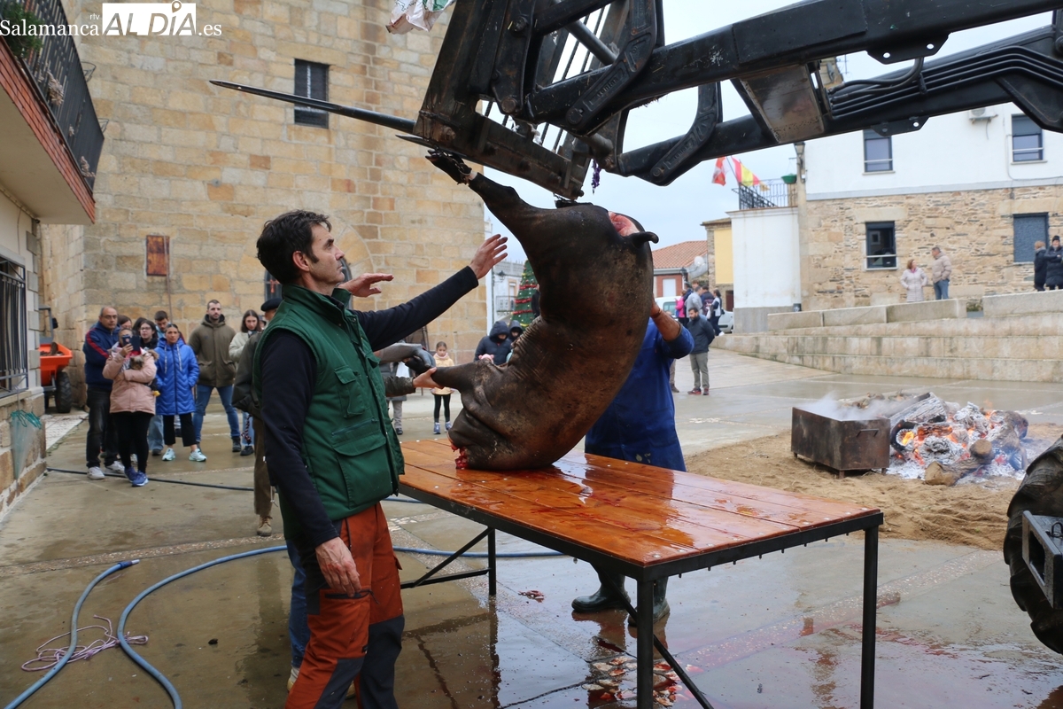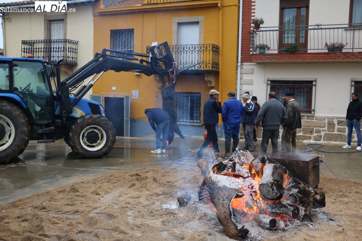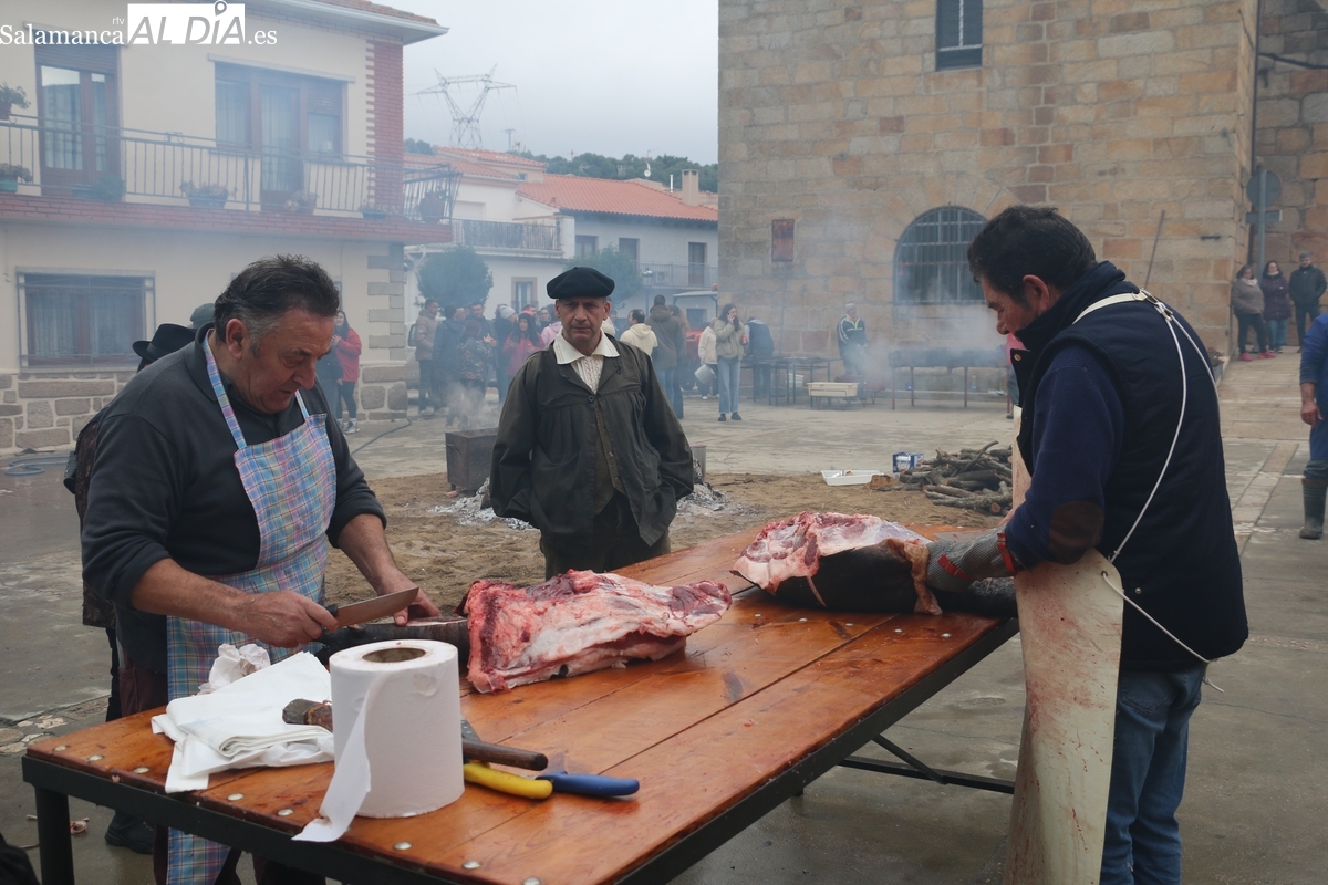 Tras el chamuscado de la marrana, de buen porte, la protagonista de la mañana era levantada por un tractor para facilitar a Paco, y a su grupo de ayudantes, el despiece del animal, carne que pasaría a sus nuevos propietarios tras la rifa. Entre tanto, el grupo de mujeres procedía a la preparación de la comida y a la venta de papeletas para la rifa de distintas piezas del cerdo.
