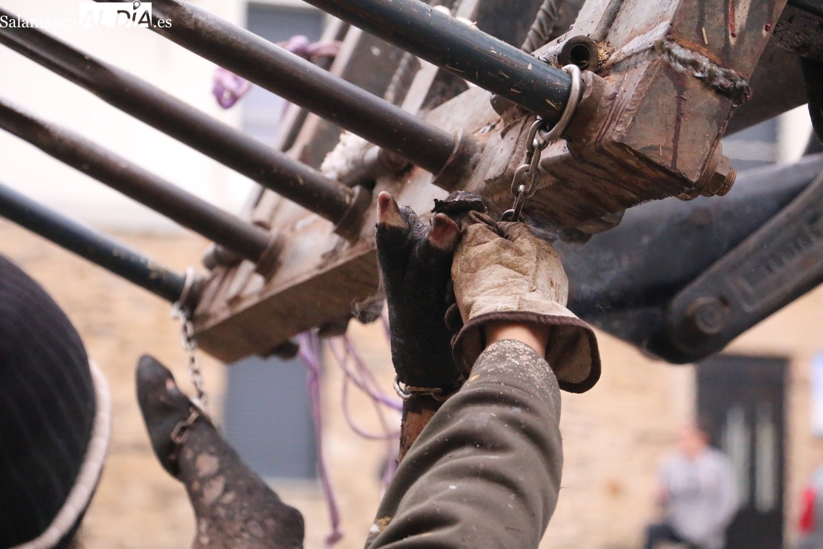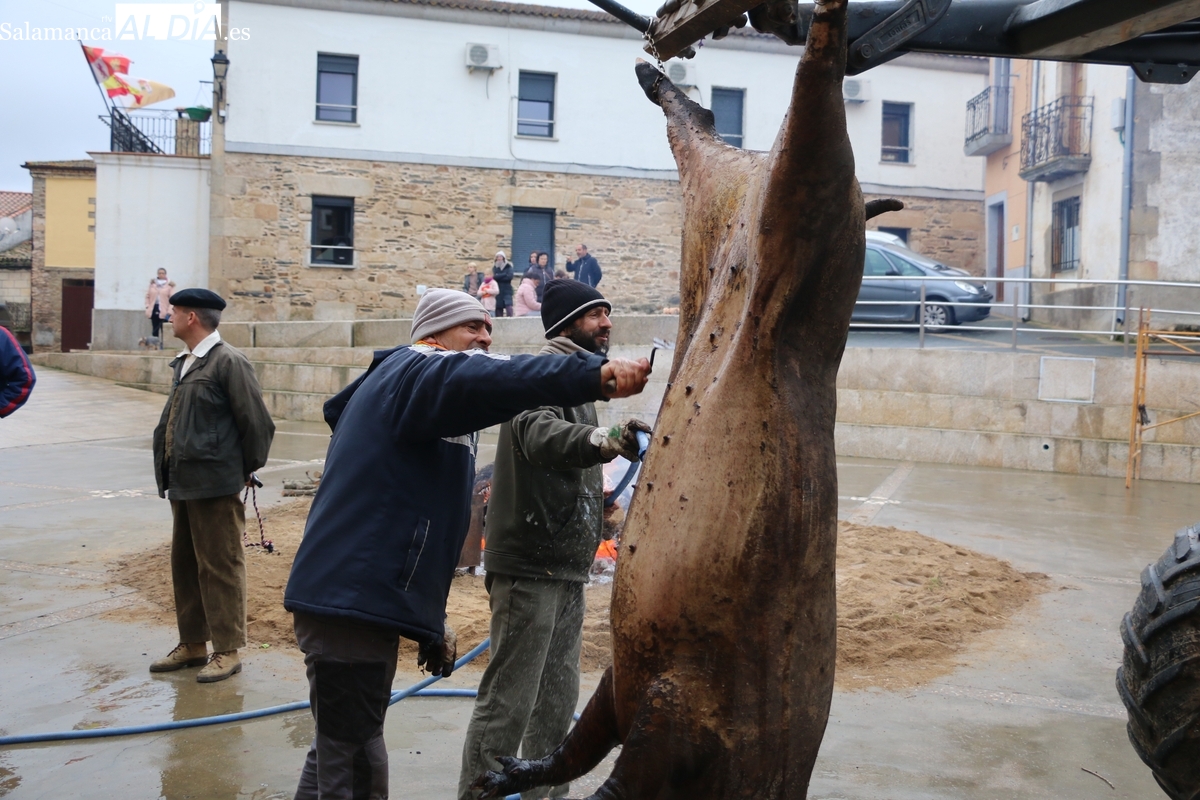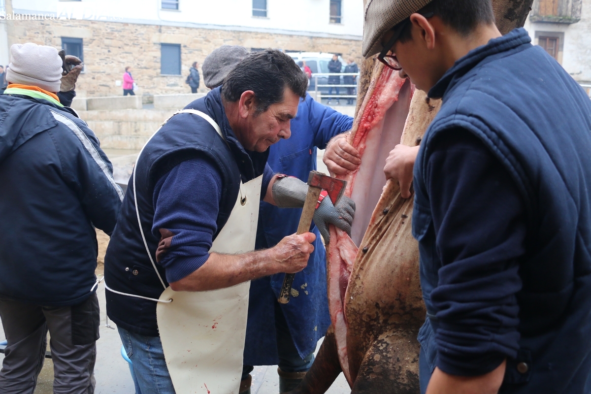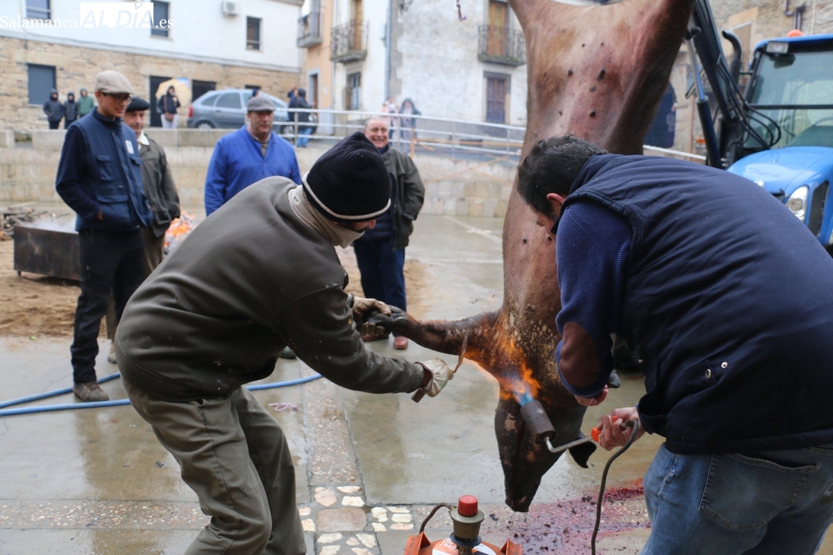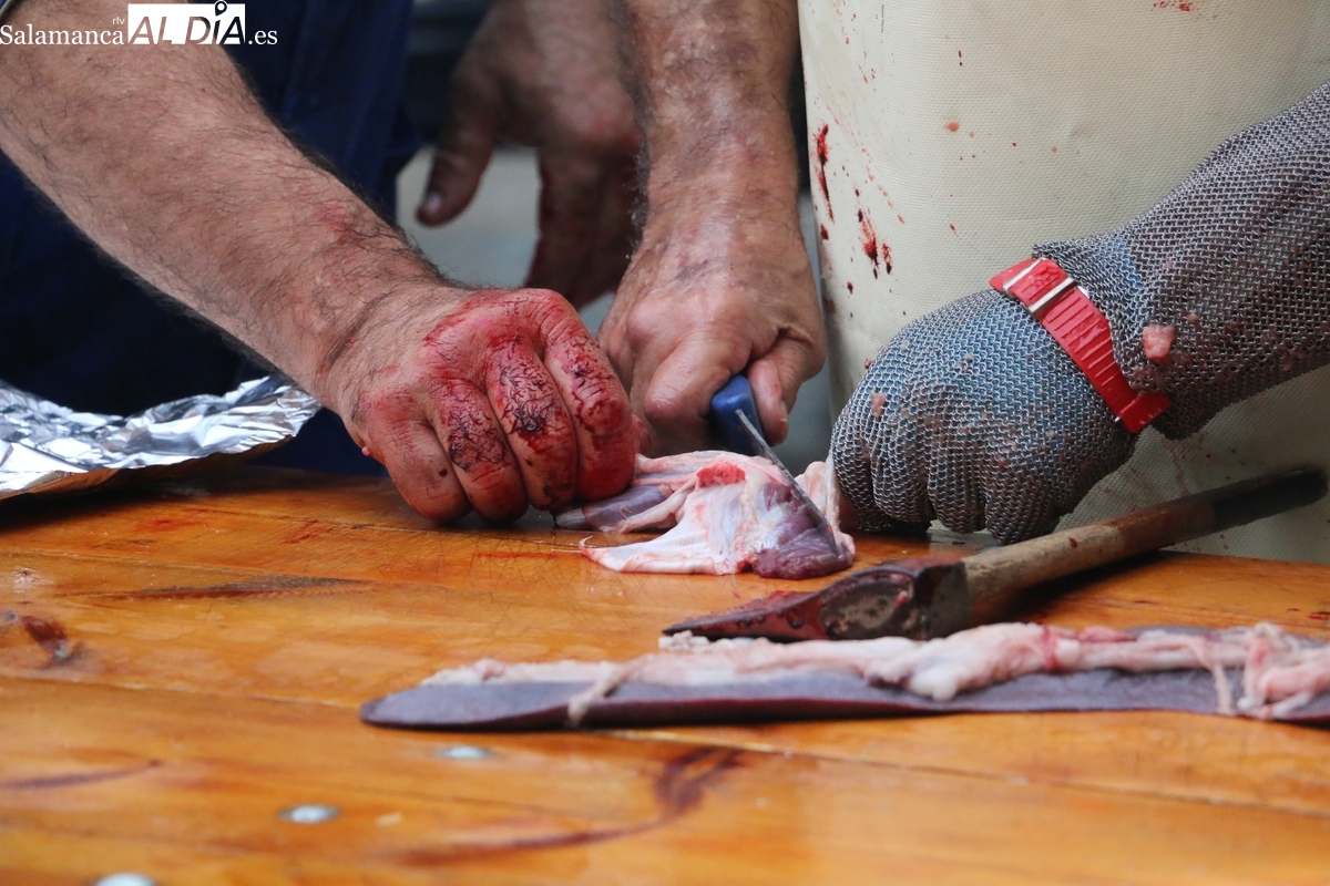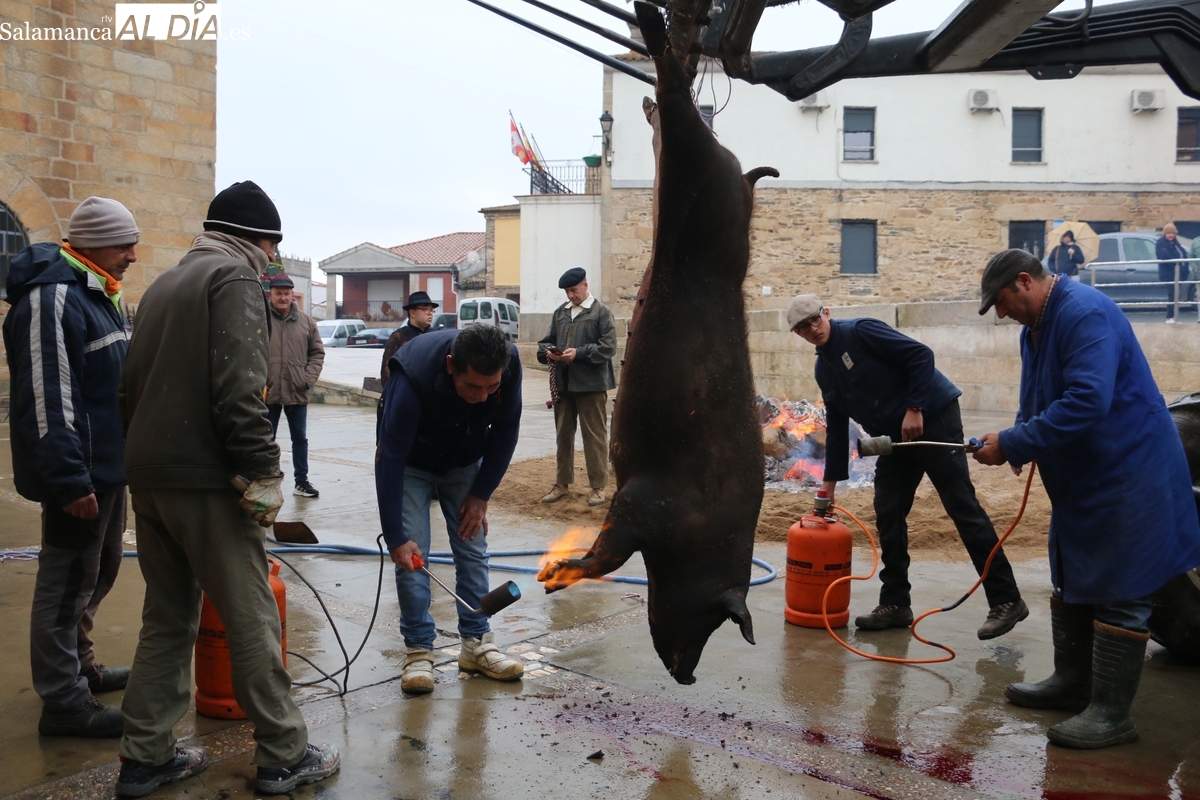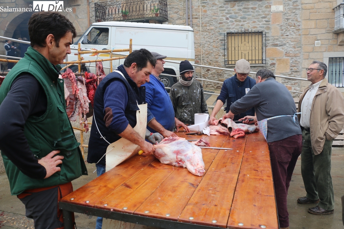 Tras el chamuscado de la marrana, de buen porte, la protagonista de la mañana era levantada por un tractor para facilitar a Paco, y a su grupo de ayudantes, el despiece del animal, carne que pasaría a sus nuevos propietarios tras la rifa. Entre tanto, el grupo de mujeres procedía a la preparación de la comida y a la venta de papeletas para la rifa de distintas piezas del cerdo.