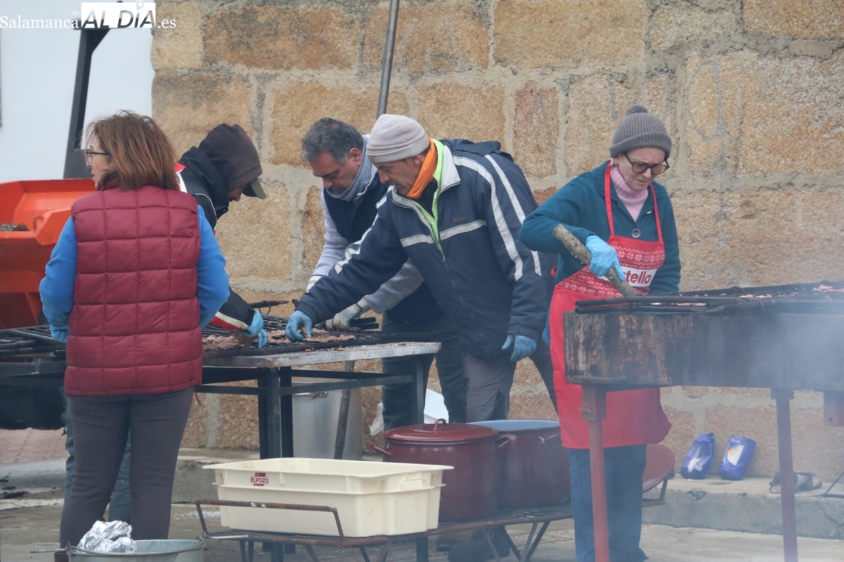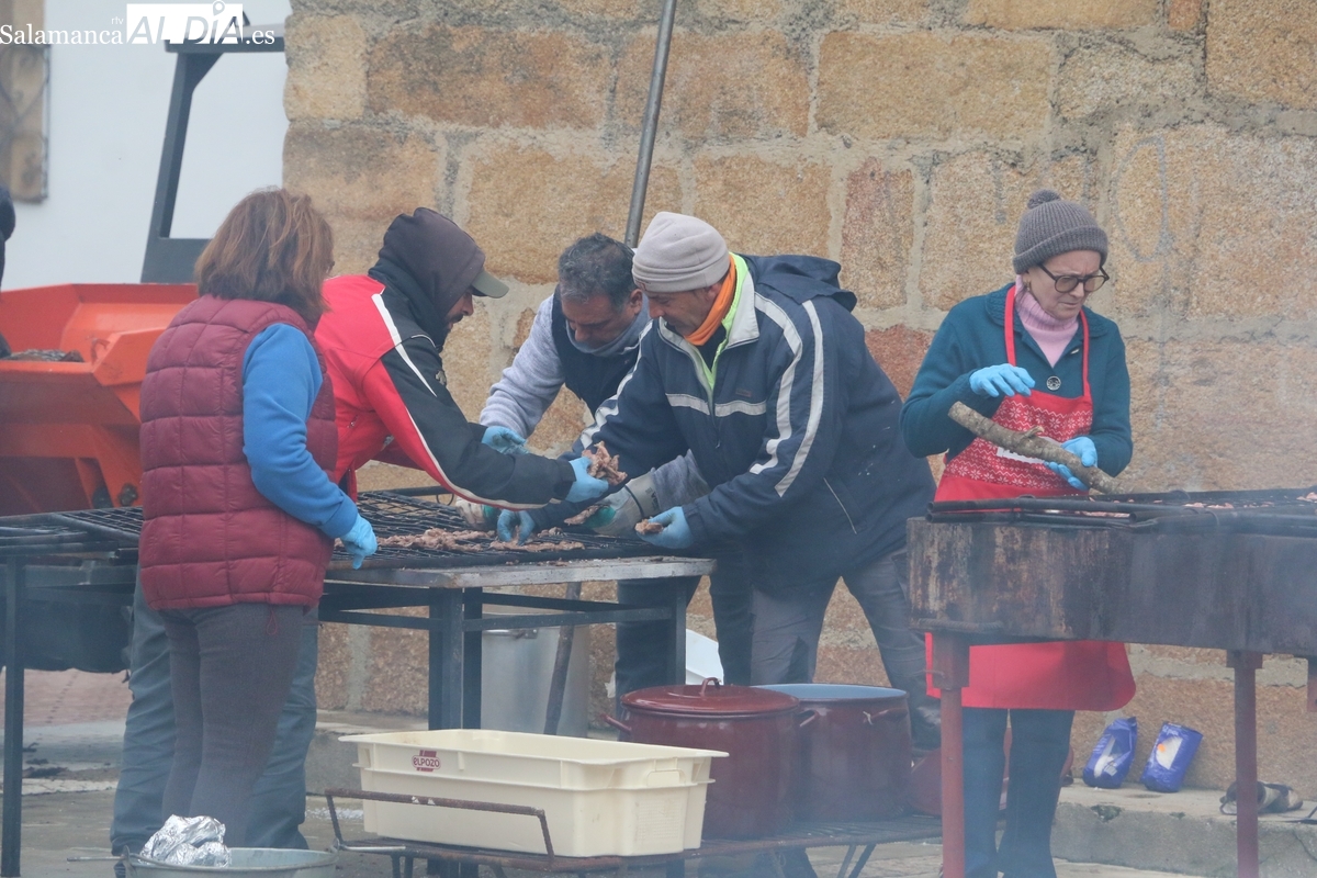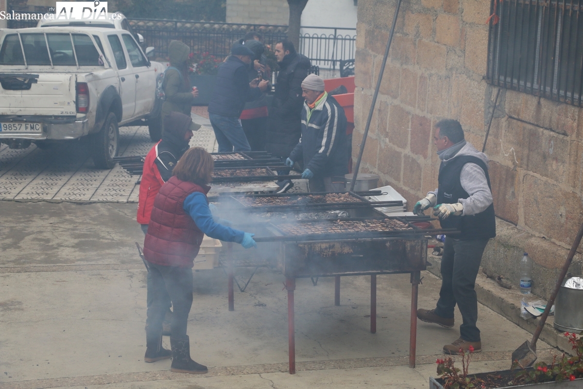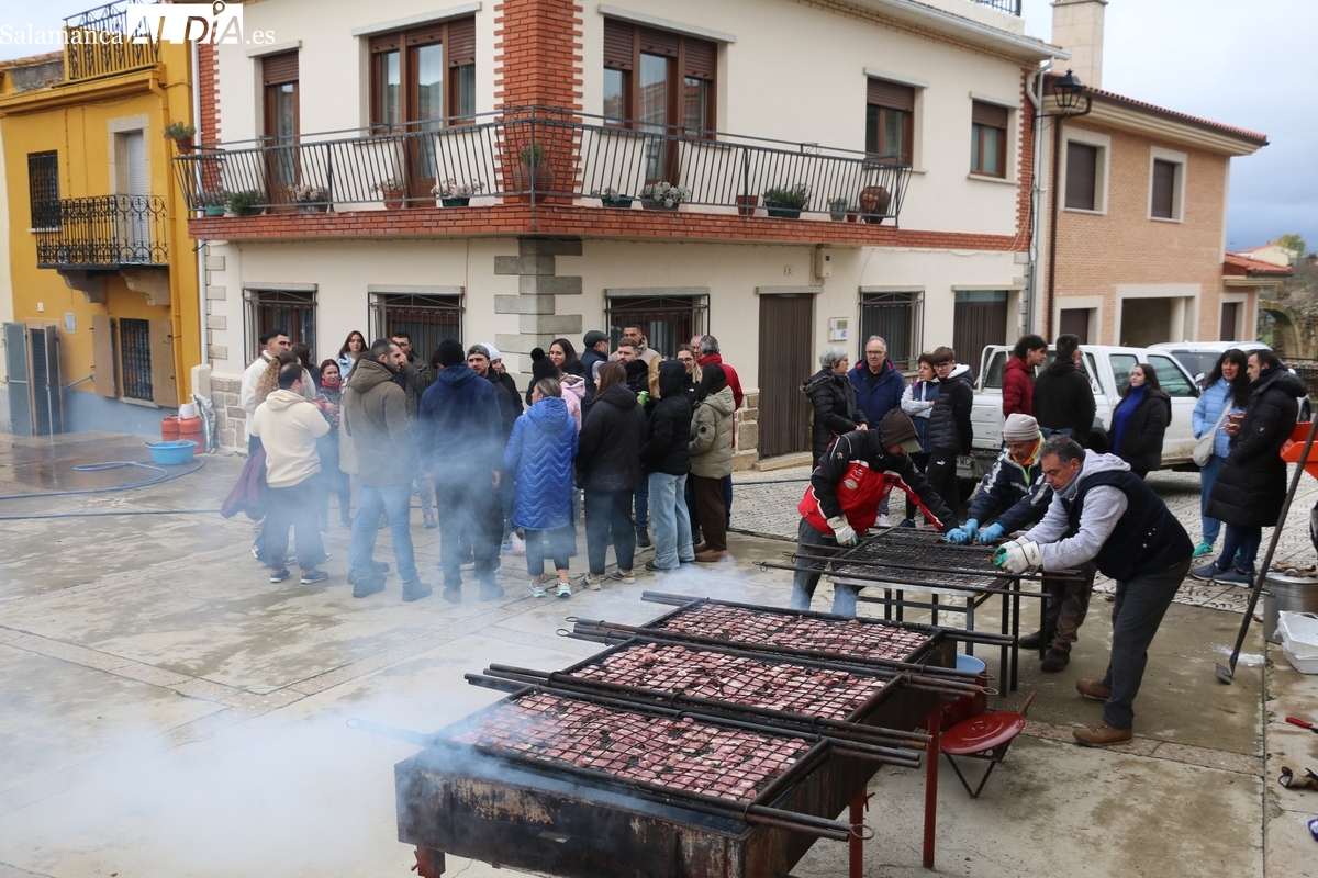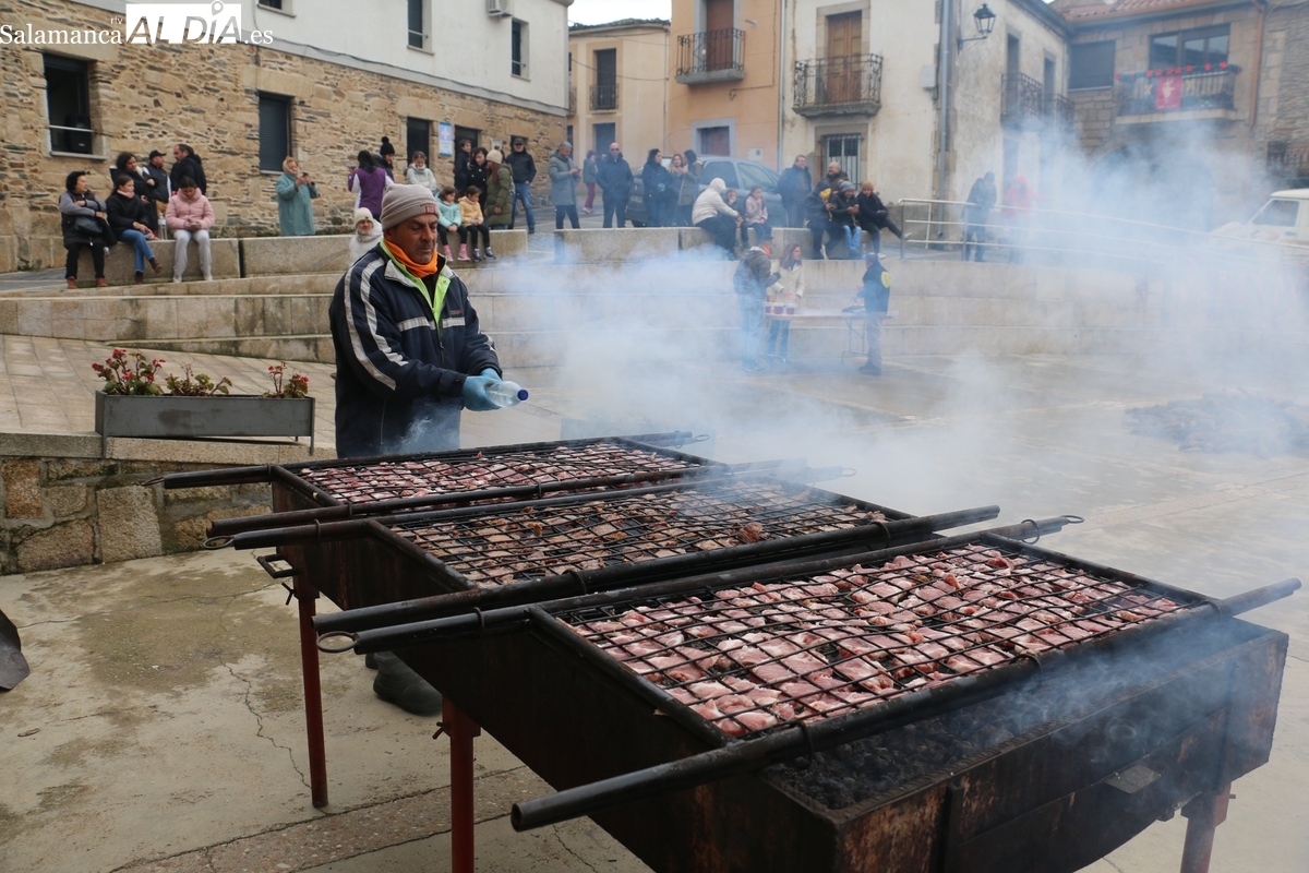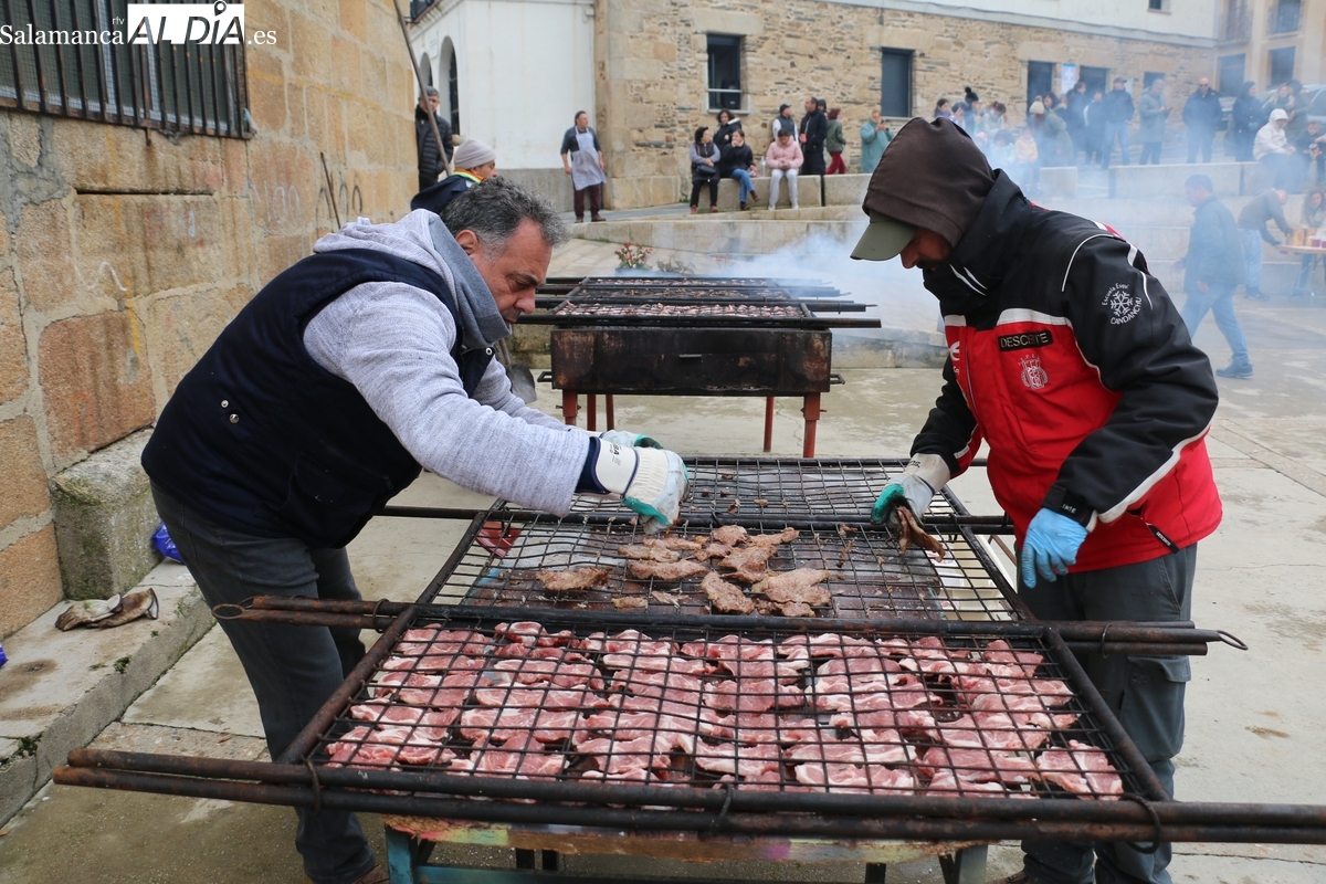 A las brasas de dos grandes barbacoas se asaban panceta, lomo y tocino, que con chichas, empanadas y hornazos compondrían el menú, y todo bajo los sones de la gaita y el tamboril de Diego Rengel y animado por un maestro de ceremonias de la Diputación de Salamanca, pues cabe recordar que la matanza de Saucelle se incluye en el circuito provincial de Matanzas que promueve la institución provincial.