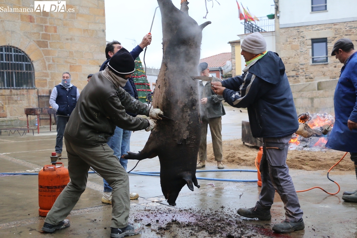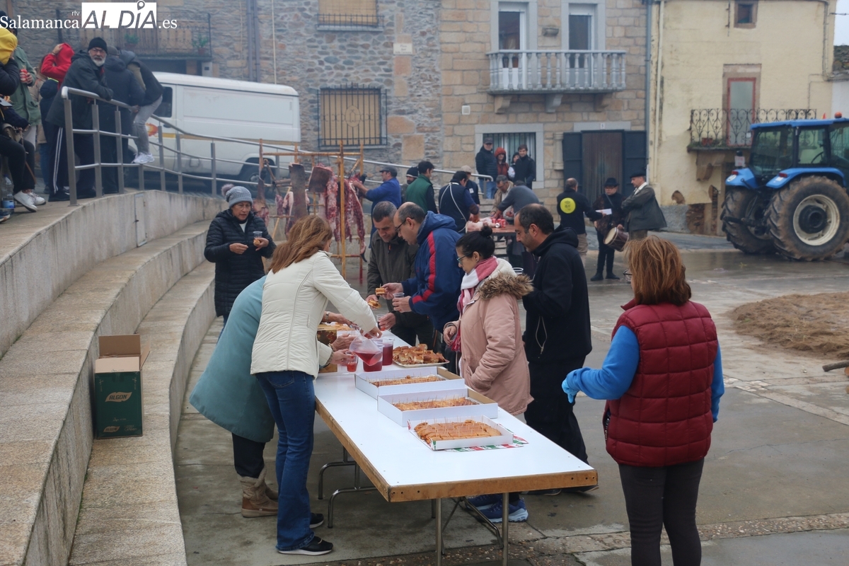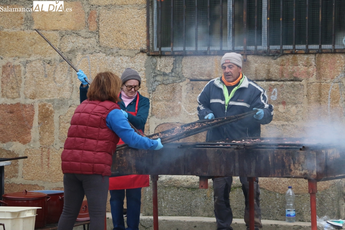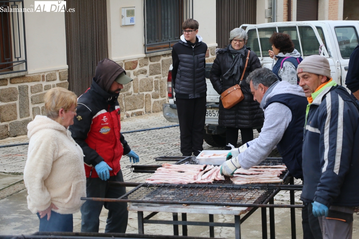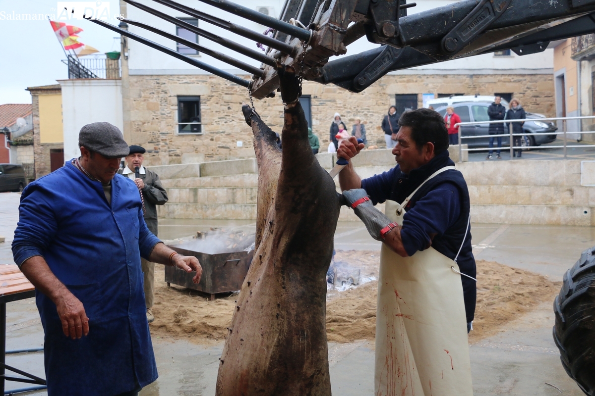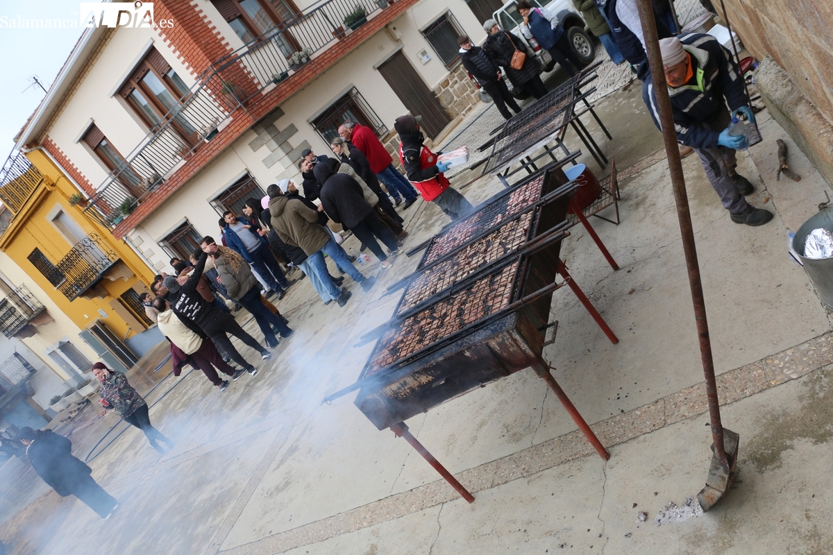 A las brasas de dos grandes barbacoas se asaban panceta, lomo y tocino, que con chichas, empanadas y hornazos compondrían el menú, y todo bajo los sones de la gaita y el tamboril de Diego Rengel y animado por un maestro de ceremonias de la Diputación de Salamanca, pues cabe recordar que la matanza de Saucelle se incluye en el circuito provincial de Matanzas que promueve la institución provincial.