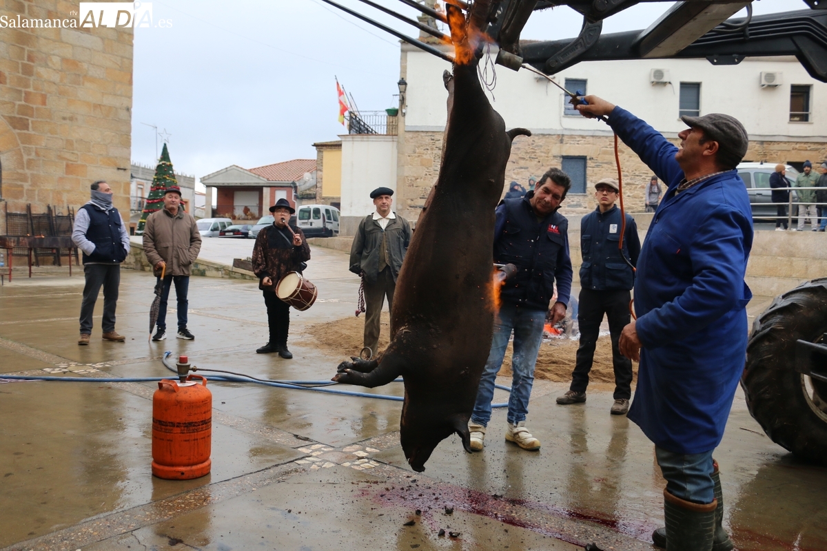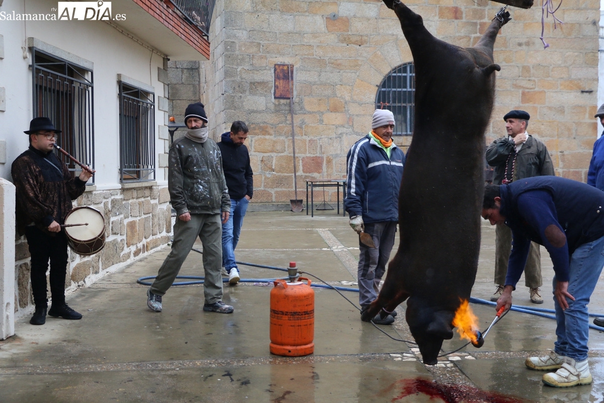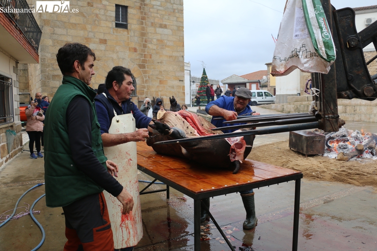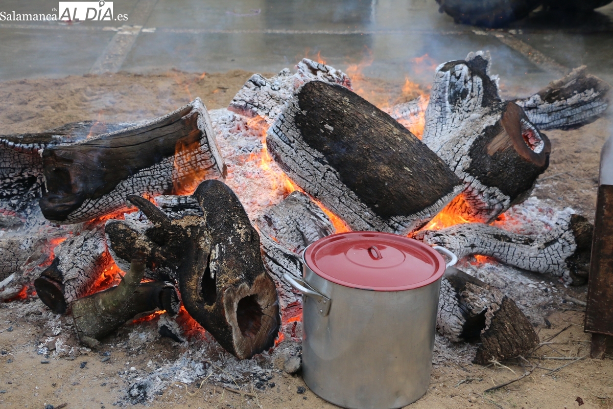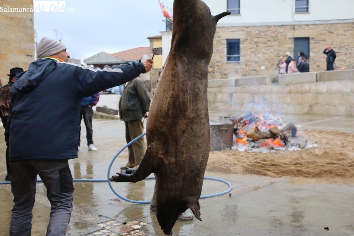 A las brasas de dos grandes barbacoas se asaban panceta, lomo y tocino, que con chichas, empanadas y hornazos compondrían el menú, y todo bajo los sones de la gaita y el tamboril de Diego Rengel y animado por un maestro de ceremonias de la Diputación de Salamanca, pues cabe recordar que la matanza de Saucelle se incluye en el circuito provincial de Matanzas que promueve la institución provincial.