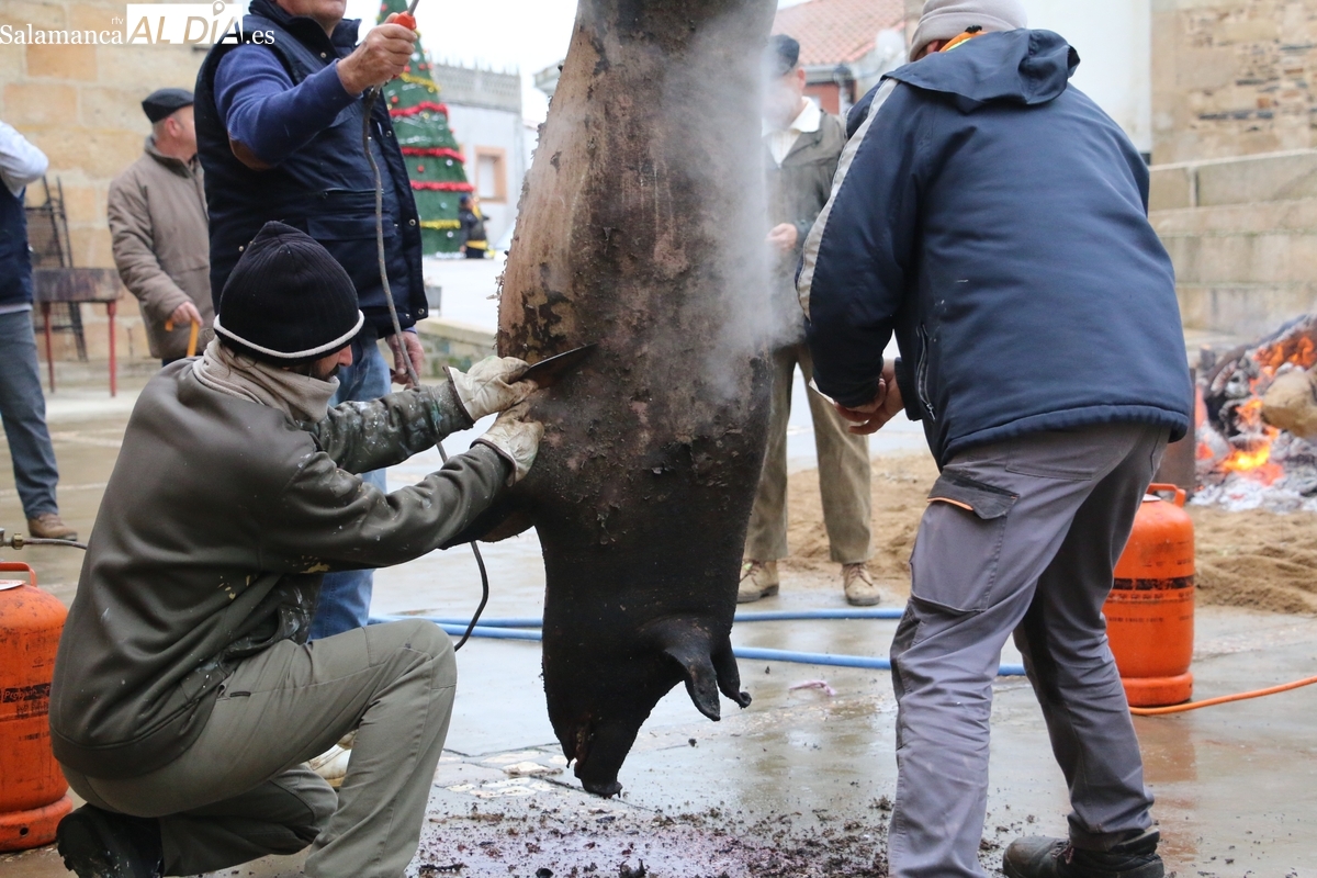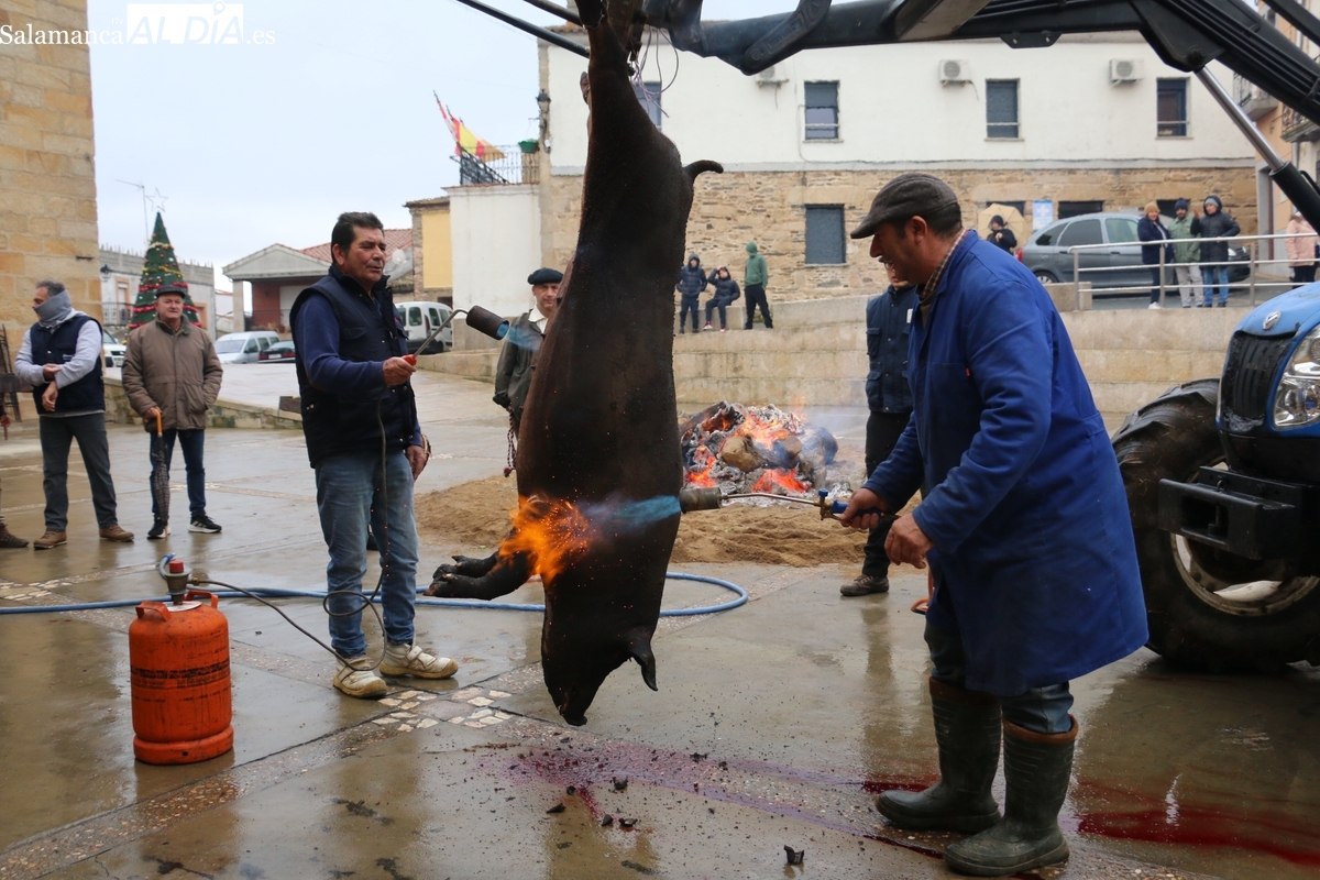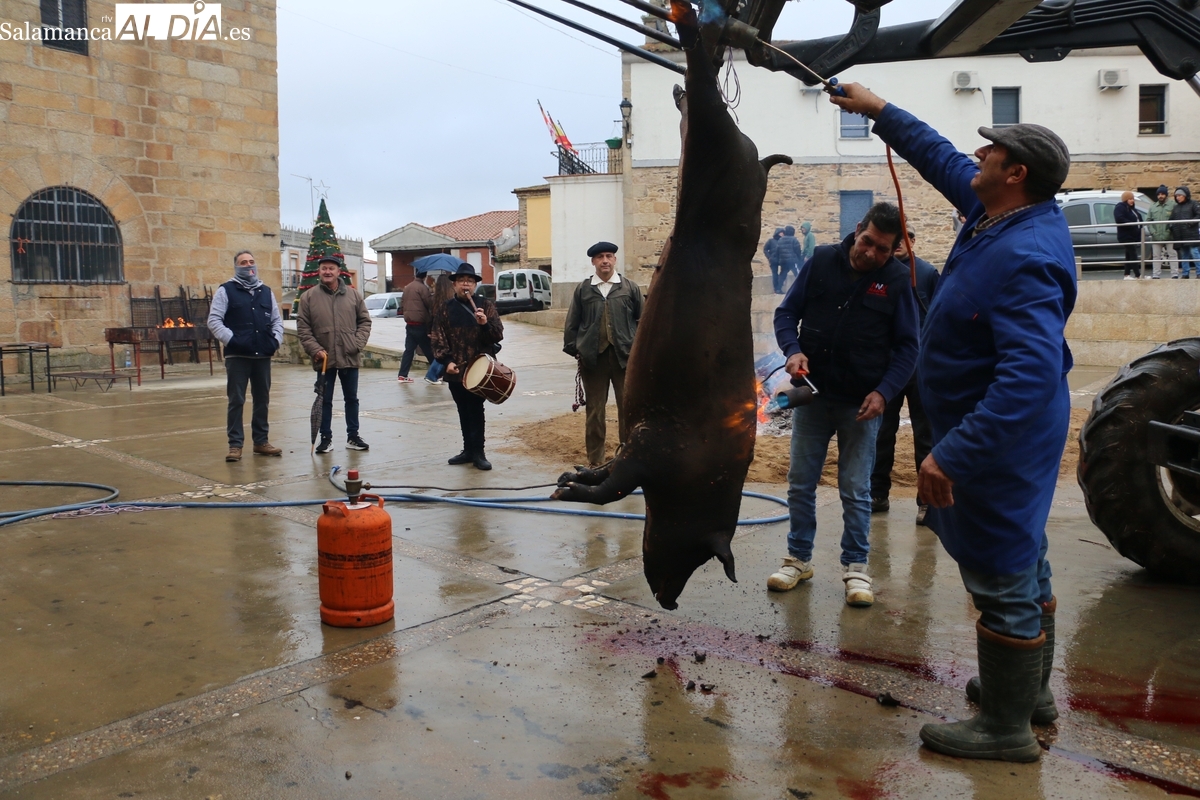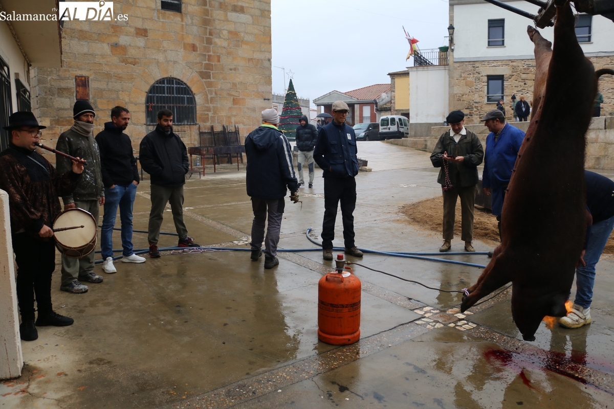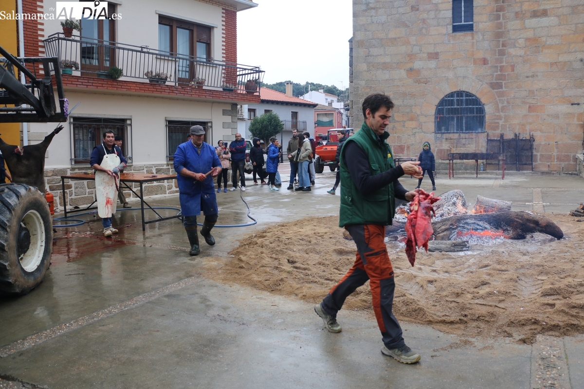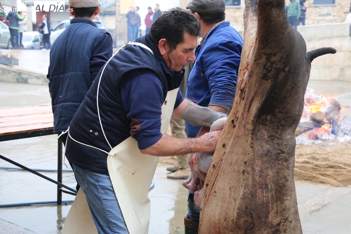 A las brasas de dos grandes barbacoas se asaban panceta, lomo y tocino, que con chichas, empanadas y hornazos compondrían el menú, y todo bajo los sones de la gaita y el tamboril de Diego Rengel y animado por un maestro de ceremonias de la Diputación de Salamanca, pues cabe recordar que la matanza de Saucelle se incluye en el circuito provincial de Matanzas que promueve la institución provincial.